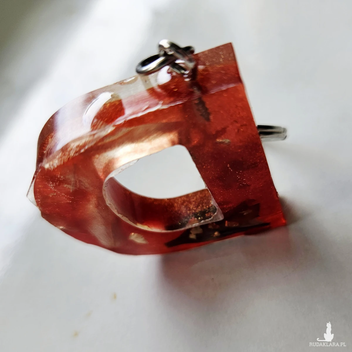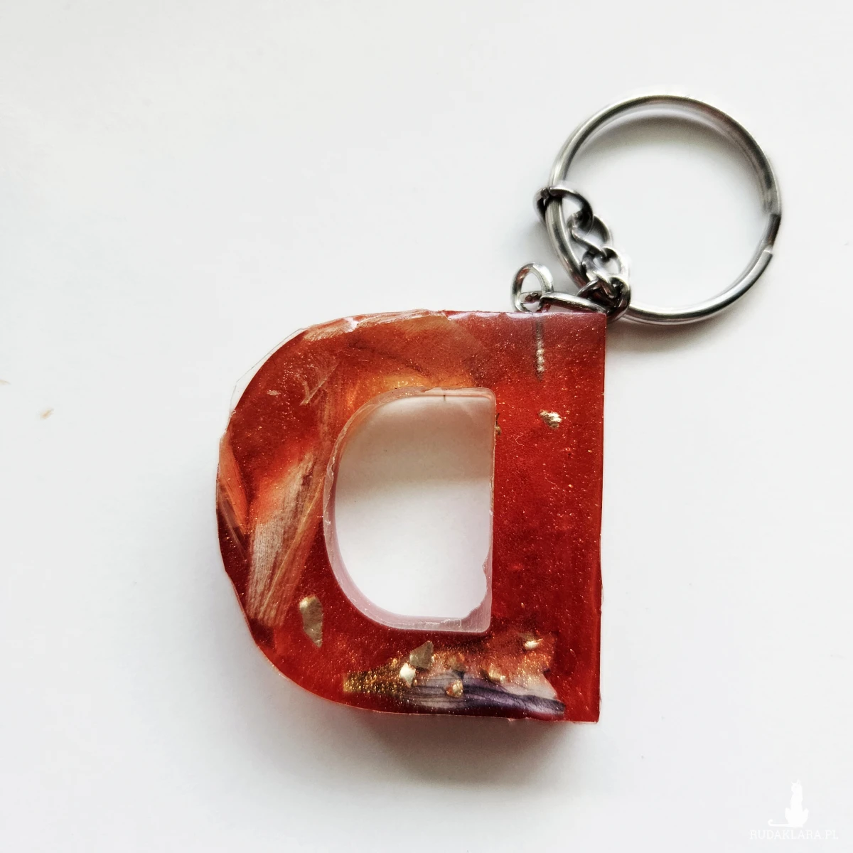 Brelok literka D z żywicy czerwona z złotem i kryształkami