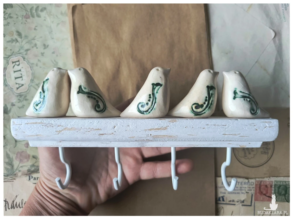 Stylizowany wieszak drewniany o długości 20 cm, z delikatnym frezem, na 4 haczyki, ozdobiony 5 ceramicznymi ptaszkami wykonanymi z gliny ceramicznej. Ptaszki wypalone zostały na biskwit, a następnie poszkliwione w 1260 stopni C. Z tytułu wygodne mocowanie w postaci zawieszek. Całość utrzymana w stylu vintage. Serdecznie polecam!!!