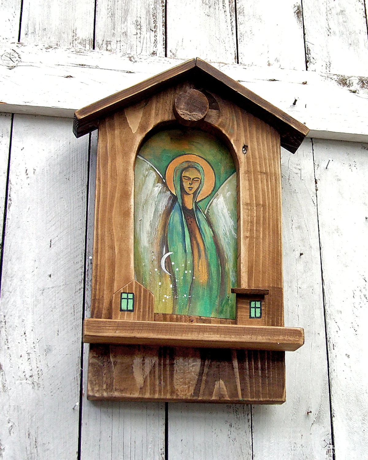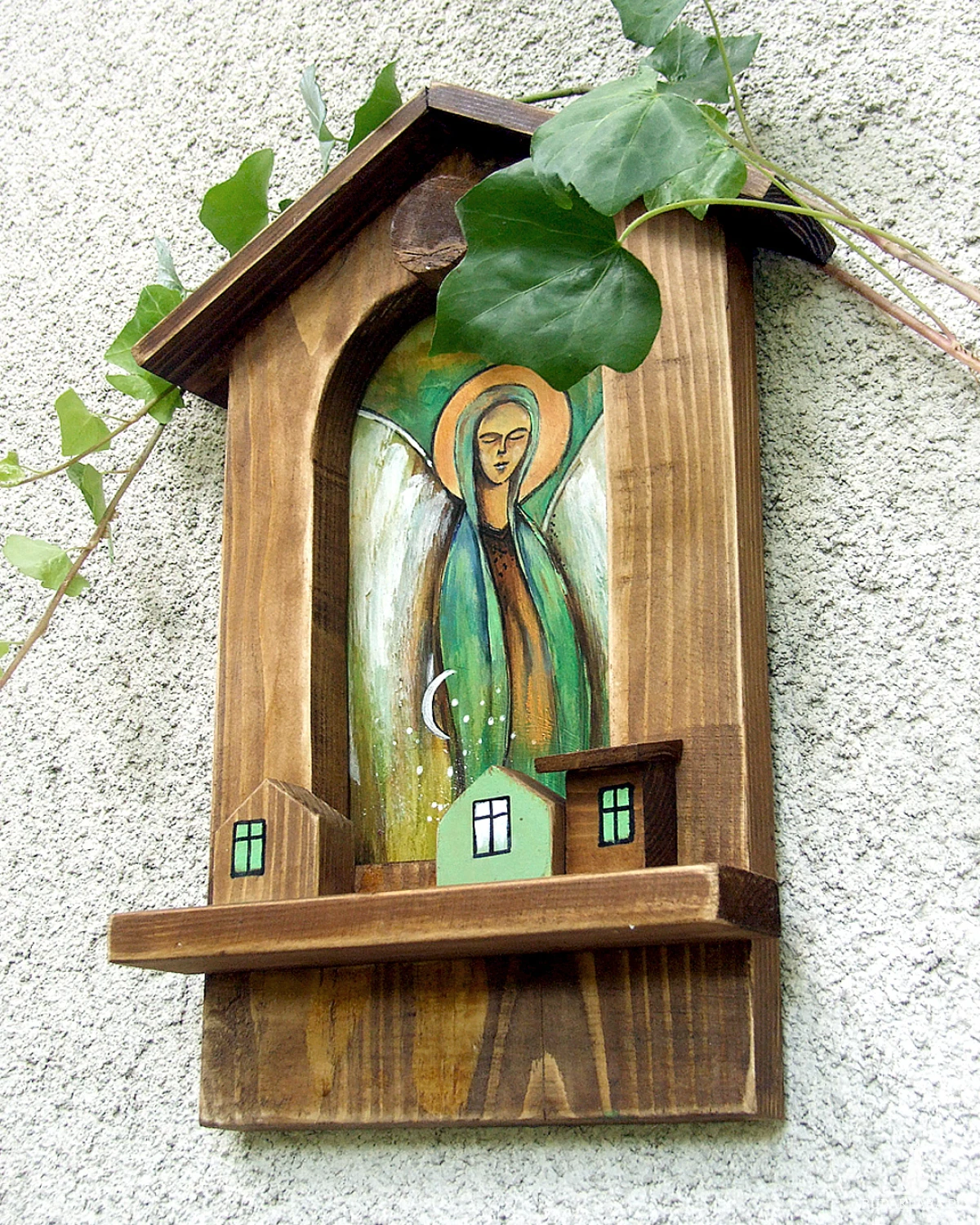 Drewniana Kapliczka - klimatyczna i pełna uroku dekoracja wnętrza. Może być także zawieszona w ogrodzie - w miejscu osłoniętym od deszczu, albo na werandzie. Taka kapliczka to także miły, oryginalny prezent do nowego domu.