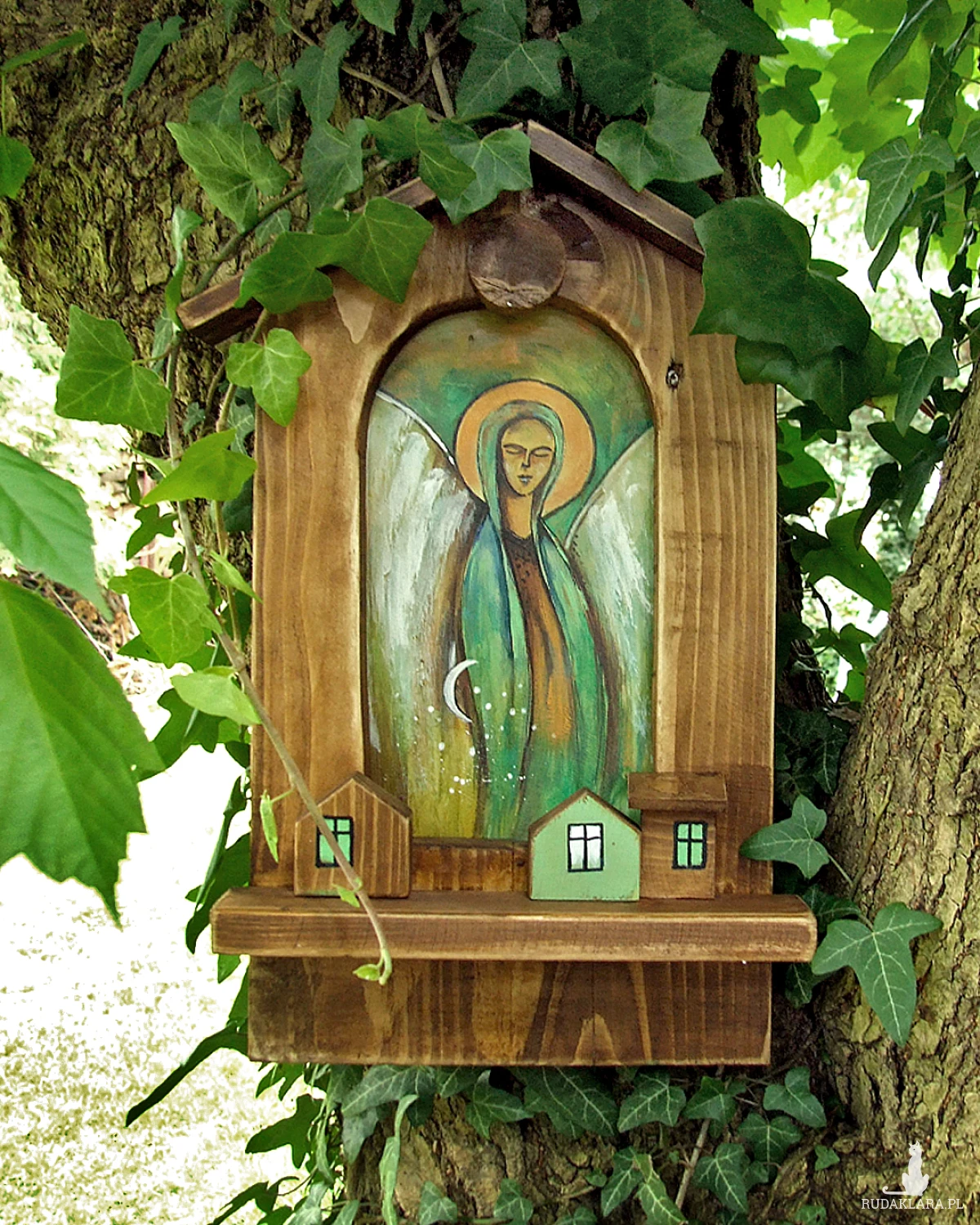Kapliczka została docięta ze starej sosnowej deski, która ma ślady wcześniejszego użytkowania (otworki po gwoździach). W desce jest wycięte jakby okienko, a w nim zamontowany jest ręcznie malowany obrazek z aniołem. Obrazek jest namalowany na cienkiej sklejce, farbami akrylowymi - cała kapliczka jest zabezpieczona matowym lakierem akrylowym, nietoksycznym i wodoodpornym.