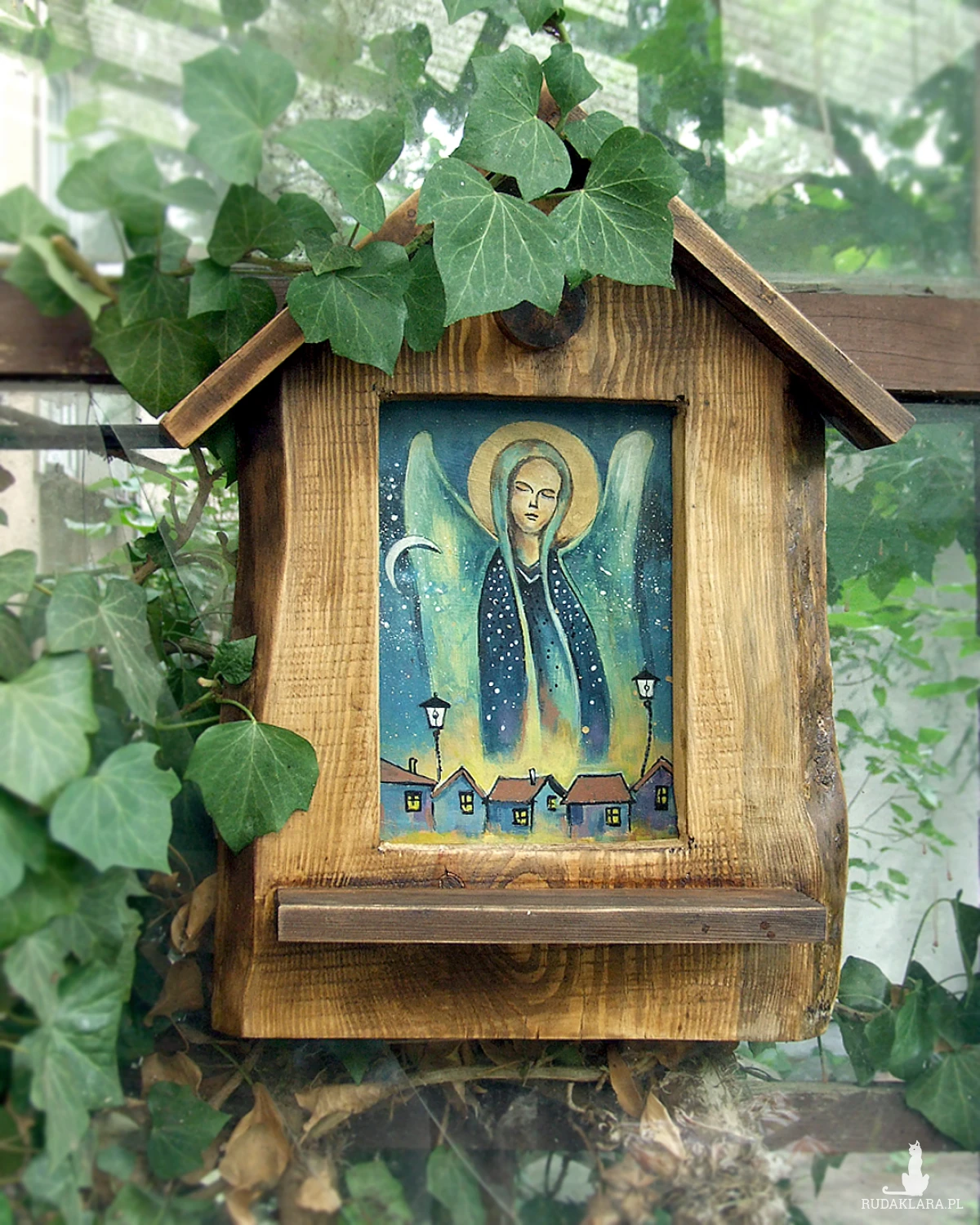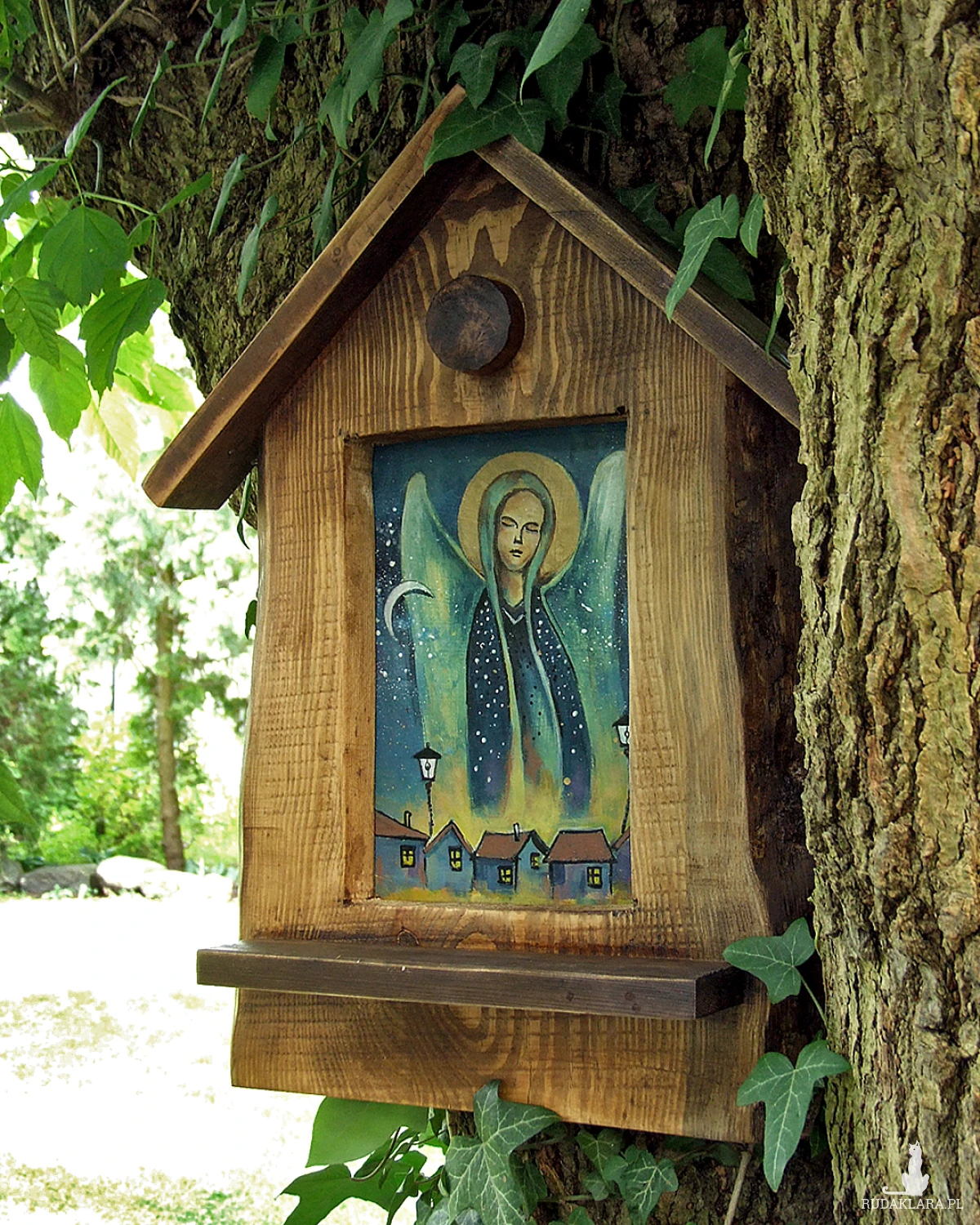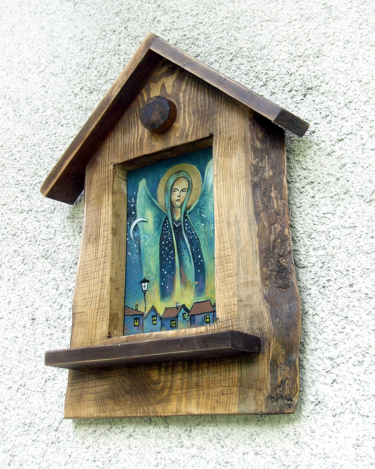 Kapliczka została docięta ze starej sosnowej deski, o nierównych krawędziach. W desce jest wycięte jakby okienko, a w nim zamontowany jest obrazek z aniołem. Obrazek ręcznie malowany na cienkiej sklejce, farbami akrylowymi - cała kapliczka jest zabezpieczona matowym lakierem akrylowym, nietoksycznym i wodoodpornym.