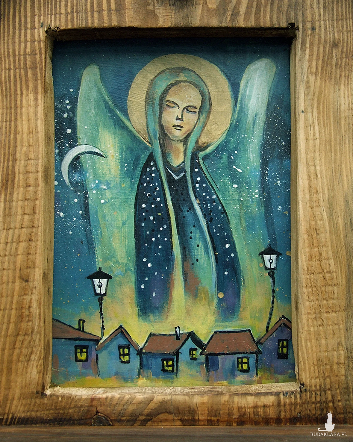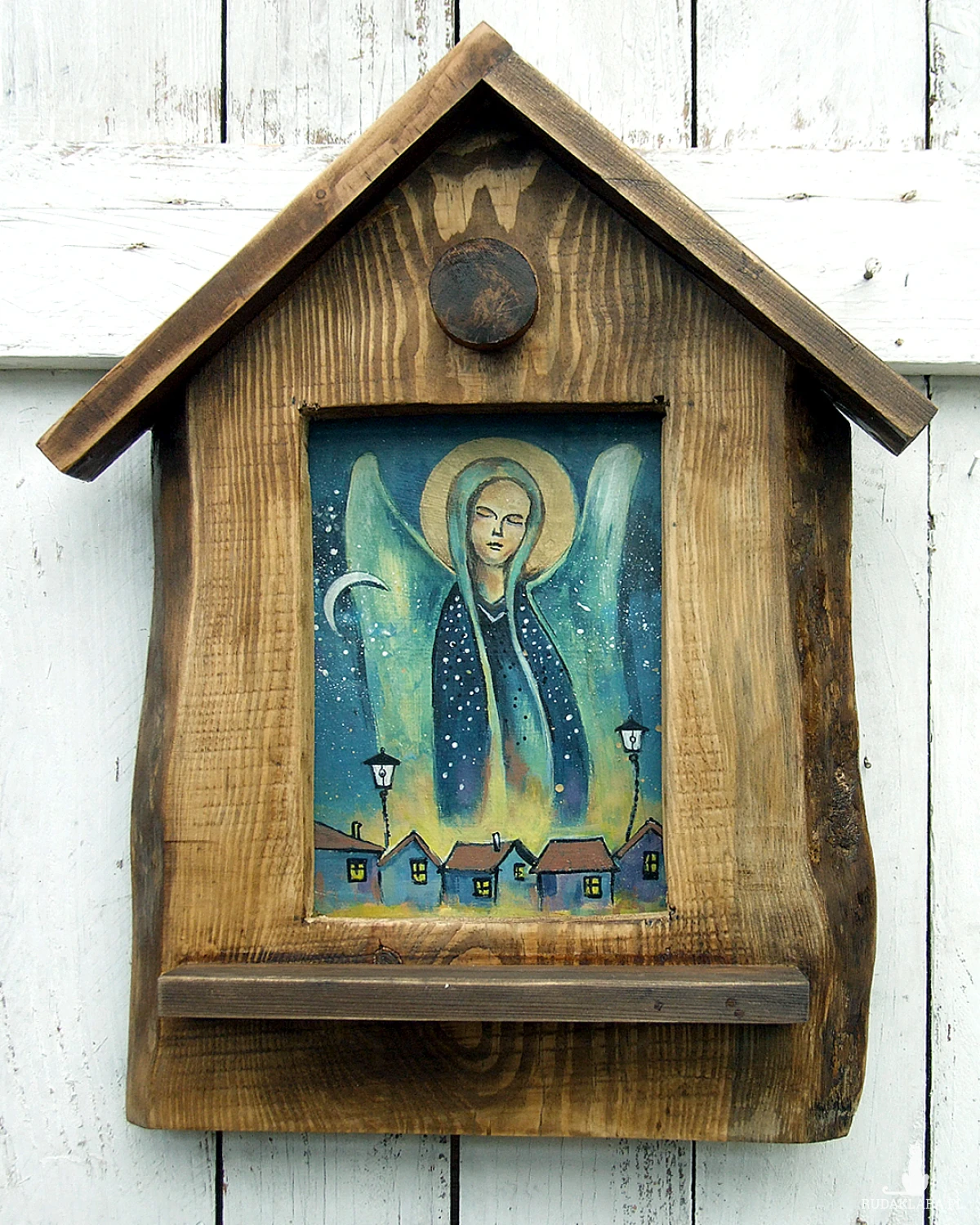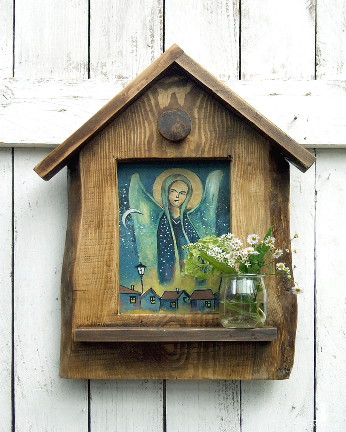 Kapliczka została docięta ze starej sosnowej deski, o nierównych krawędziach. W desce jest wycięte jakby okienko, a w nim zamontowany jest obrazek z aniołem. Obrazek ręcznie malowany na cienkiej sklejce, farbami akrylowymi - cała kapliczka jest zabezpieczona matowym lakierem akrylowym, nietoksycznym i wodoodpornym.