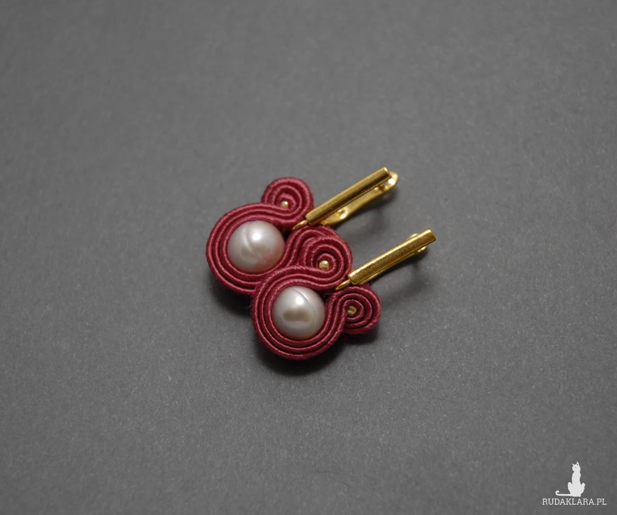 oferuję małe bordowe kolczyki zrobione techniką sutasz, ozdobione perłami seashell (w różowym odcieniu)