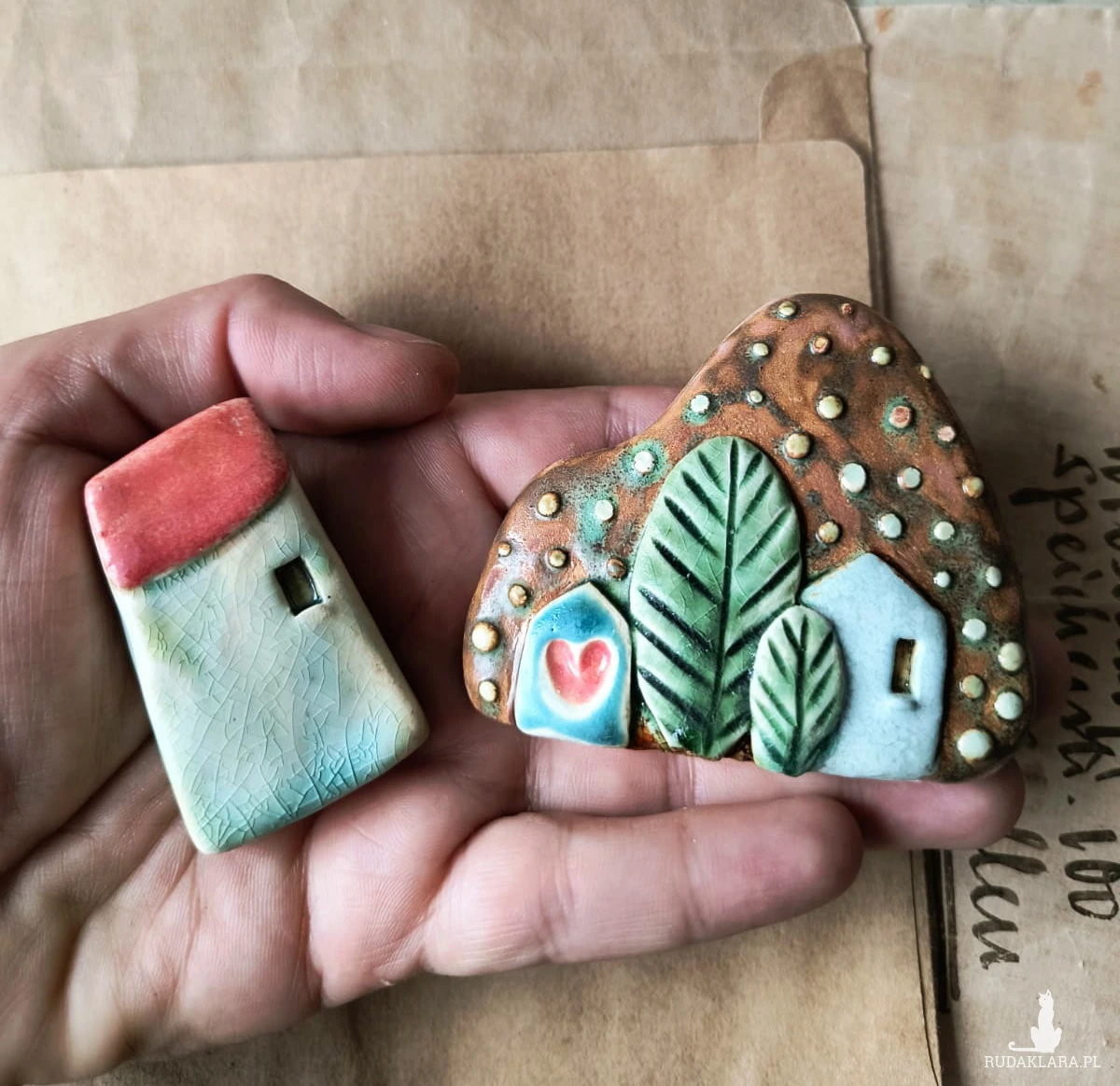 Zestaw 2 domków wykonanych z gliny szamotowej wypalonych na biskwit, a następnie szkliwionych w temperaturze ok 1260 stopni C. Wysokość od 4 do 5 cm. W wesołych kolorach. idealne do postawienia na półeczce. Serdecznie polecam! Domki również do kupienia osobno.