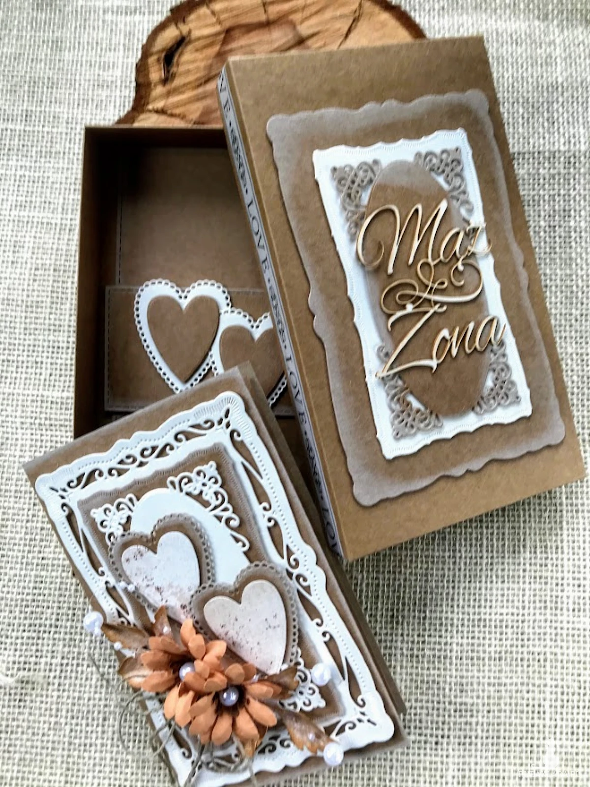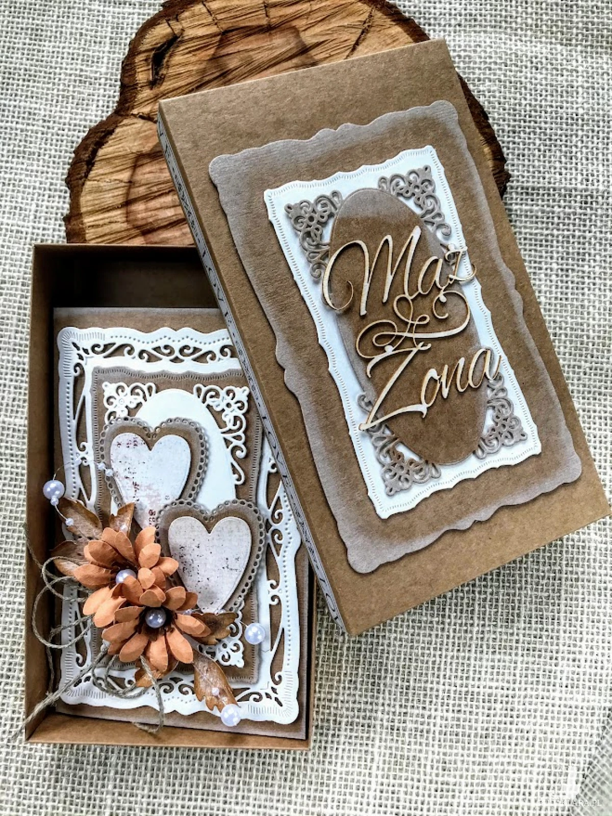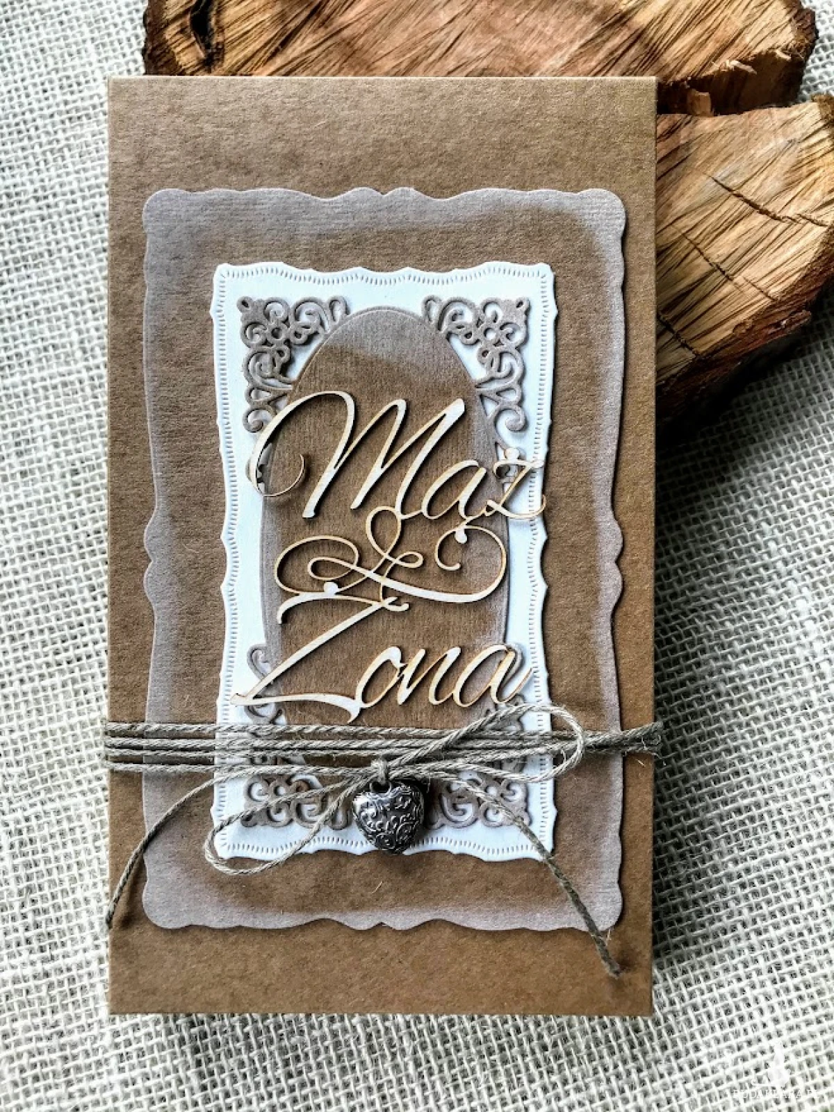 Kartka z okazji Ślubu wykonana ręcznie z niezwykłą starannością i dbałością o każdy detal. Na bazie z papieru kraftowego, w naturalnej kremowo-perłowej i kraftowej kolorystyce z kwiatami ręcznie robionymi z papieru czerpanego. Rozmiar ok 16,0 x 10,5 cm. Wewnątrz kartki znajduje się karnet na życzenia a na dnie pudełka kieszonka na małe co nieco lub kupon lotto. W komplecie pudełko z papieru kraftowego (rozmiar 19,5 x 11,5 cm x 2,5 cm) ozdobione w tej samej stylizacji co kartka przewiązane sznurkiem z przywieszką sercem. W tej postaci komplet dostępny od ręki.