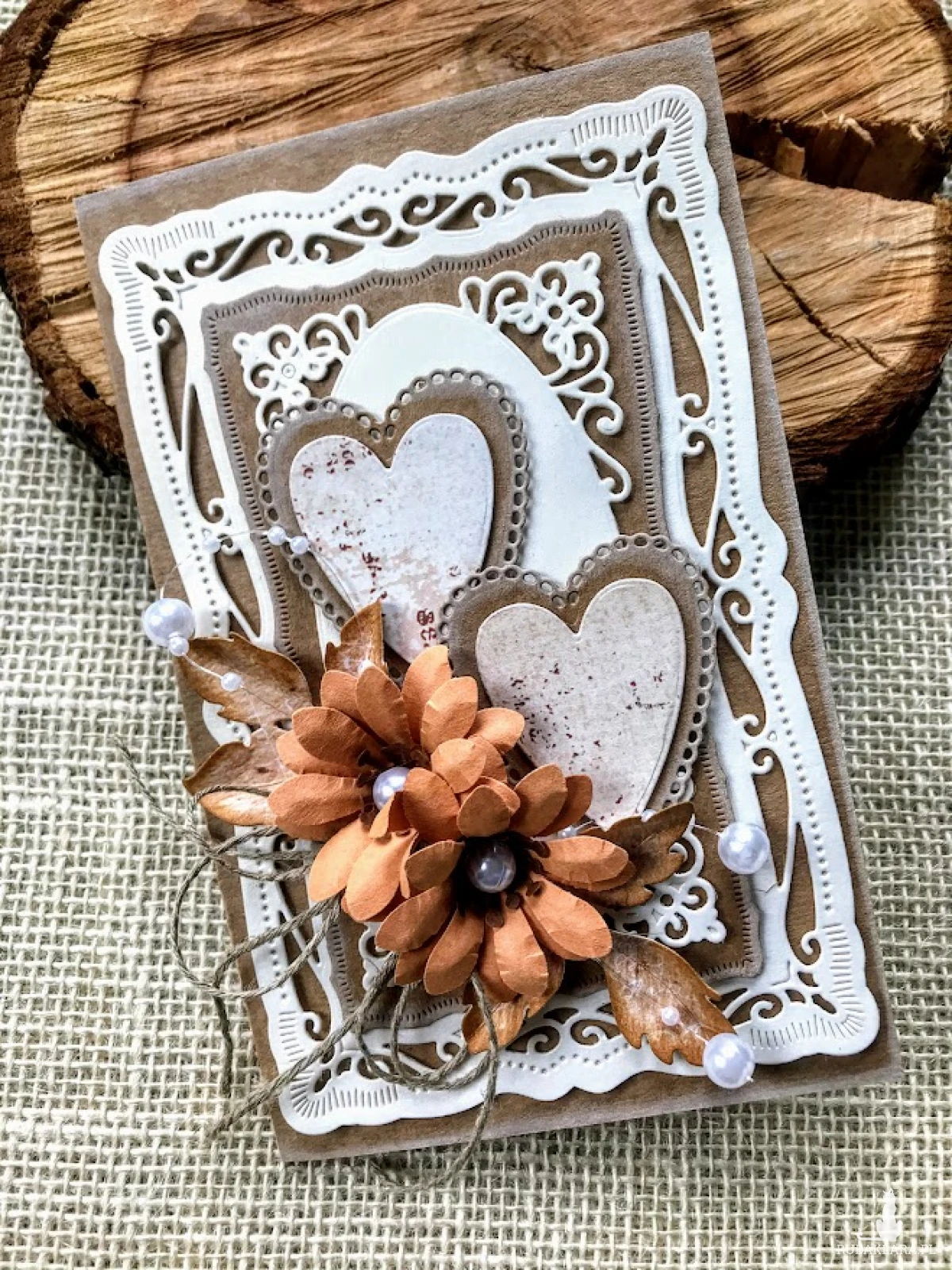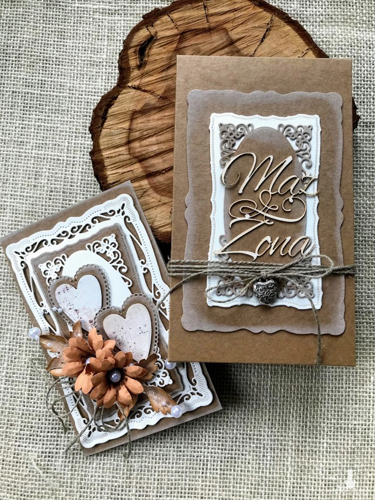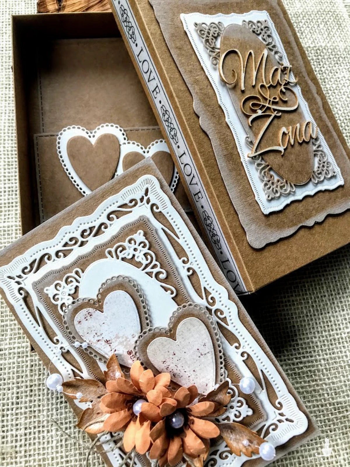 Kartka z okazji Ślubu wykonana ręcznie z niezwykłą starannością i dbałością o każdy detal. Na bazie z papieru kraftowego, w naturalnej kremowo-perłowej i kraftowej kolorystyce z kwiatami ręcznie robionymi z papieru czerpanego. Rozmiar ok 16,0 x 10,5 cm. Wewnątrz kartki znajduje się karnet na życzenia a na dnie pudełka kieszonka na małe co nieco lub kupon lotto. W komplecie pudełko z papieru kraftowego (rozmiar 19,5 x 11,5 cm x 2,5 cm) ozdobione w tej samej stylizacji co kartka przewiązane sznurkiem z przywieszką sercem. W tej postaci komplet dostępny od ręki.