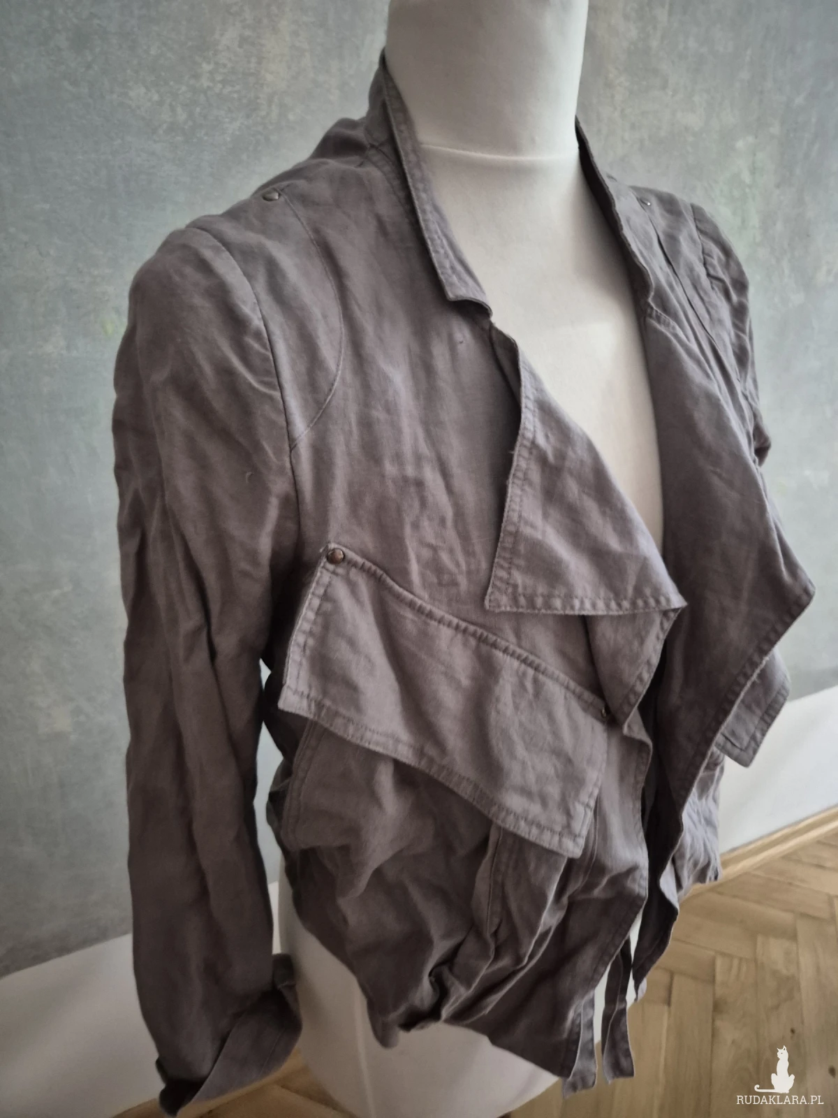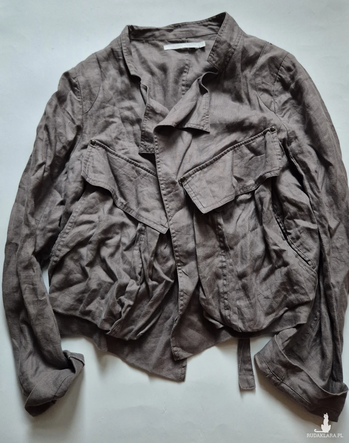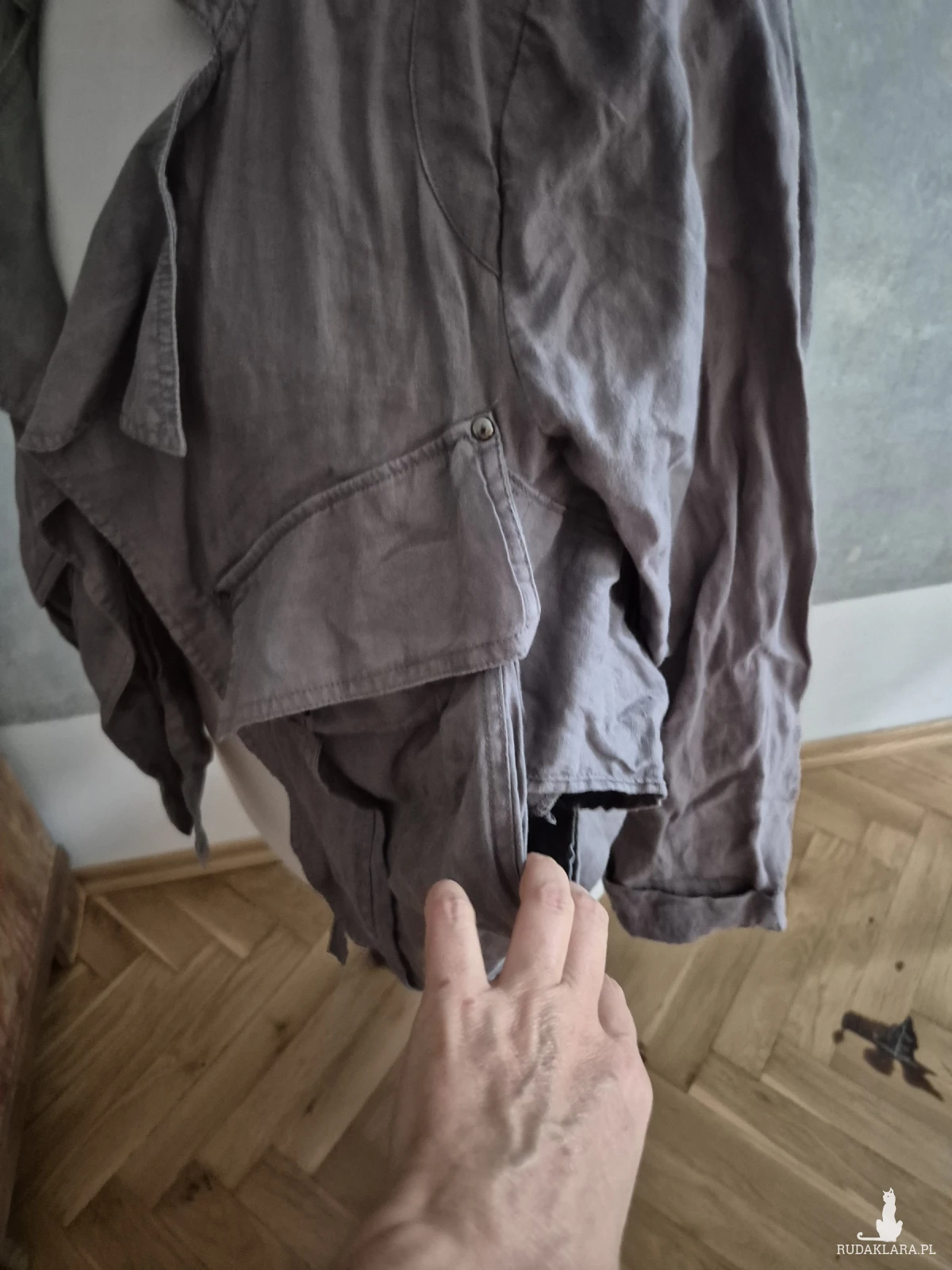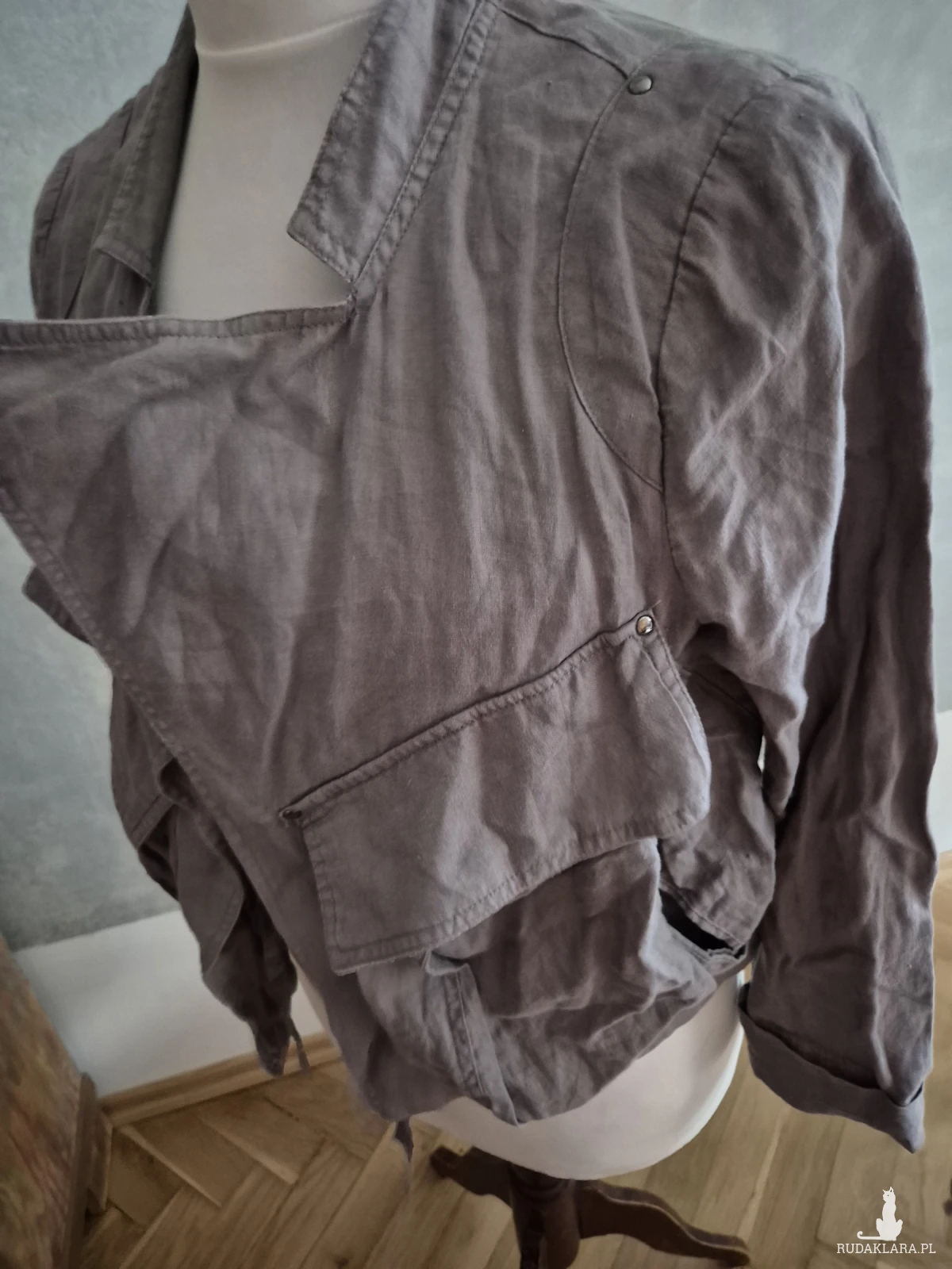 Kurtka w rozmiarze S materiał len niesamowicie ciekawie Uszyta pasuje na osobę w rozmiarze 38 długość całości kurtki to 56 cm długość rękawa 61 cm liczne bardzo ciekawe kieszenie styl militarny luźny wygląda obłędnie polecam