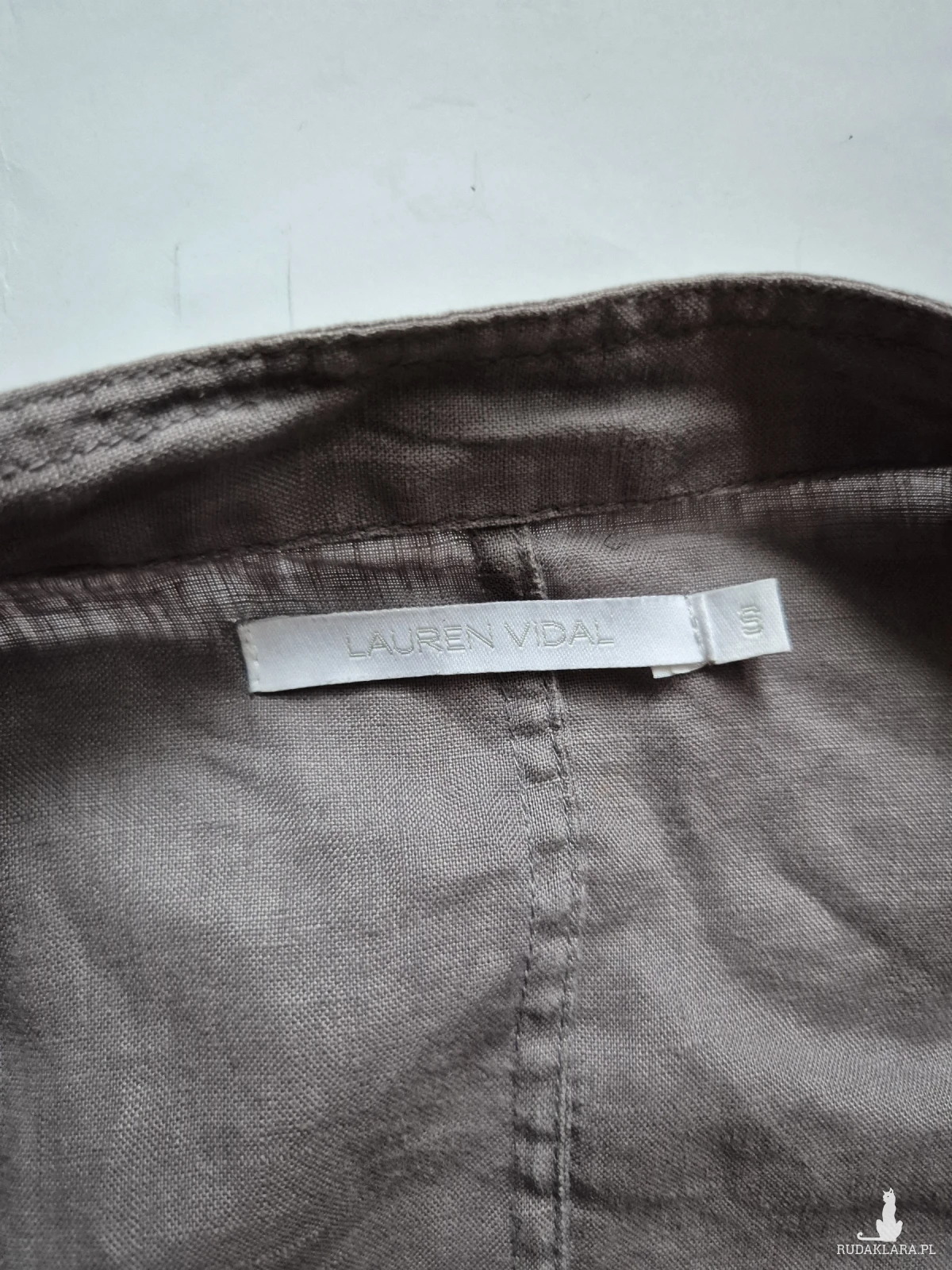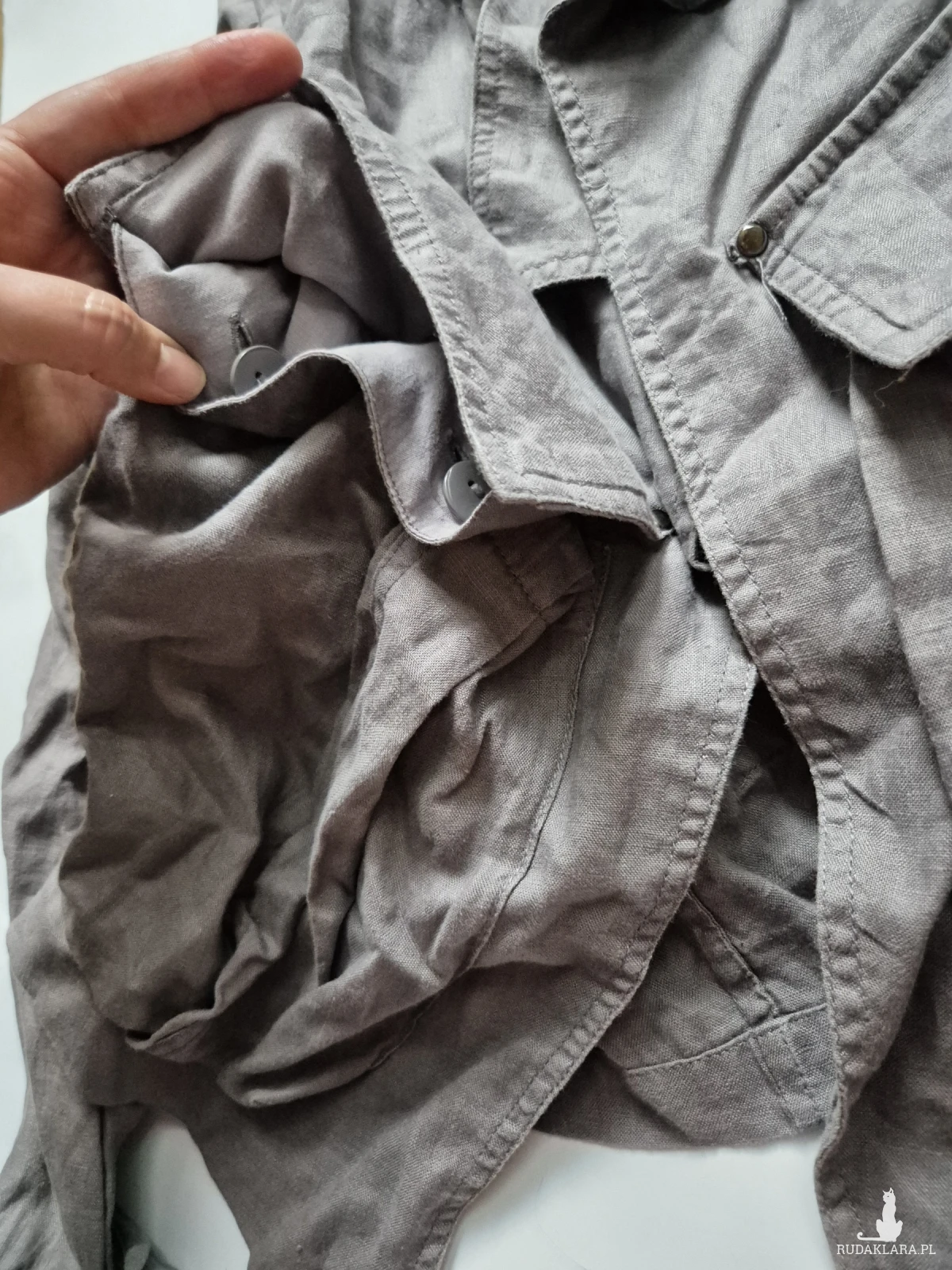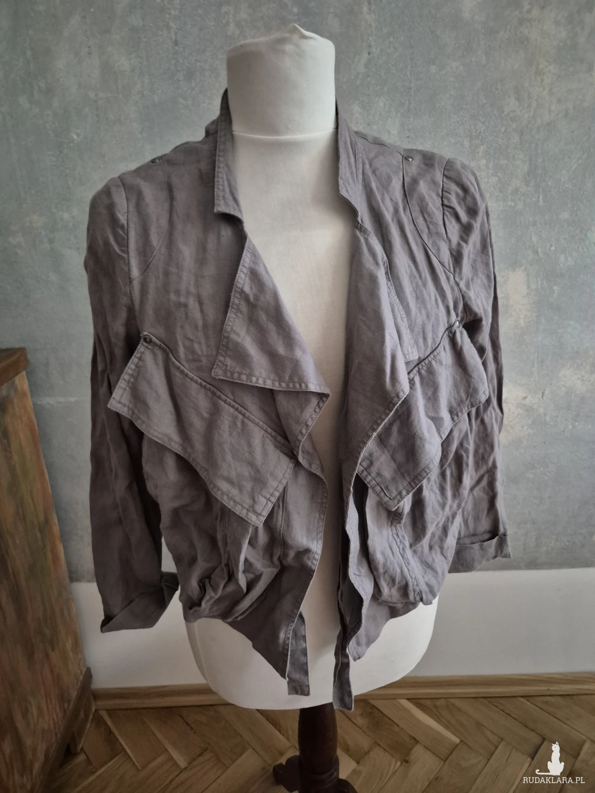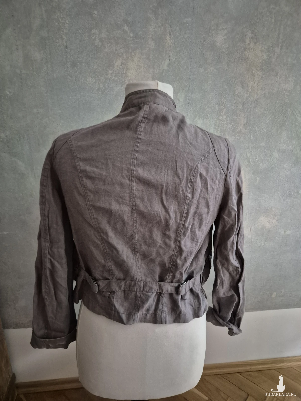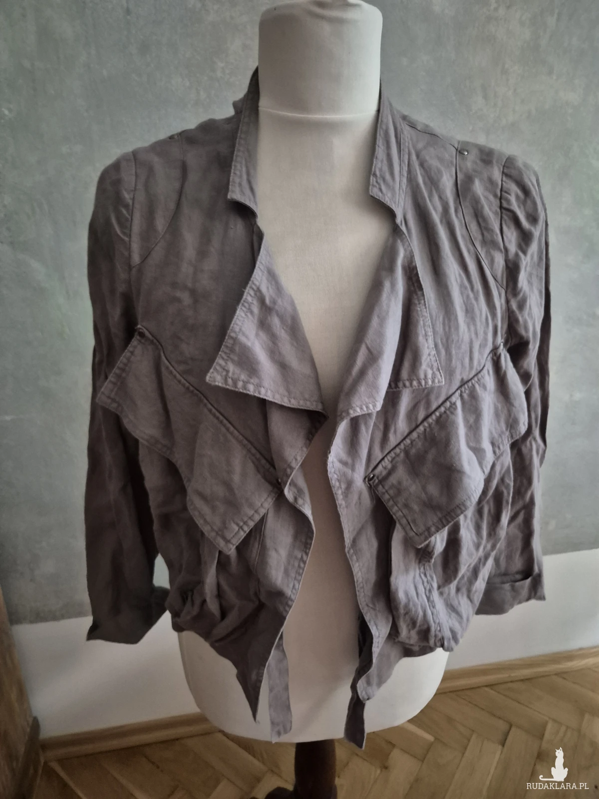 Kurtka w rozmiarze S materiał len niesamowicie ciekawie Uszyta pasuje na osobę w rozmiarze 38 długość całości kurtki to 56 cm długość rękawa 61 cm liczne bardzo ciekawe kieszenie styl militarny luźny wygląda obłędnie polecam