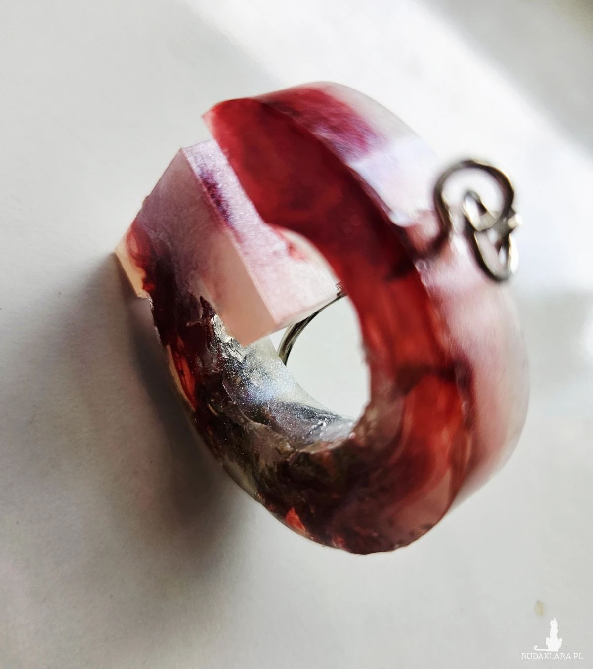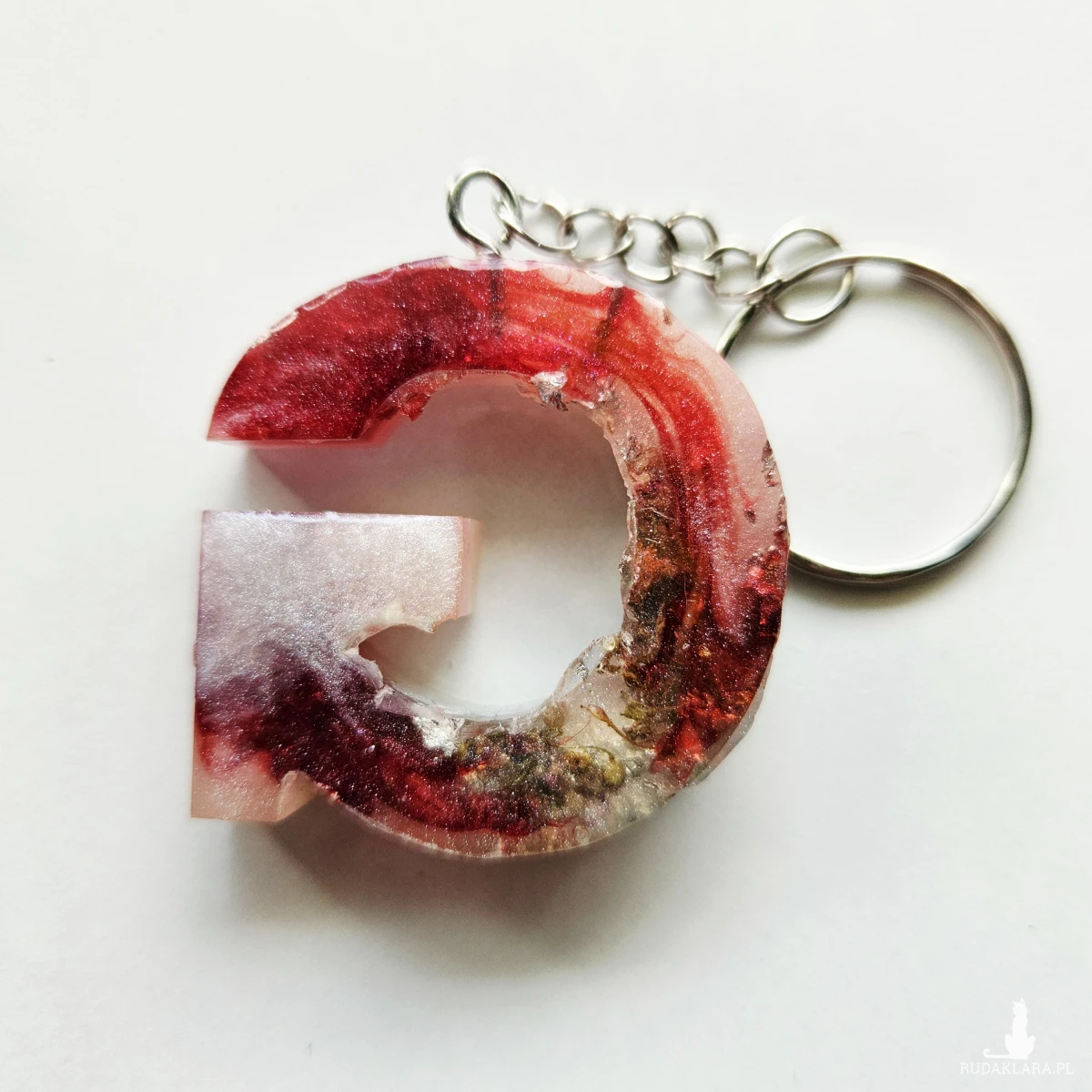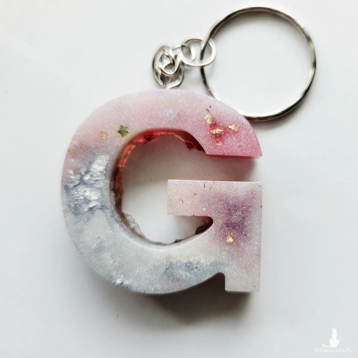 Brelok literka G z żywicy różowa z złotem I kwiatem