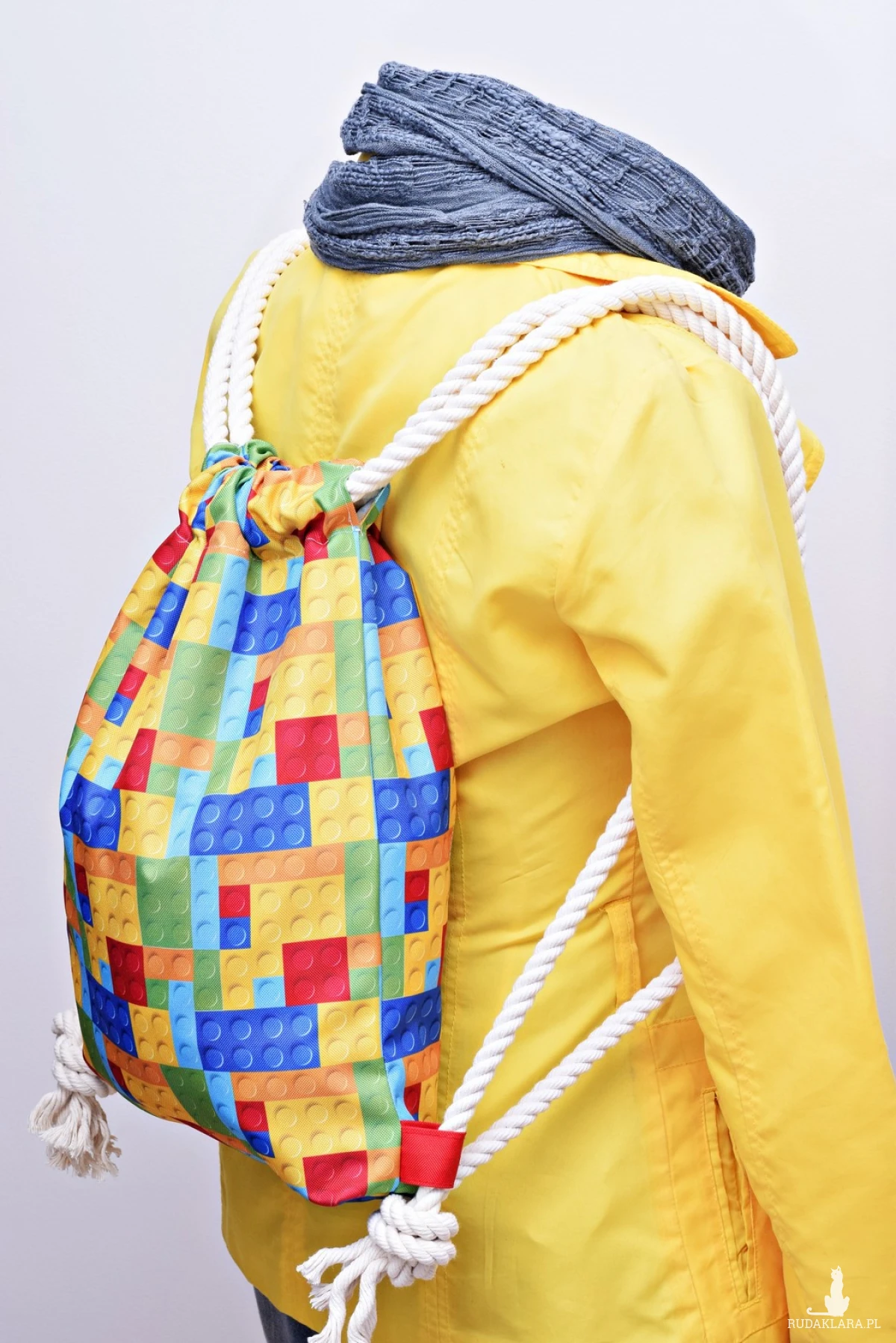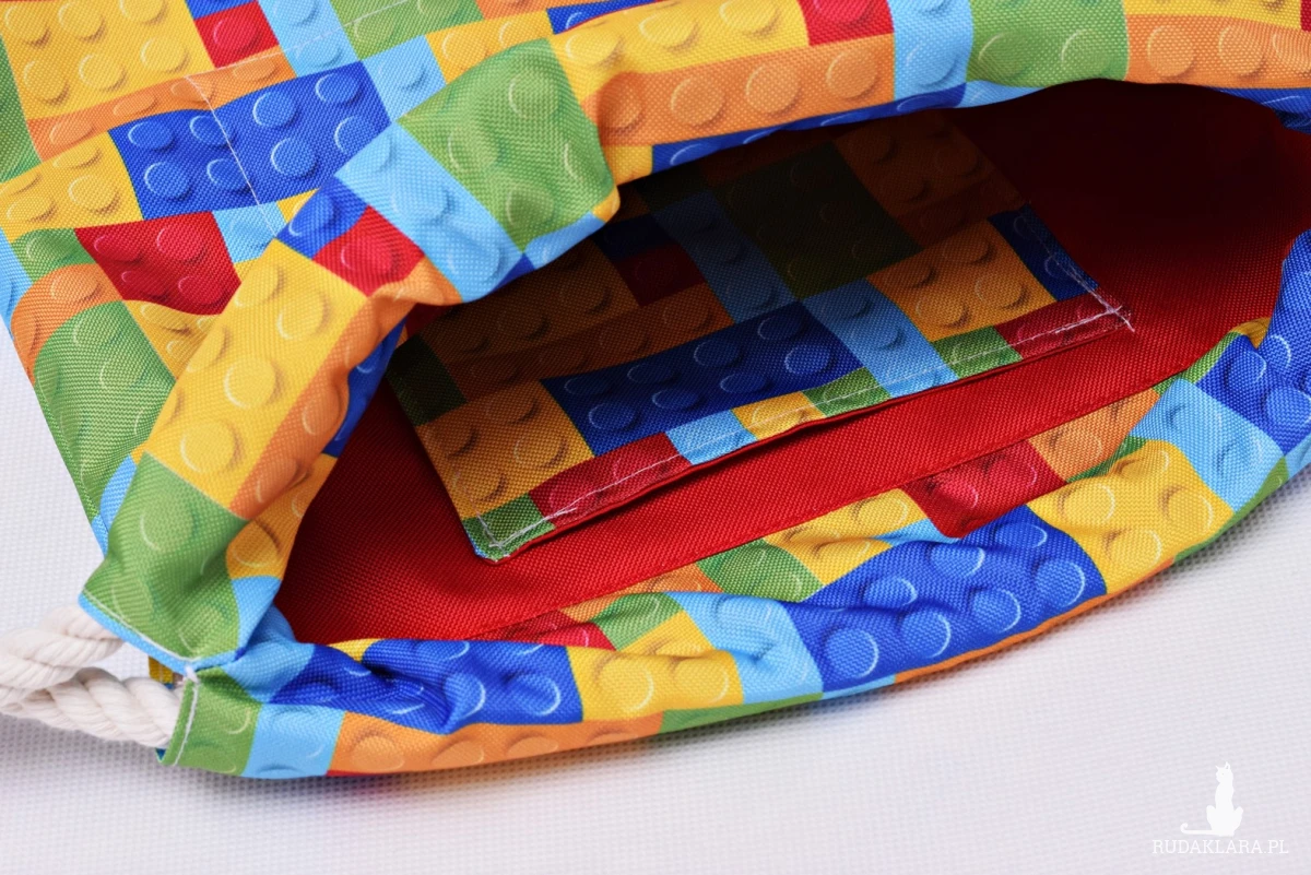 W środku worka jest także wodoodporna podszewka w kolorze czerwonym oraz kieszonka która pomieści drobiazgi takie jak klucze, telefon itp.