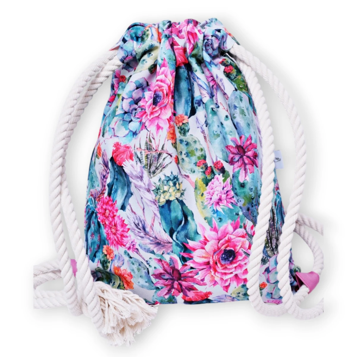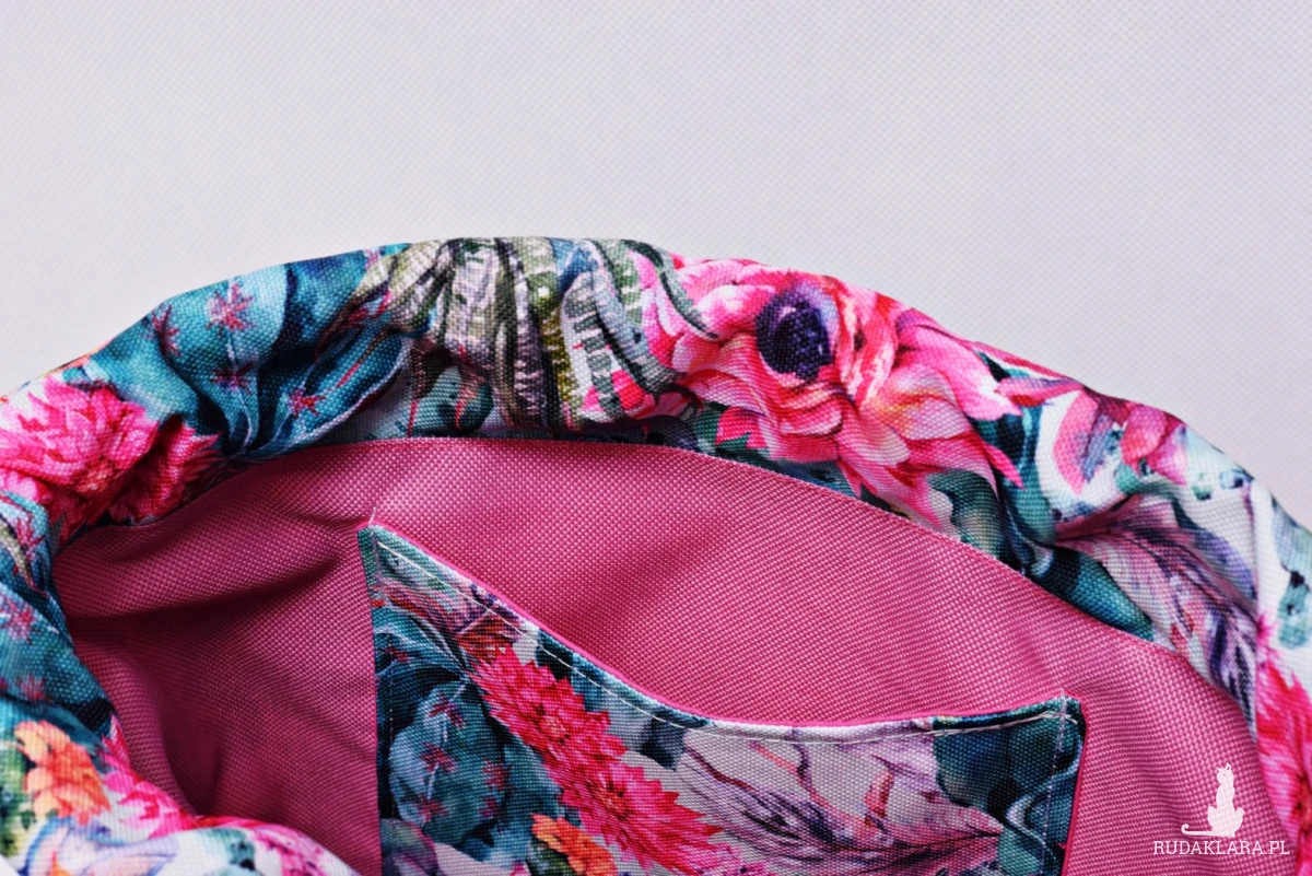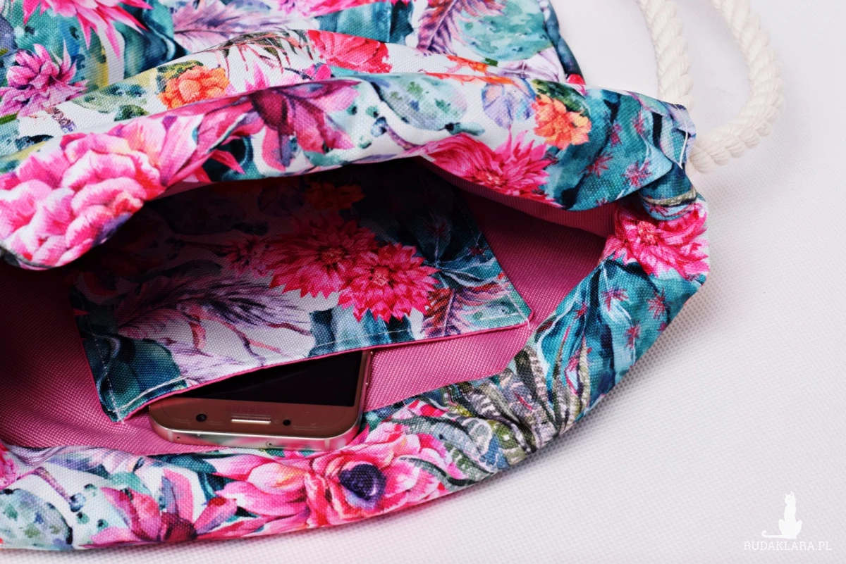 W środku worka jest także wodoodporna podszewka w kolorze różowym oraz kieszonka która pomieści drobiazgi takie jak klucze, telefon itp.