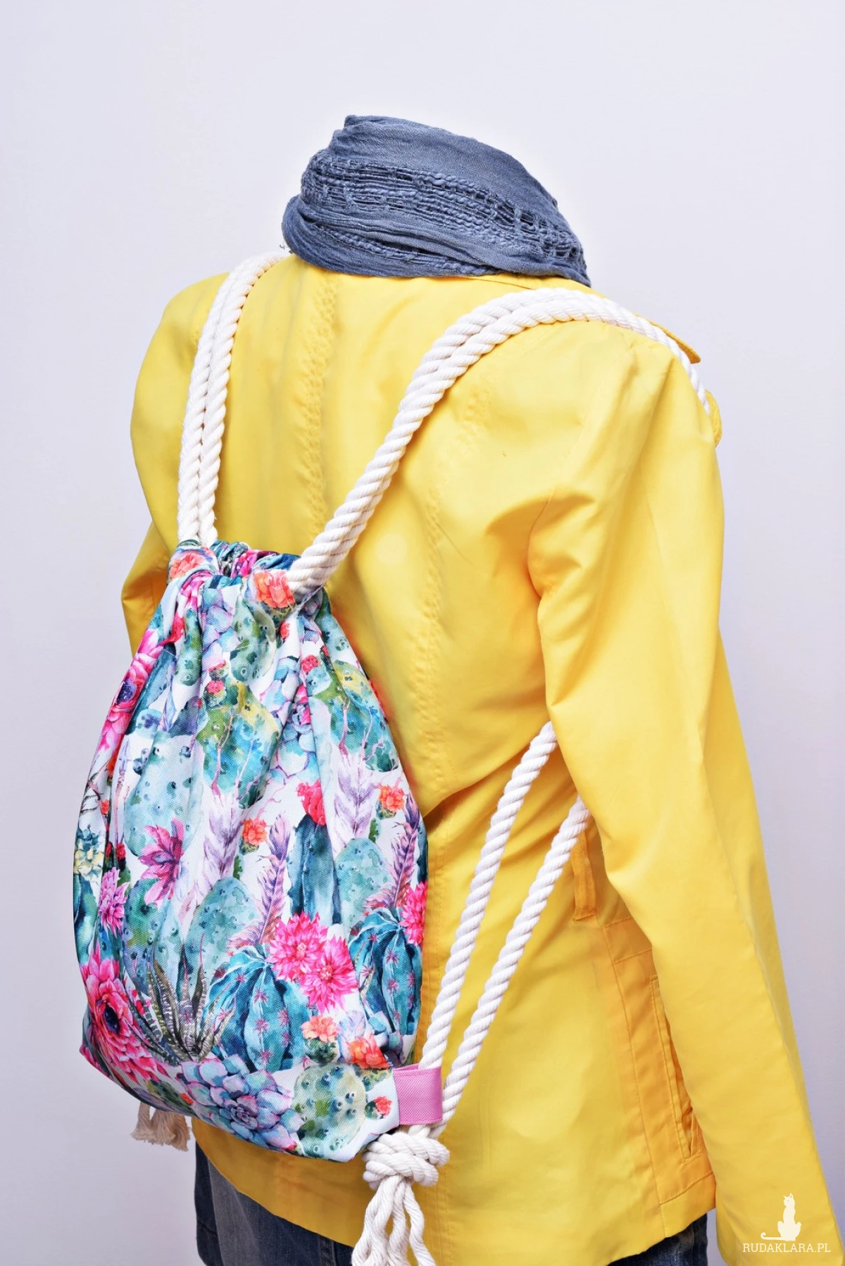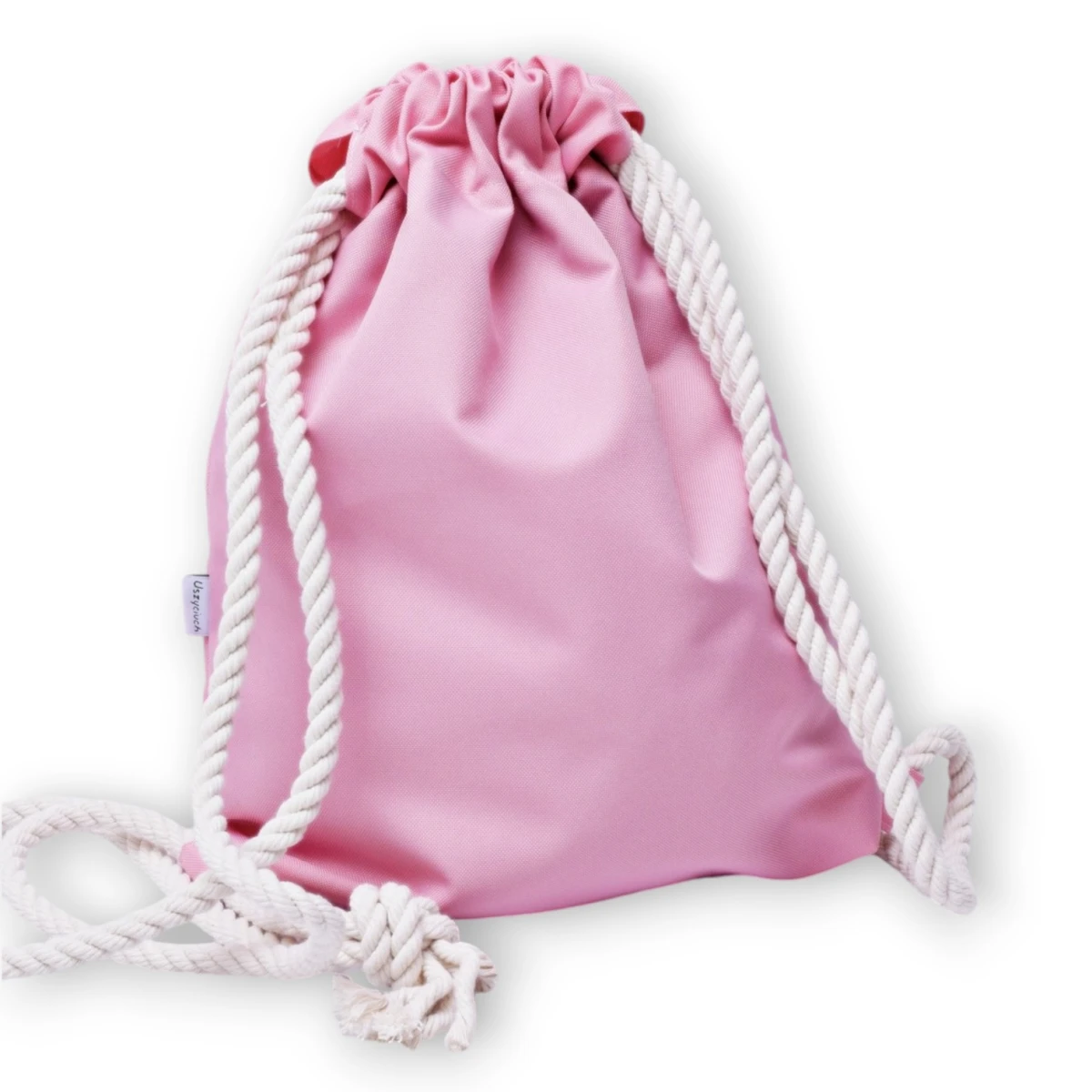 W środku worka jest także wodoodporna podszewka w kolorze różowym oraz kieszonka która pomieści drobiazgi takie jak klucze, telefon itp.