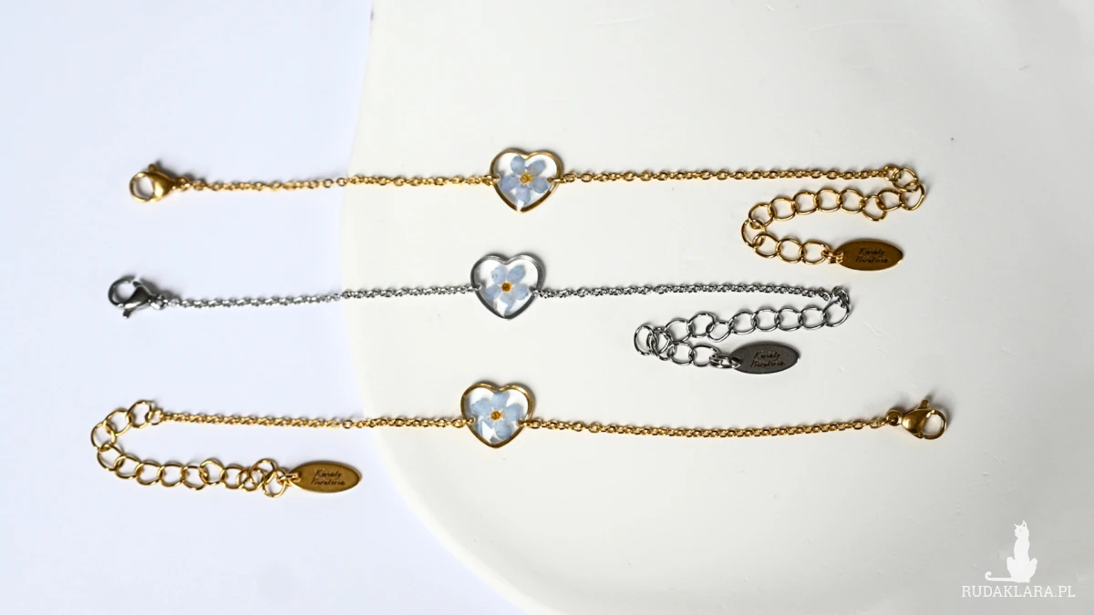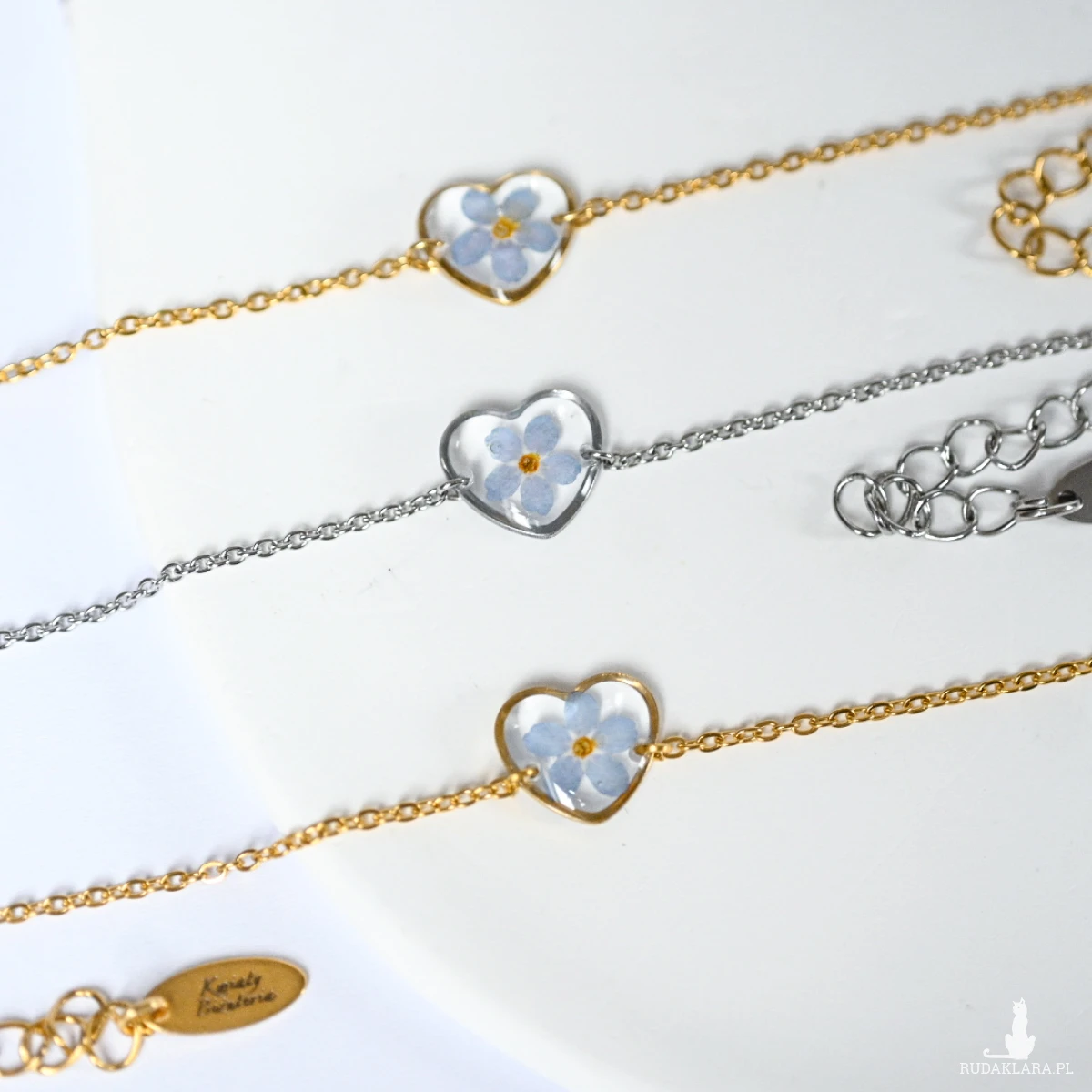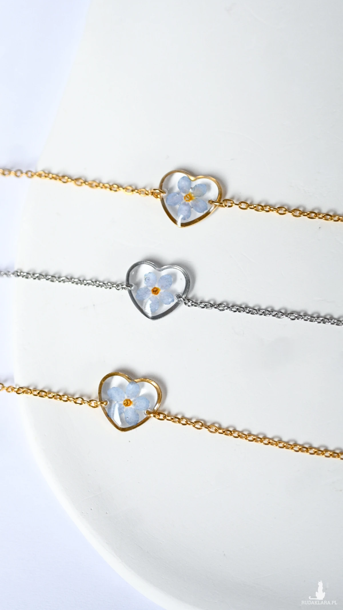 Delikatna, ręcznie robiona bransoletka z zatopioną w żywicy prawdziwą niezapominajką. Dostępna w wersji pozłacanej lub srebrnej.