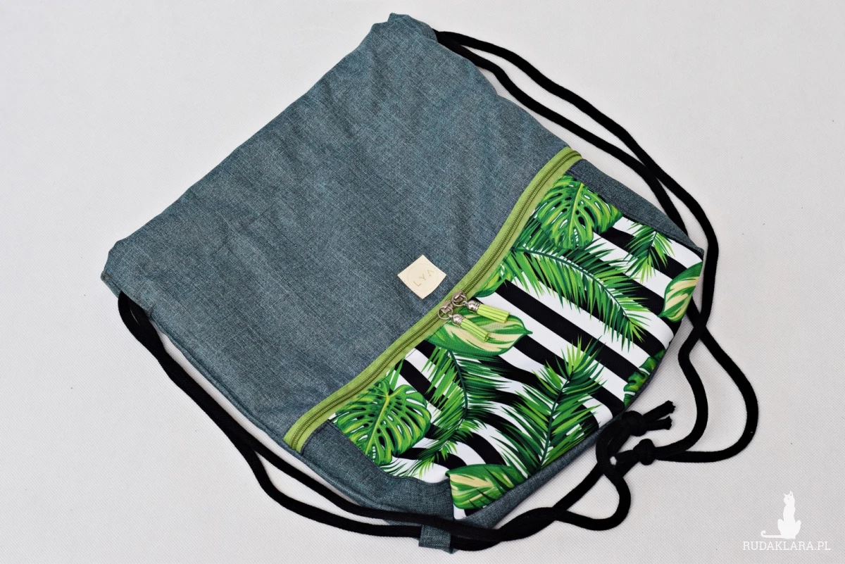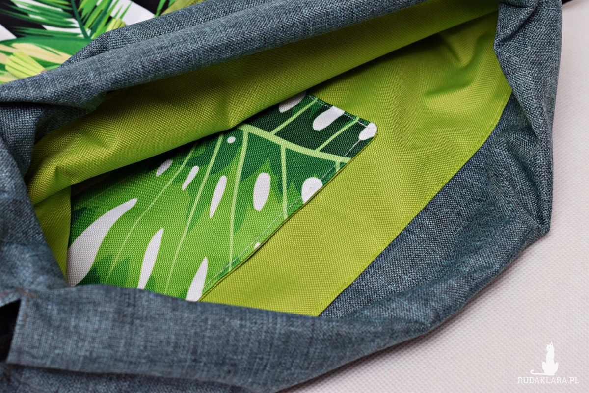 W środku worka jest także wodoodporna podszewka w kolorze zielonym oraz kieszonka która pomieści drobiazgi takie jak klucze, telefon itp. Worko plecak ma zewnętrzną kieszonkę zapinaną na zamek.