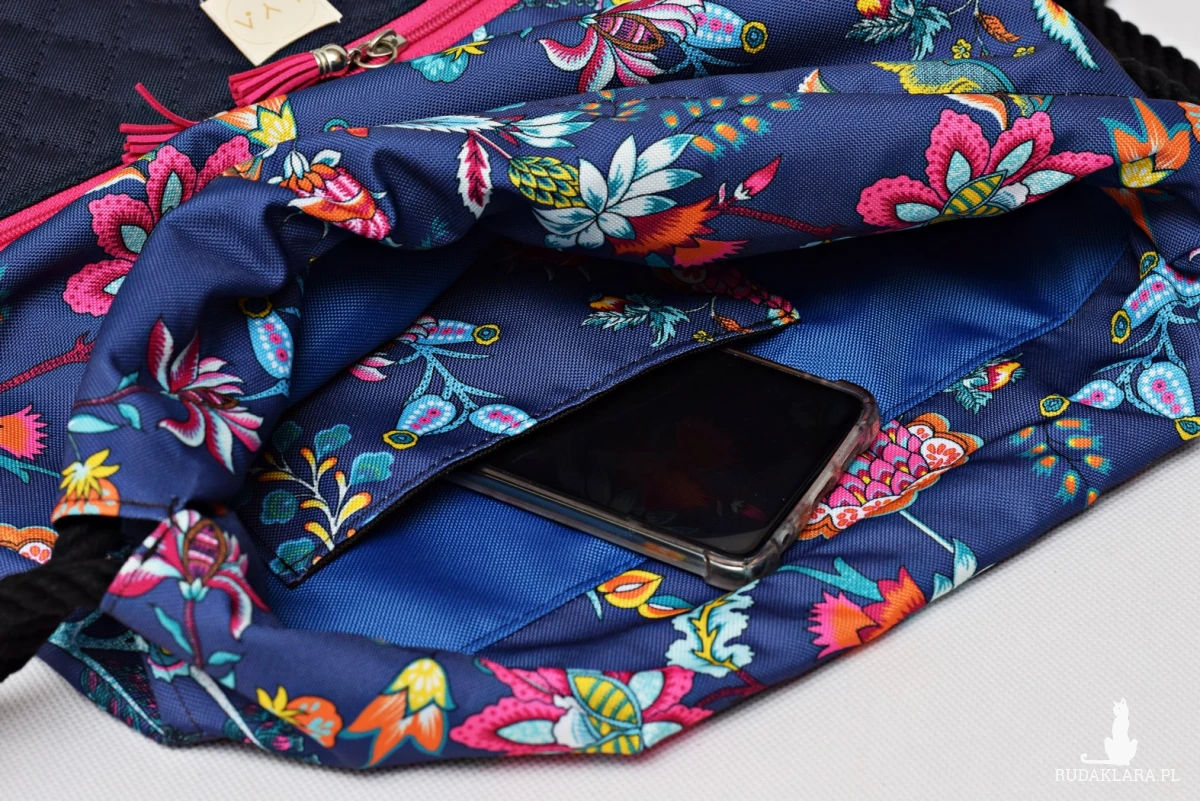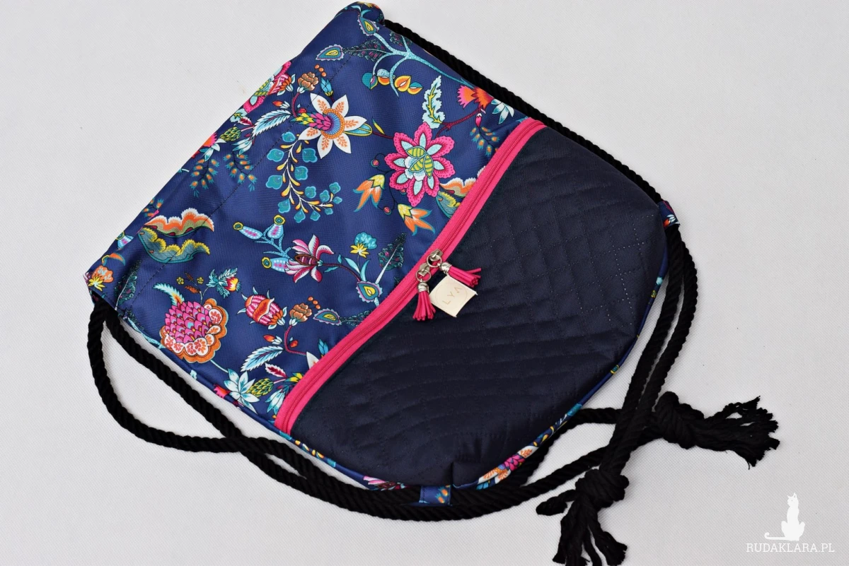 W środku worka jest także wodoodporna podszewka w kolorze niebieskim oraz kieszonka która pomieści drobiazgi takie jak klucze, telefon itp. Worko plecak ma zewnętrzną kieszonkę zapinaną na zamek.