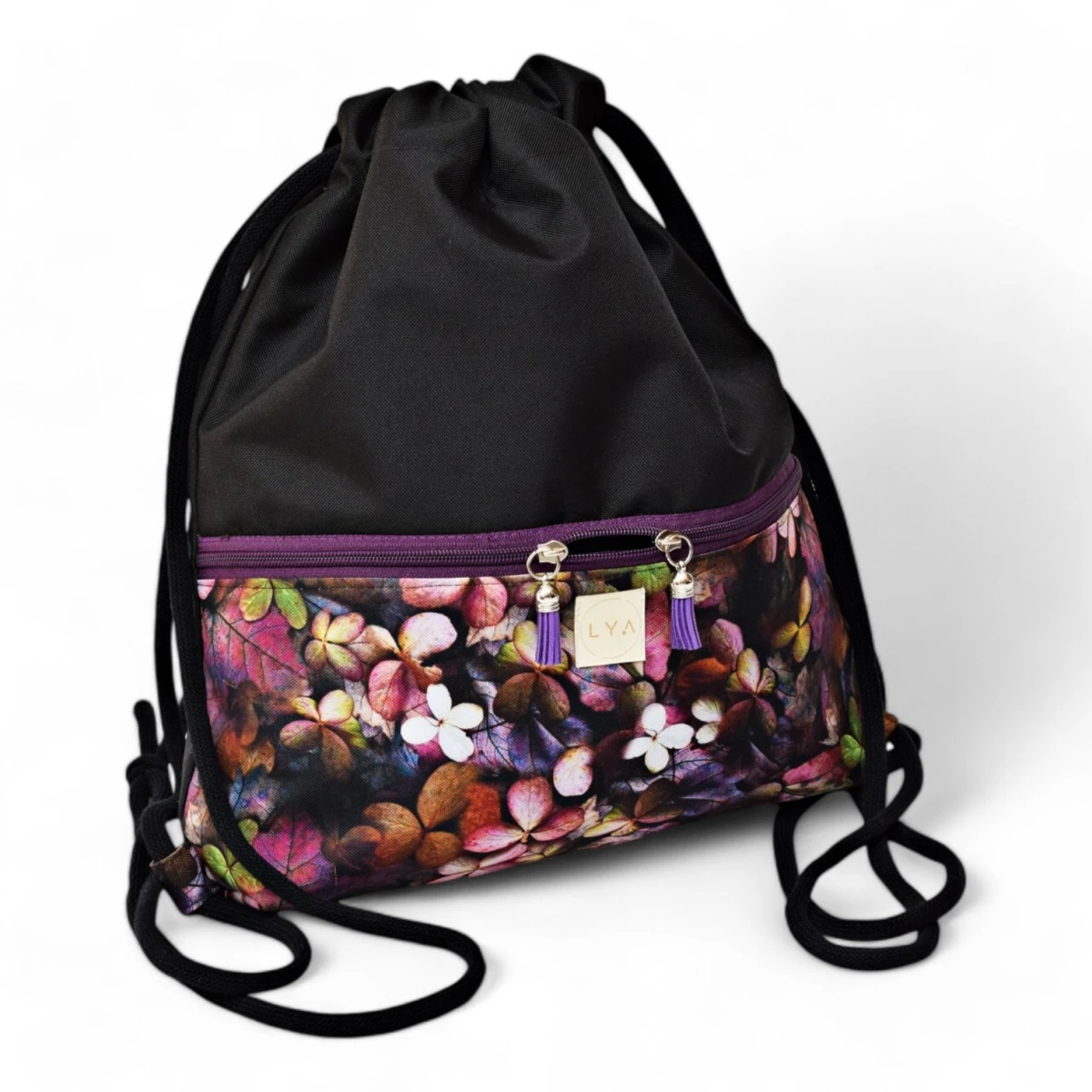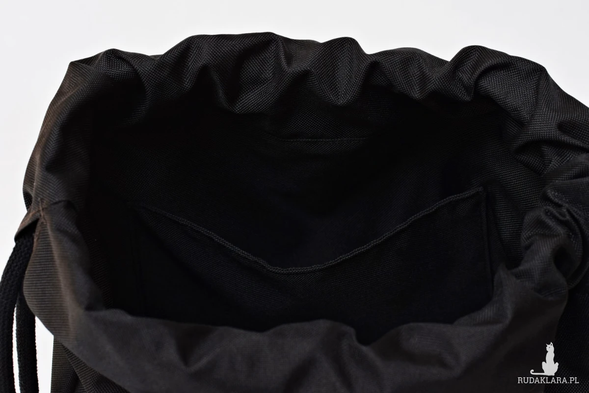 W środku worka jest także wodoodporna podszewka w kolorze czarnym oraz kieszonka która pomieści drobiazgi takie jak klucze, telefon itp. Worko plecak ma zewnętrzną kieszonkę zapinaną na zamek.