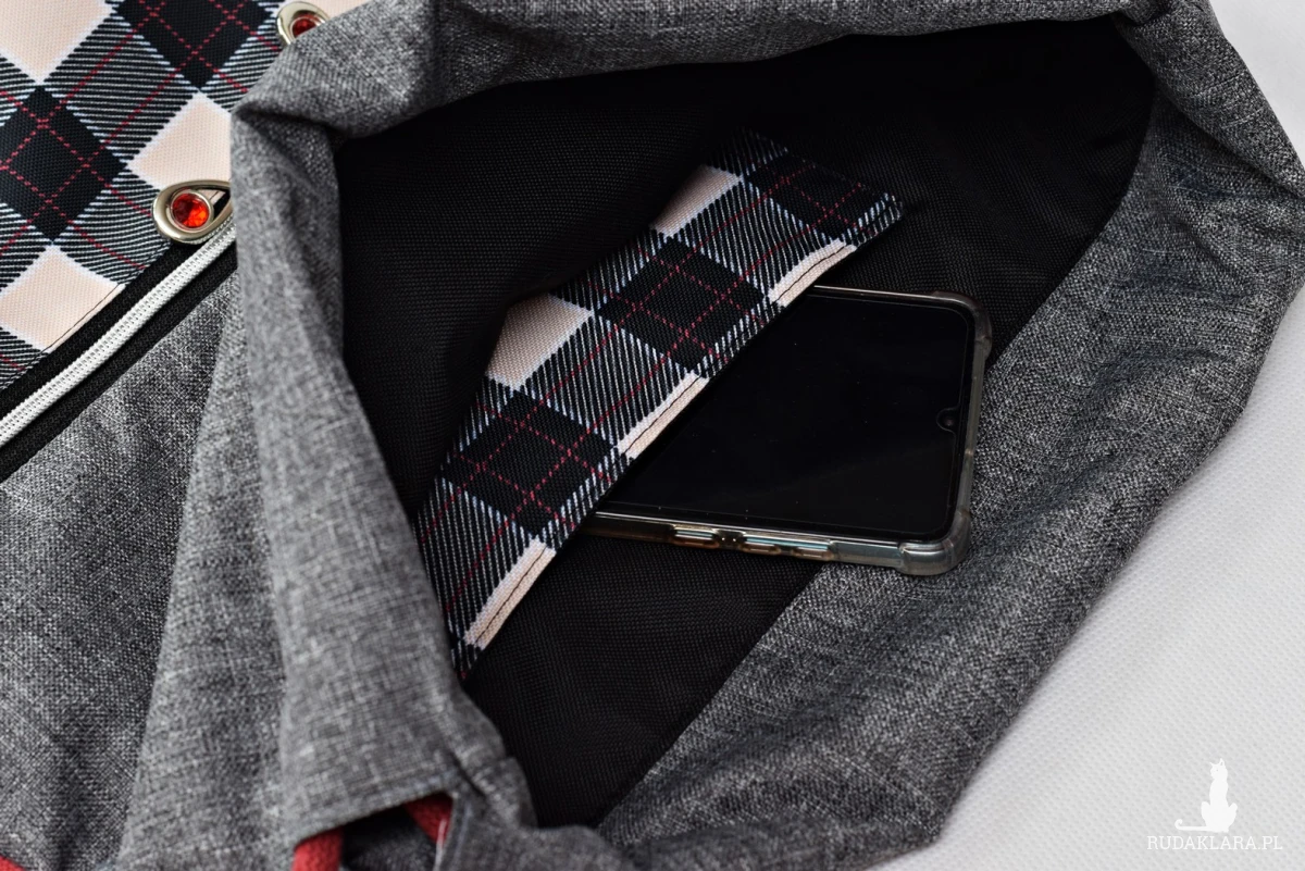 W środku worka jest także wodoodporna podszewka w kolorze czarnym oraz kieszonka która pomieści drobiazgi takie jak klucze, telefon itp. Worko plecak ma zewnętrzną kieszonkę zapinaną na zamek.