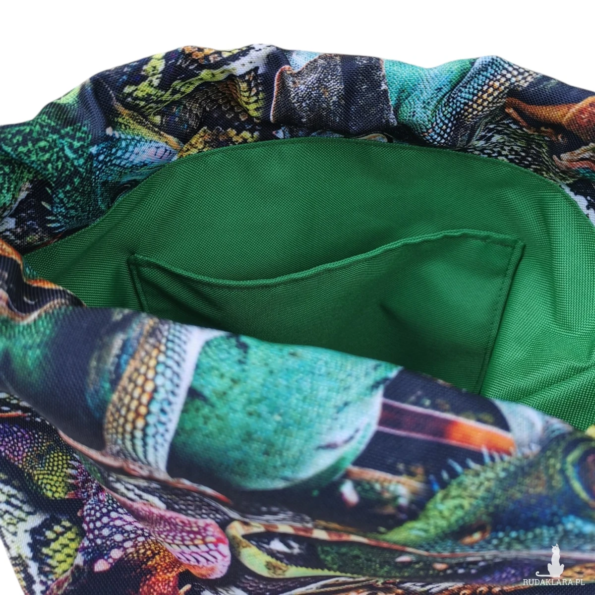 W środku worka jest także wodoodporna podszewka w kolorze zielonym oraz kieszonka która pomieści drobiazgi takie jak klucze, telefon itp.