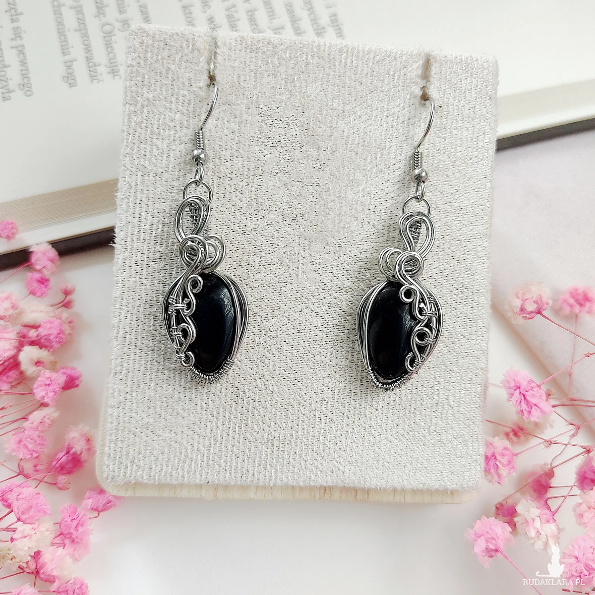 Kolczyki Onyks ręcznie robione. Wykonane techniką wirewrapping z drutów ze stali chirurgicznej.