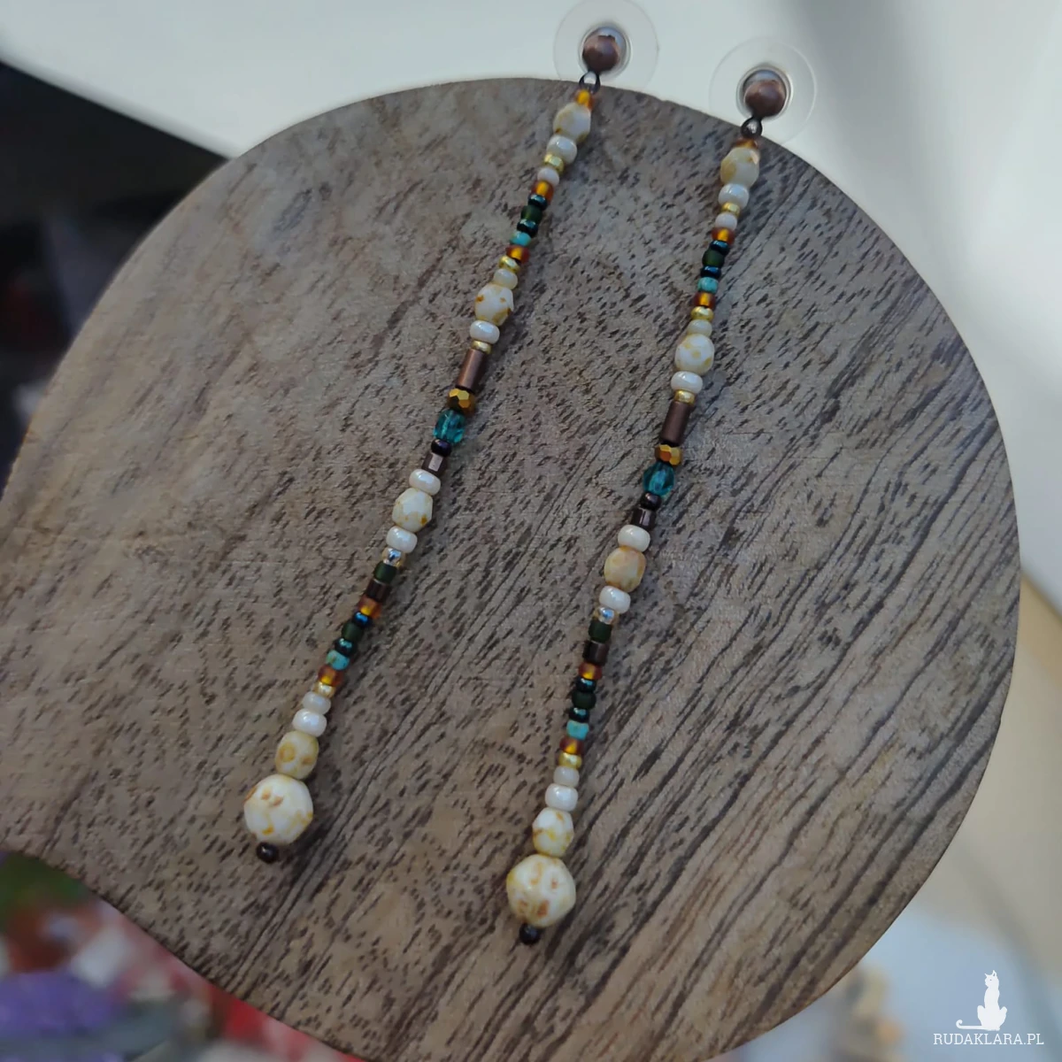 Kolczyki minimalistyczne cienkie nitki z koralikami. Koraliki szklane kolorowe. Długość 85 mm, metalowe sztyfty, silikonowy baranek.