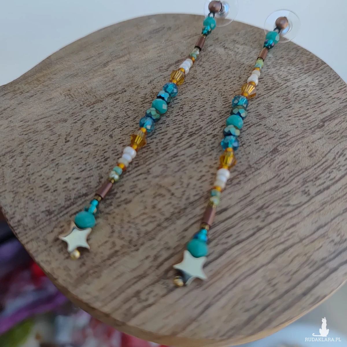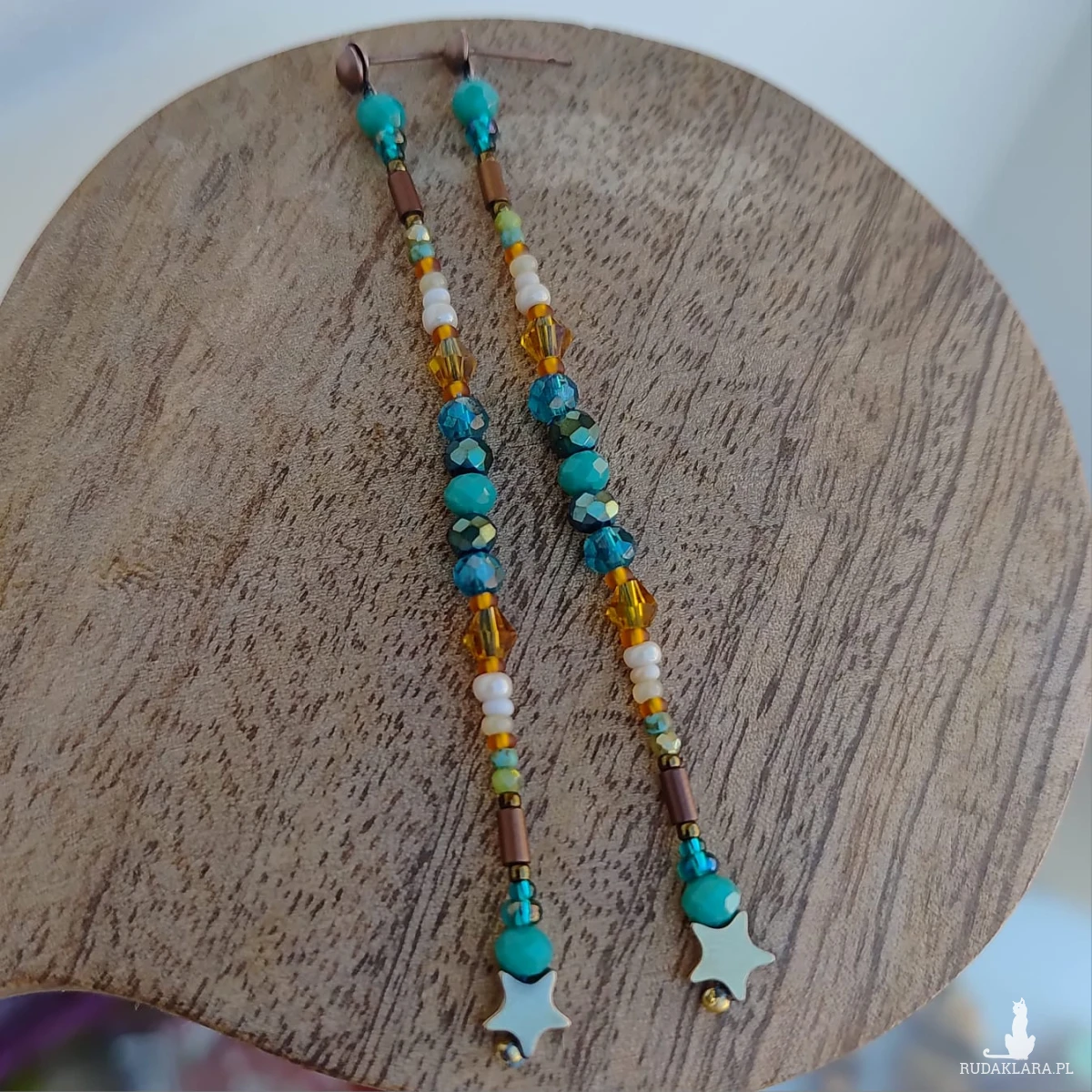 Kolczyki minimalistyczne cienkie nitki z koralikami. Koraliki szklane kolorowe. Długość 88 mm, metalowe sztyfty, silikonowy baranek.