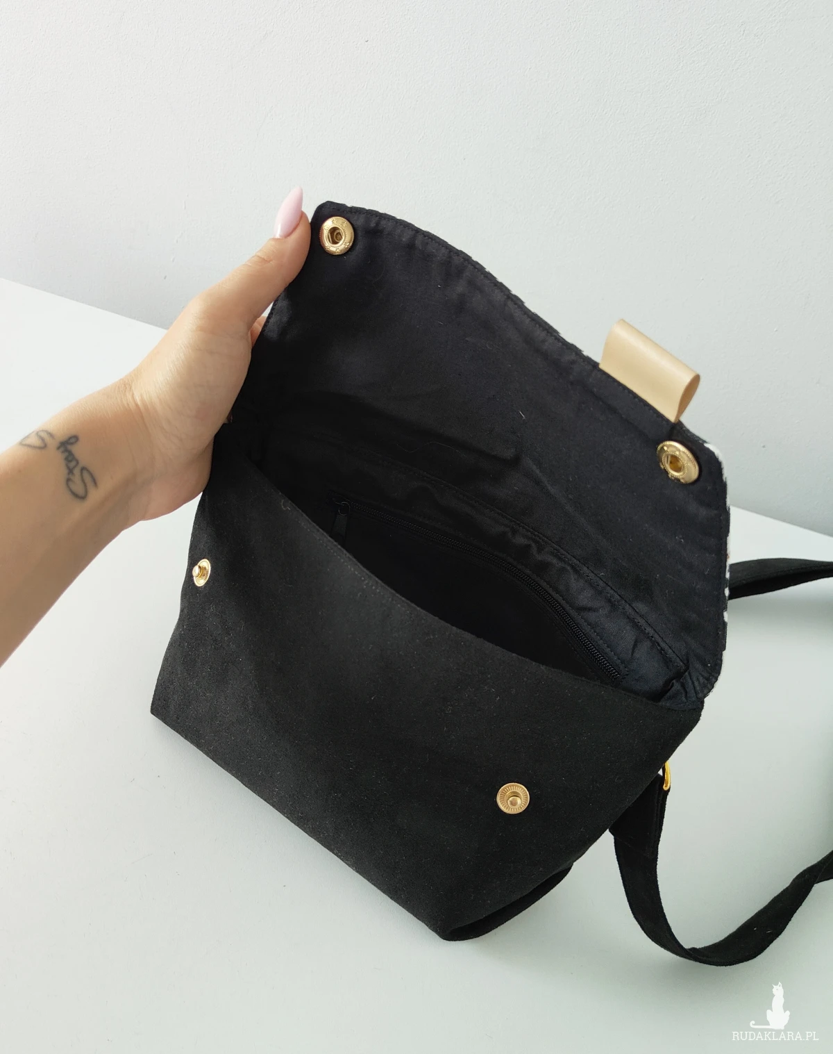 - Wewnątrz bawełniana podszewka i mała kieszonka zapinana na ekspres.