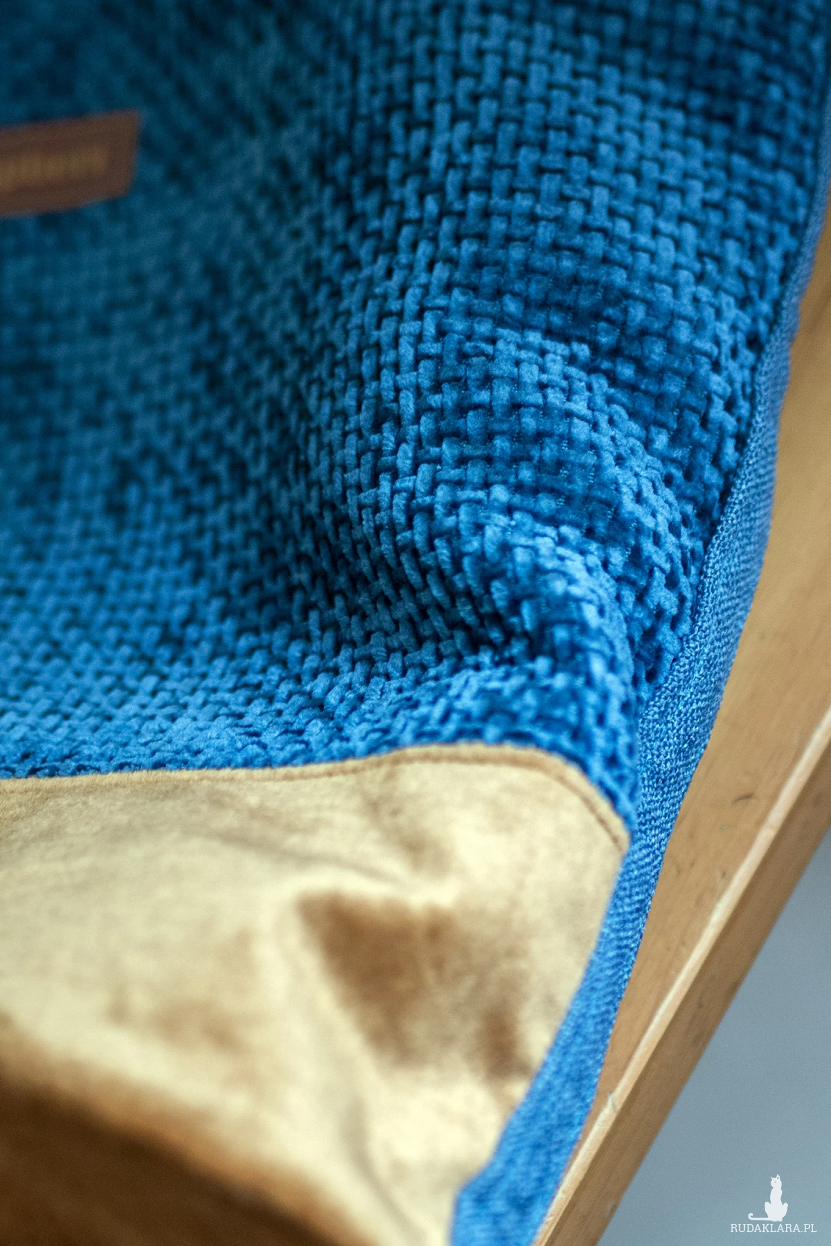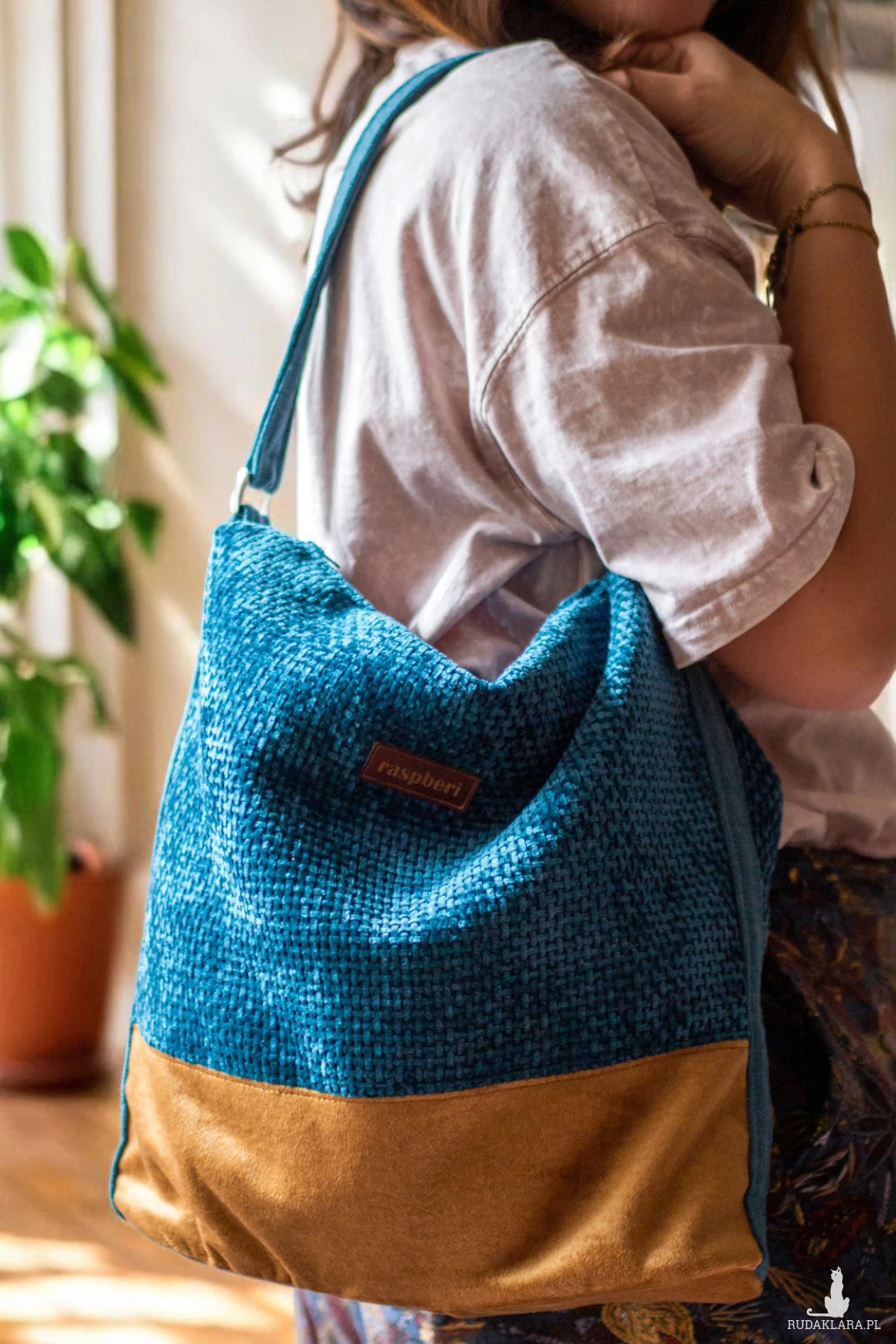 Średniej wielkości torebka w stylu boho. Worek zapinany na suwak z okrągłym, usztywnianym dnem wykonany z turkusowej tkaniny typu welur oraz miodowego weluru. Turkusowe paski.