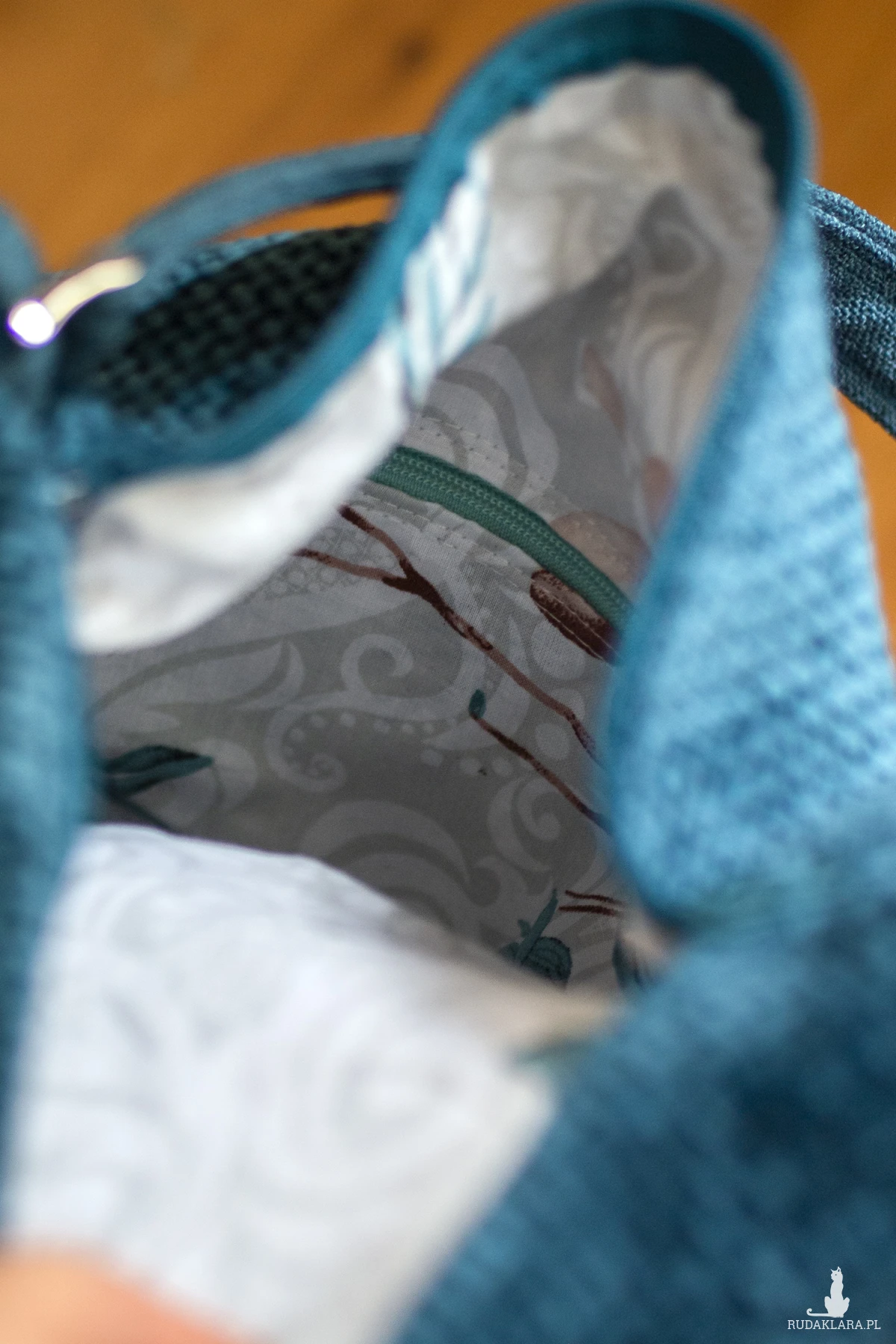 Torebka w środku oraz z tyłu posiada kieszonki zapinane na suwak. Biała, bawełniana podszewka w kwiatki.
