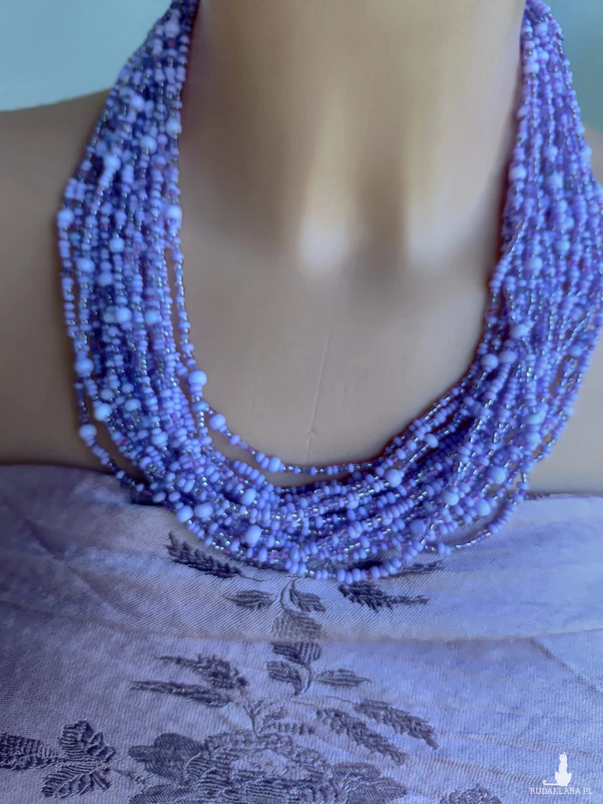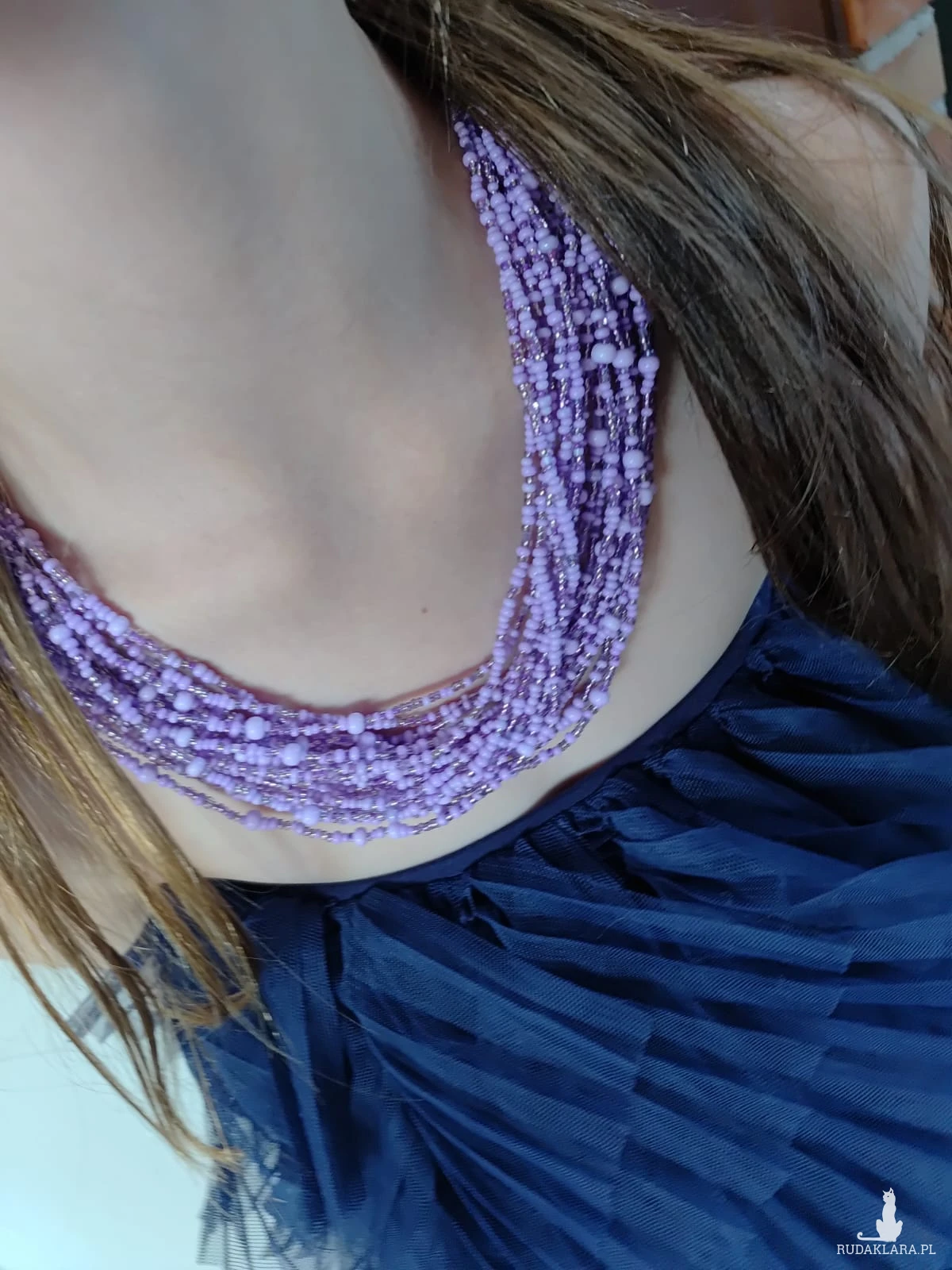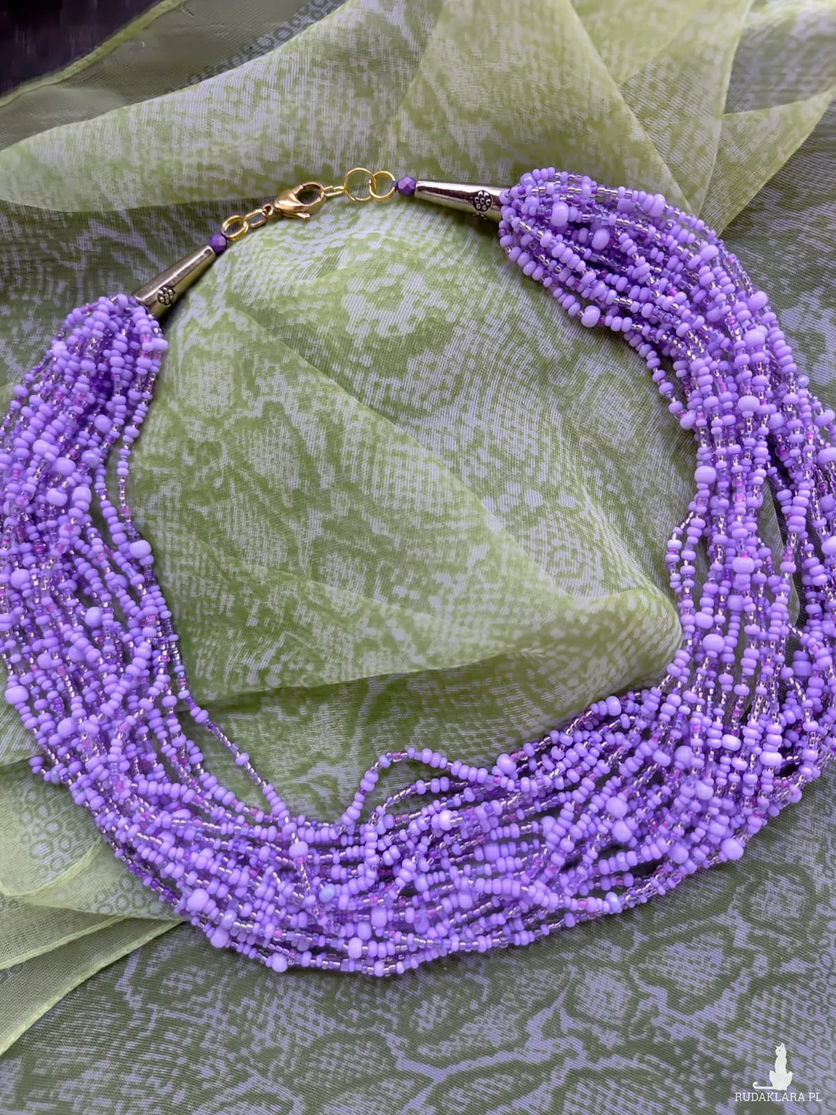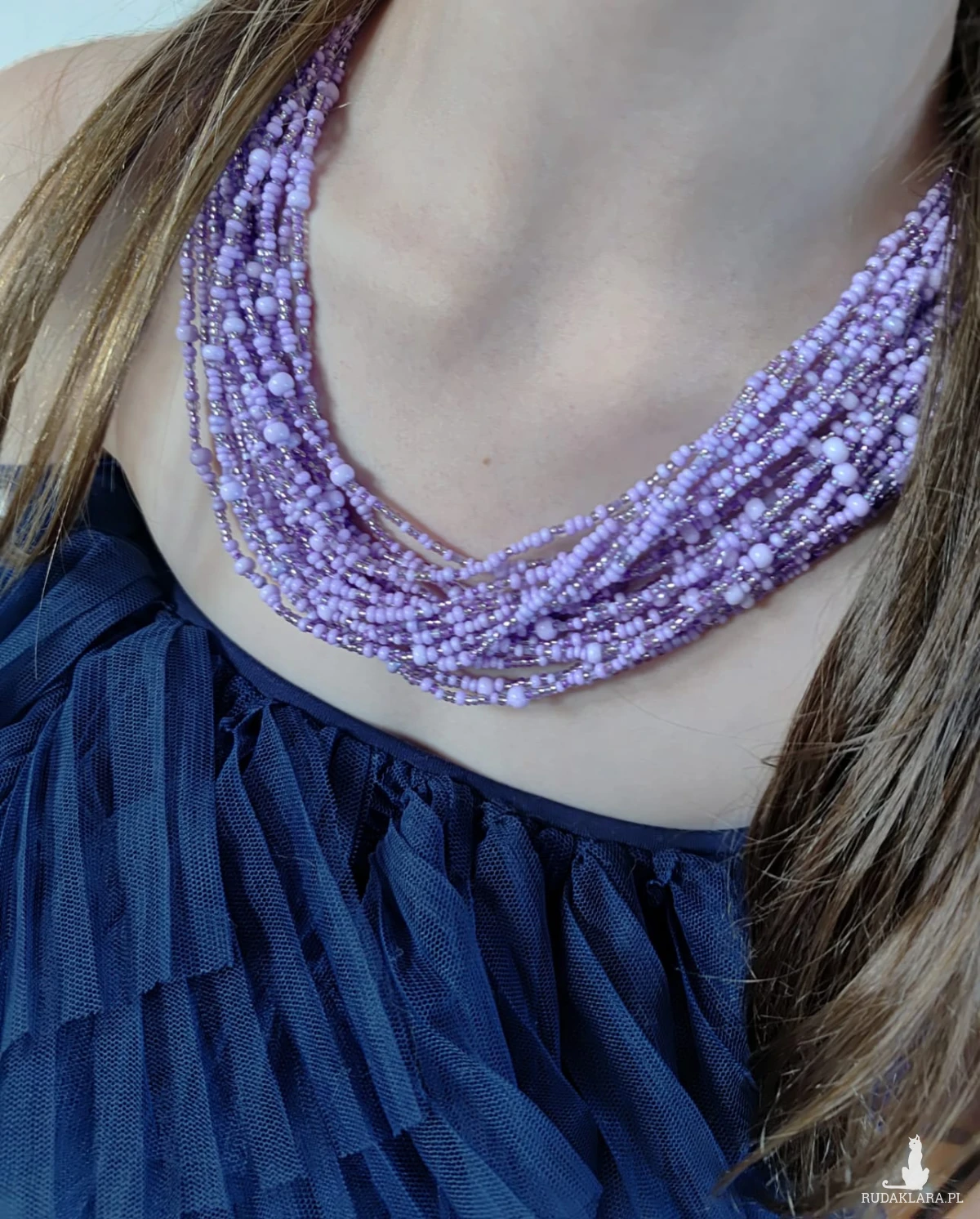 Naszyjnik z koralików w fioletowo liliowym kolorze. Koraliki szklane różnej wielkości do 5 mm maxymalnie. Zapięcie metal i stal w kolorze złotym. Objetość naszyjnika 47 cm, metal,stal, szkło.