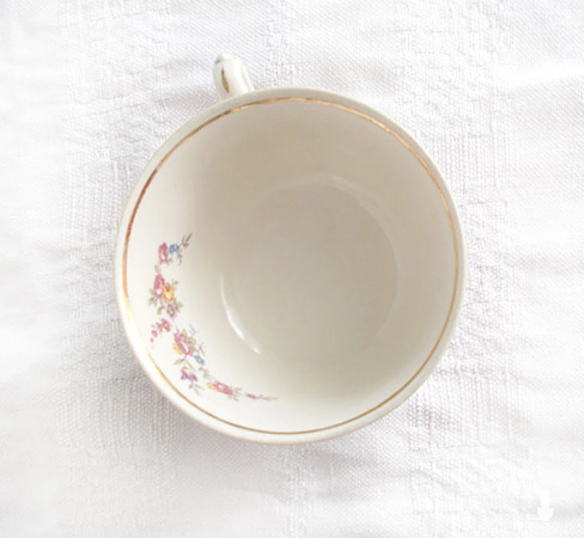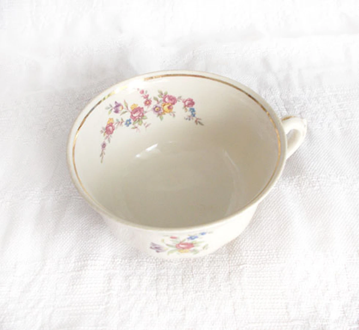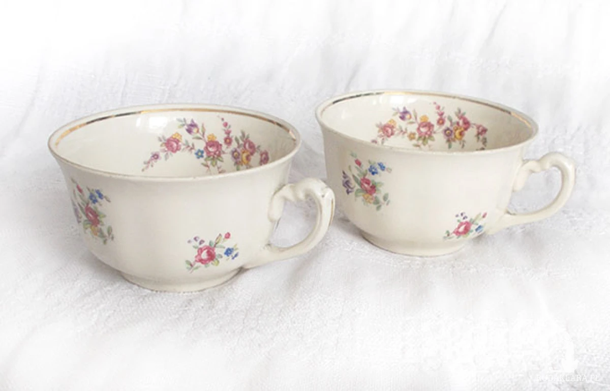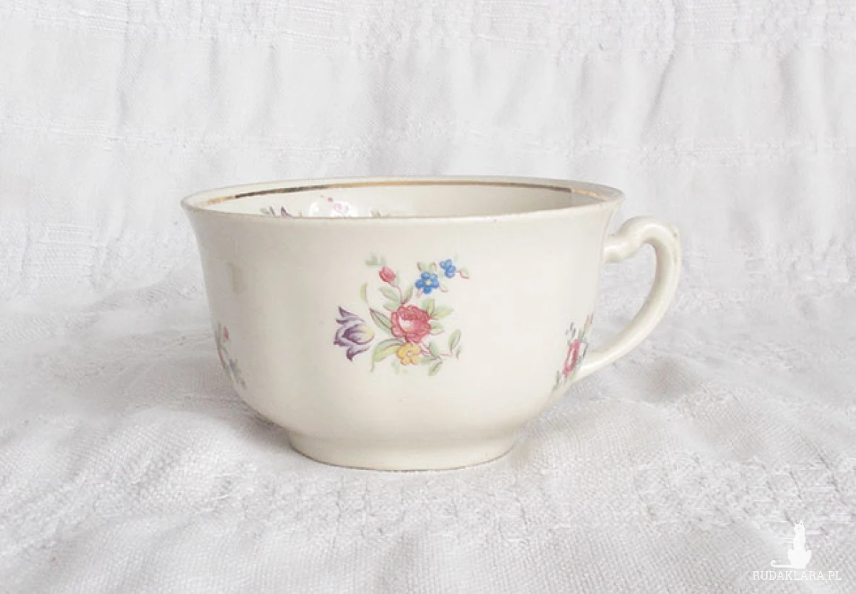 Oryginalny przedmiot vintage z czasów PRL. Kremowa filiżanka, zdobiona wzorem w kwiatuszki na zewnątrz oraz w środku. Producent: "Chodzież". Wymiary: wysokość 5,5 cm, średnica 9,5 cm, szerokość z uszkiem 11,5 cm. Cena za 1 sztukę.