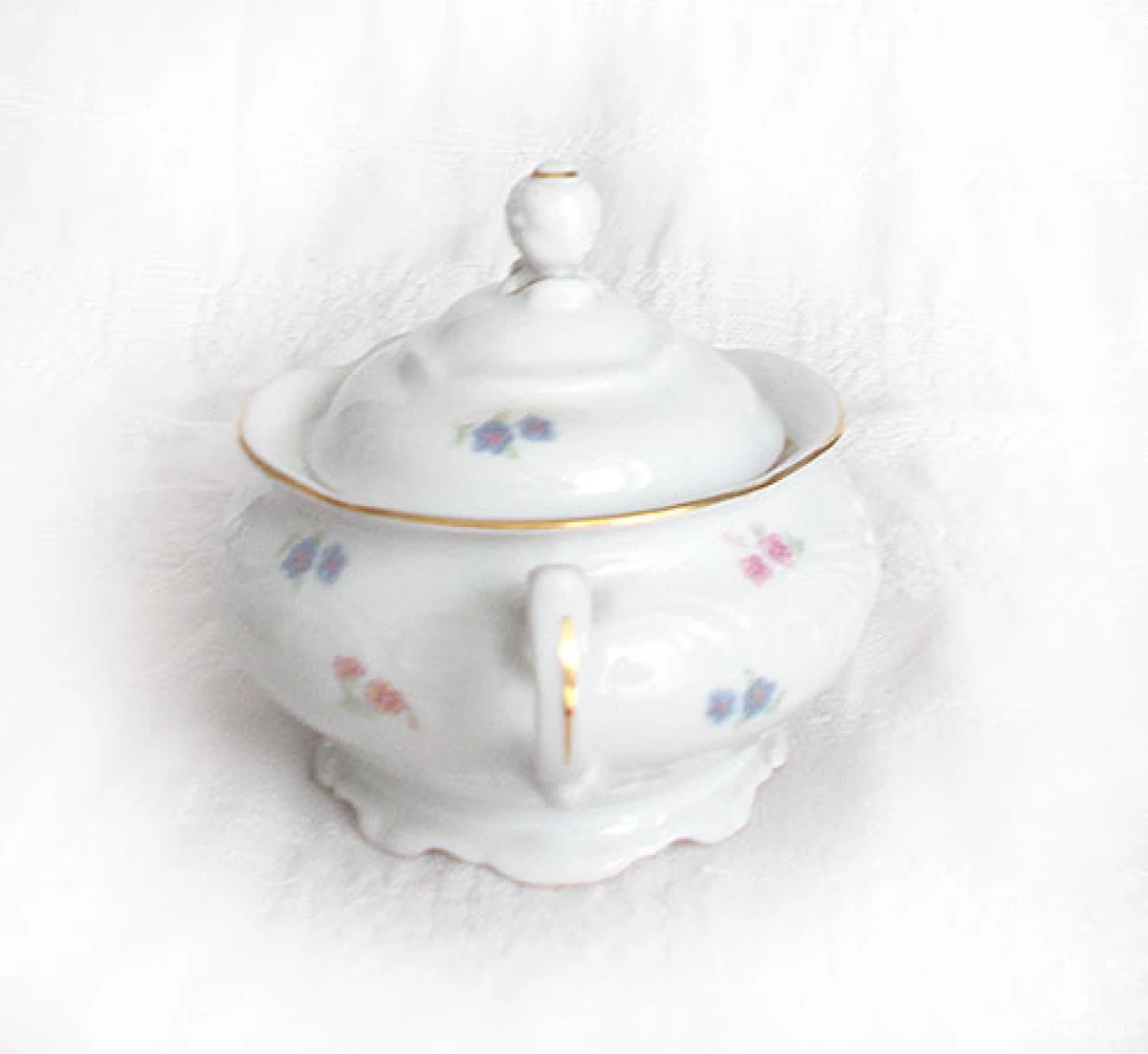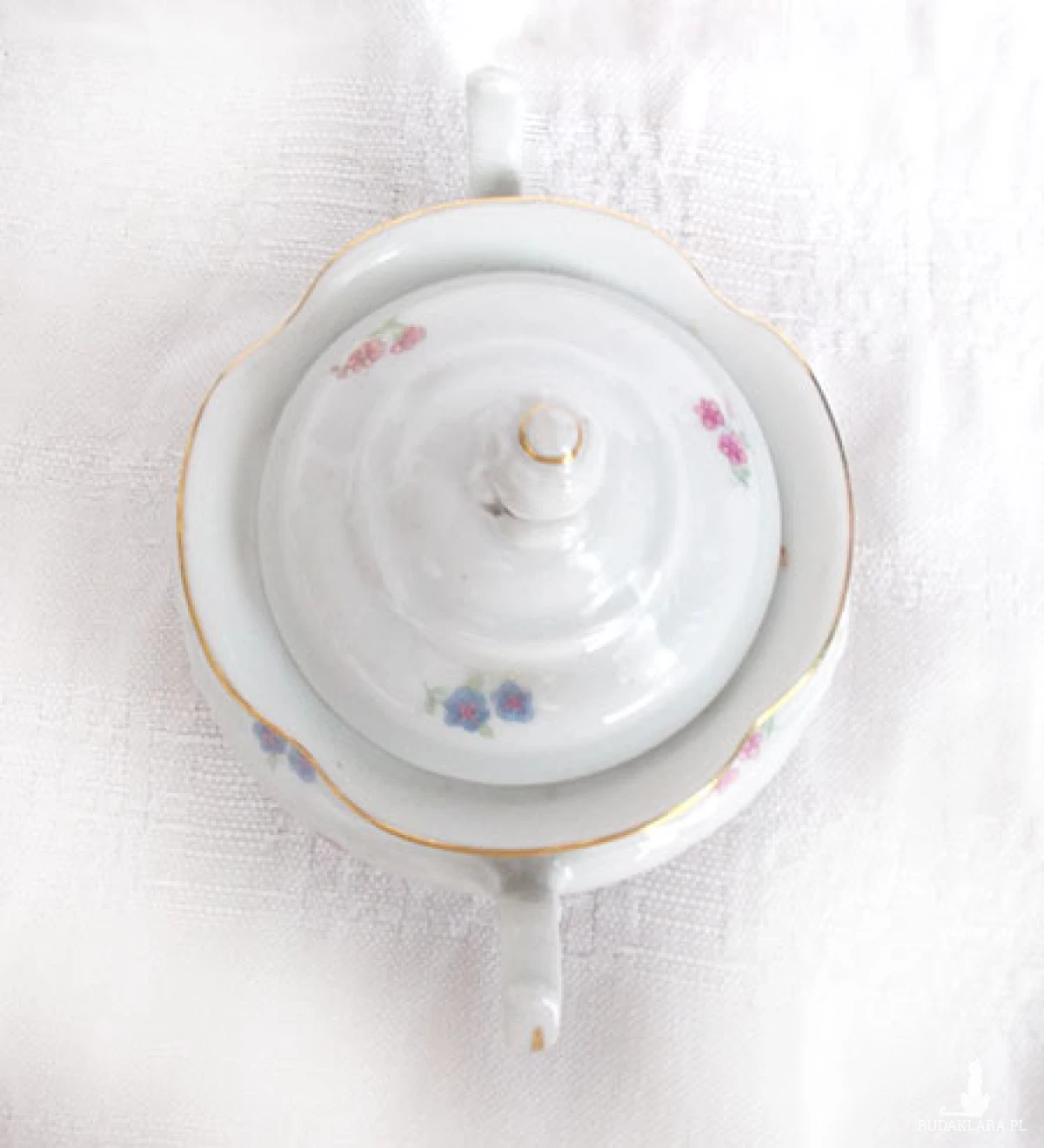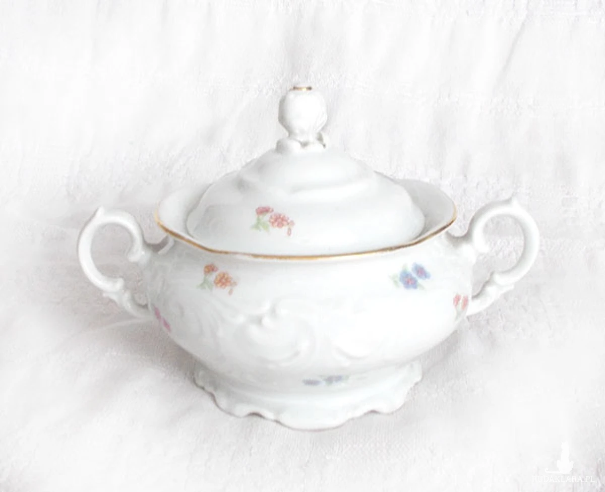 Oryginalna, vintage cukierniczka z czasów PRL, XX w.. Wymiary: wysokość (z przykrywką) 12 cm, szerokość (z uszkami) 15 cm. Naczynie sprawdzi się we wnętrzach urządzonych w stylu klasycznym, rustykalnym, tradycyjnym.