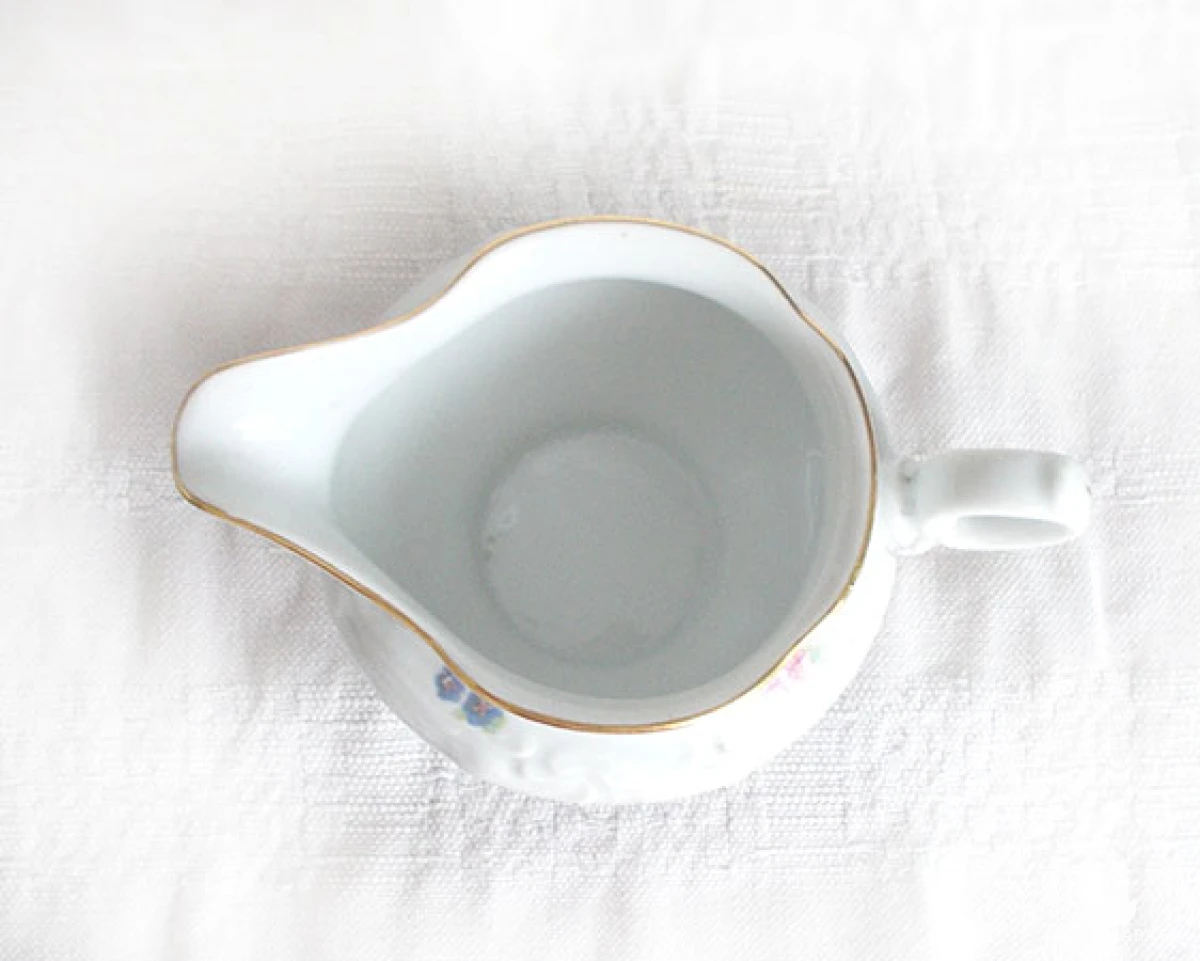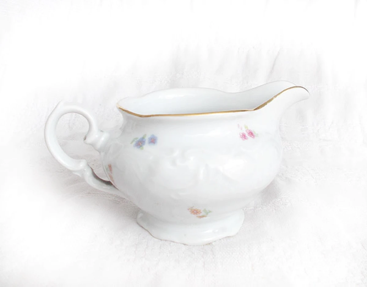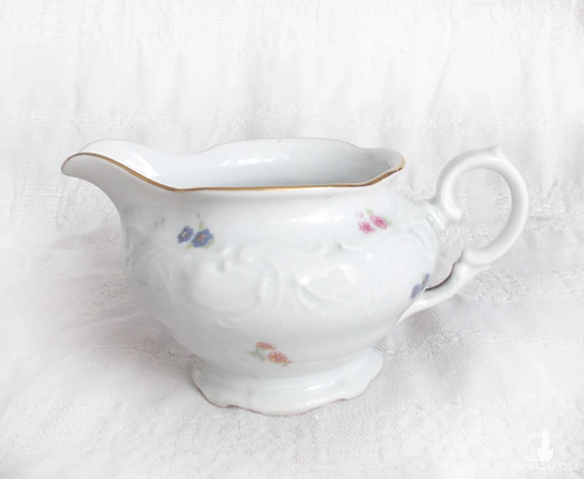 Oryginalny mlecznik - dzbanuszek na śmietankę lub mleko do kawy, herbaty itp. Retro przedmiot z czasów PRL XX w. Wymiary: szerokość 15 cm, wysokość 8 cm, średnica 8 cm. Naczynie sprawdzi się we wnętrzach urządzonych w stylu klasycznym, rustykalnym, tradycyjnym.