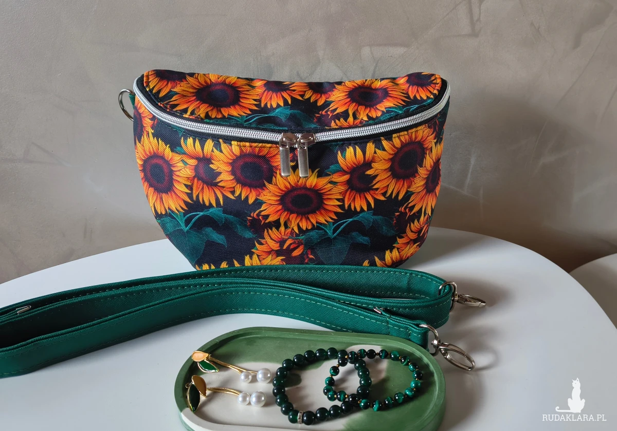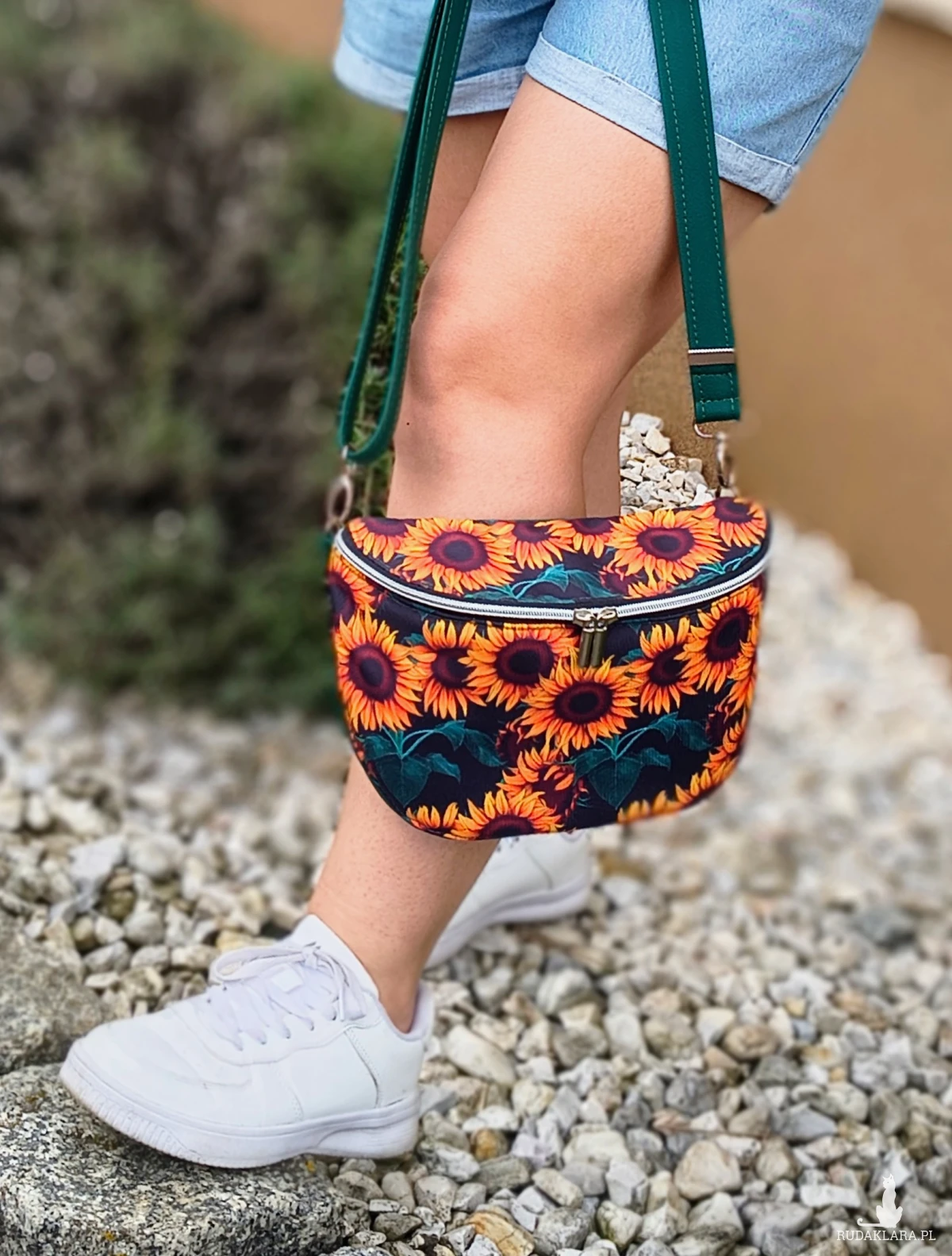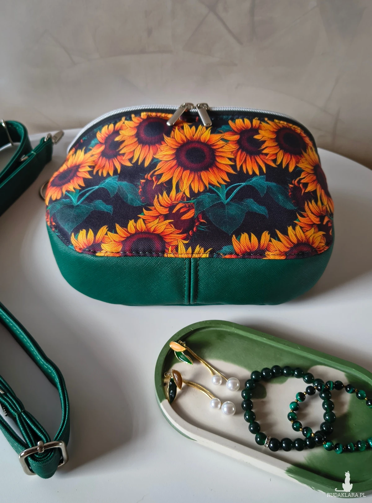 Torebka wykonana z ekoskóry w kolorze butelkowa zieleń oraz poliestru wodoodpornego w słoneczniki. Wewnątrz znajduje się wodoodporna podszewka z kieszonką na zamek. Pasek wykonany z ekoskóry, regulowany.