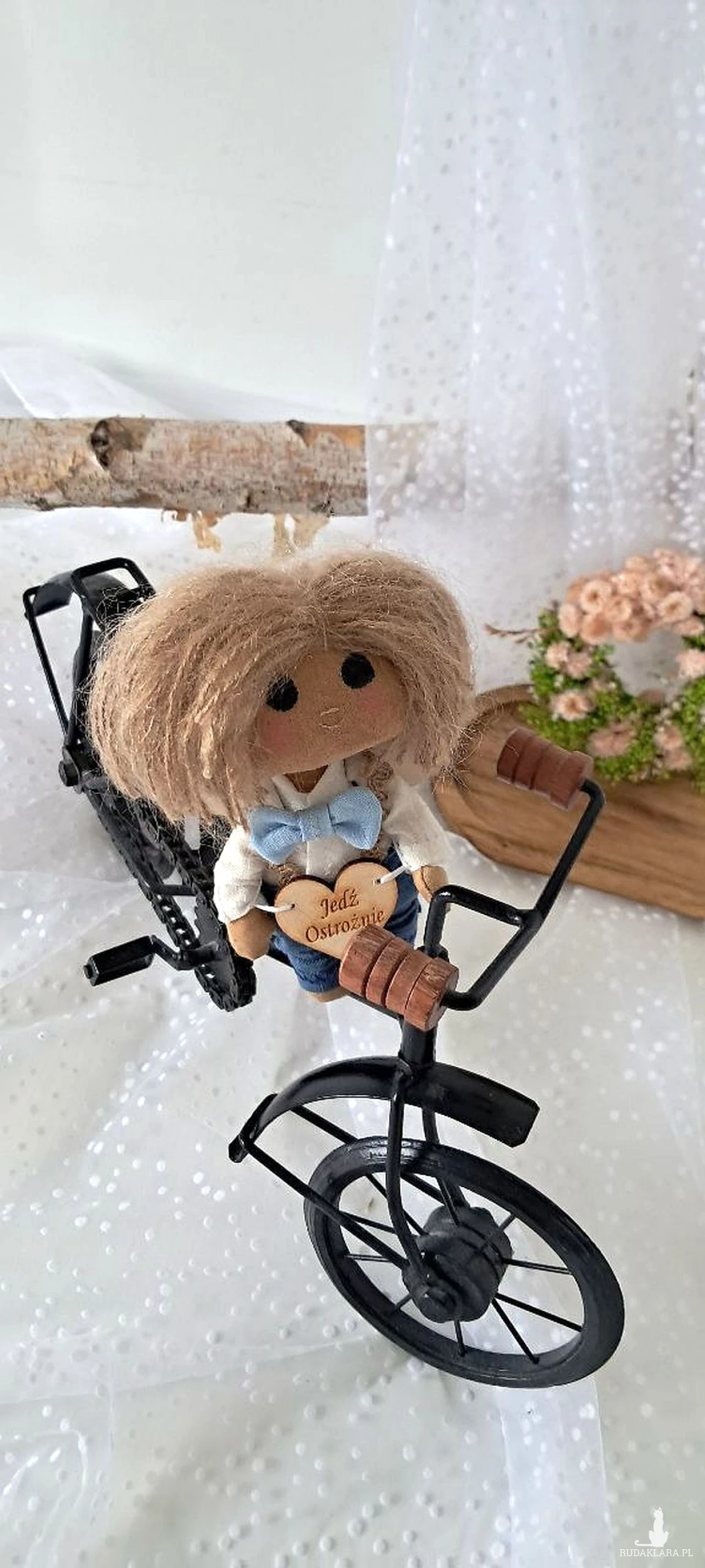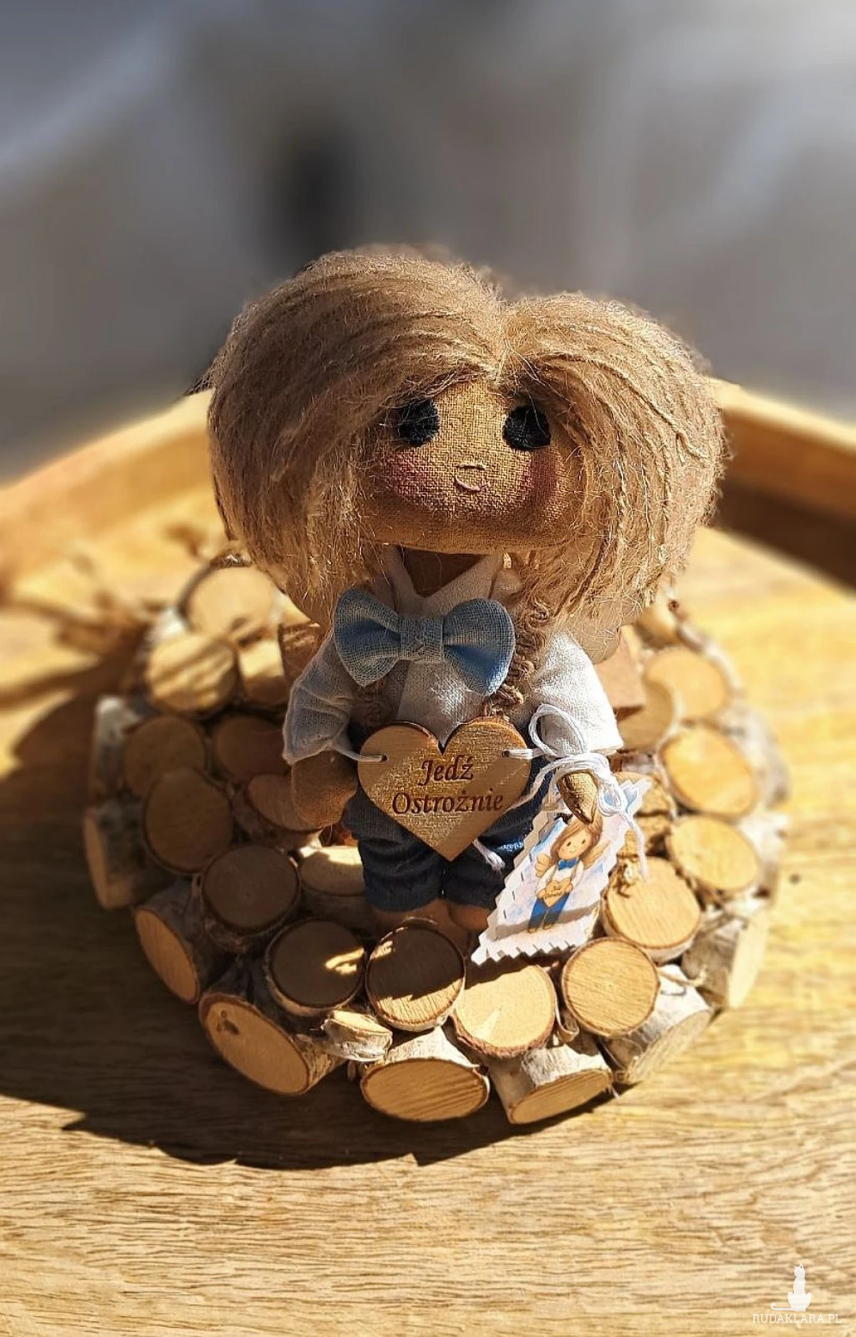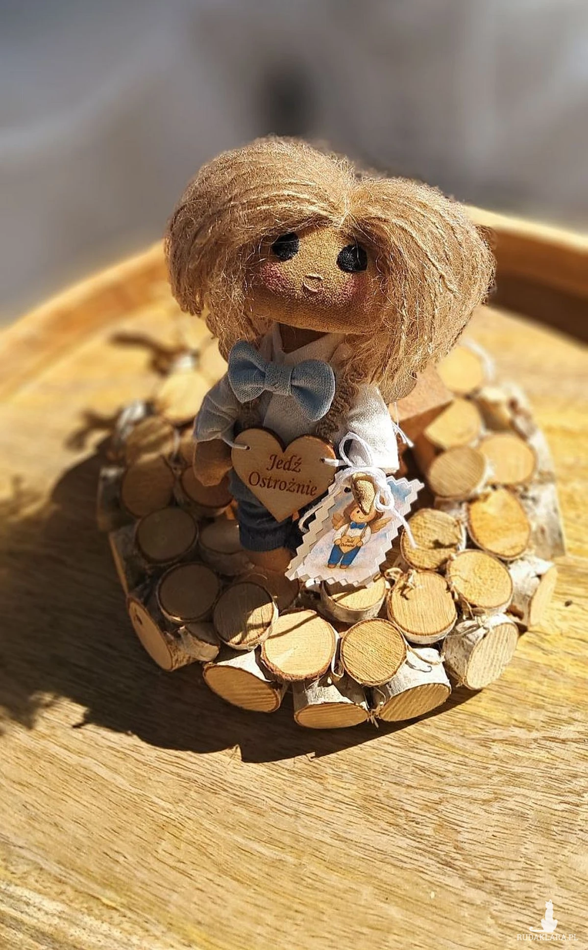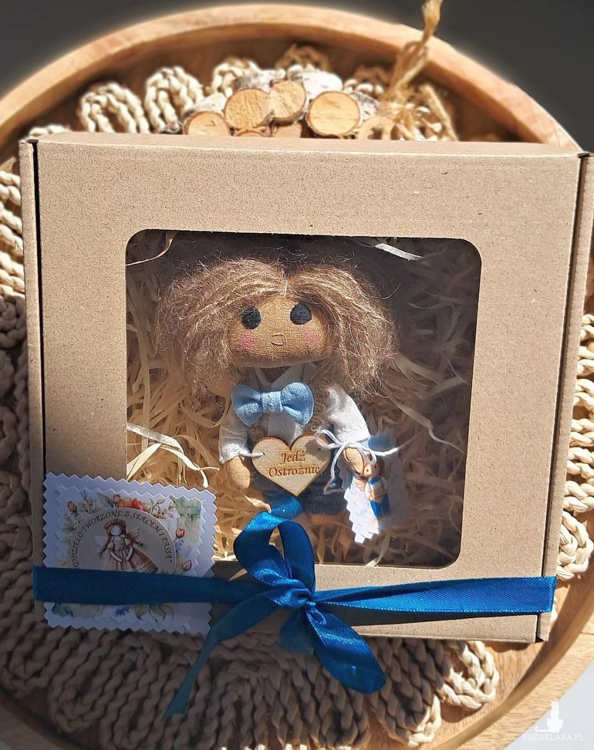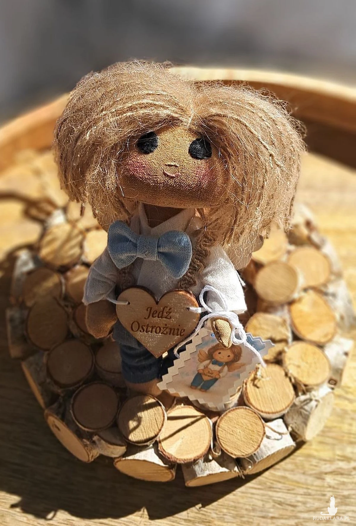 Mam do sprzedania aniołka widocznego na załączonych fotografiach. Ciałko uszyte z surówki bawełnianej, barwione kawą, wypełnione antyalergiczną kulką silikonową. Koszula koloru białego uszyta z lnu, spodenki koloru niebieskiego lniane, na szyi lniana mucha również koloru niebieskiego. Włosy wełniane kolor brązowego. Skrzydełka ze sklejki drewnianej. Buźka wyszyta nićmi. W rączkach posiada sklejkowe serce z napisem - Jedź ostrożnie. Wysokość aniołka 14 cm.