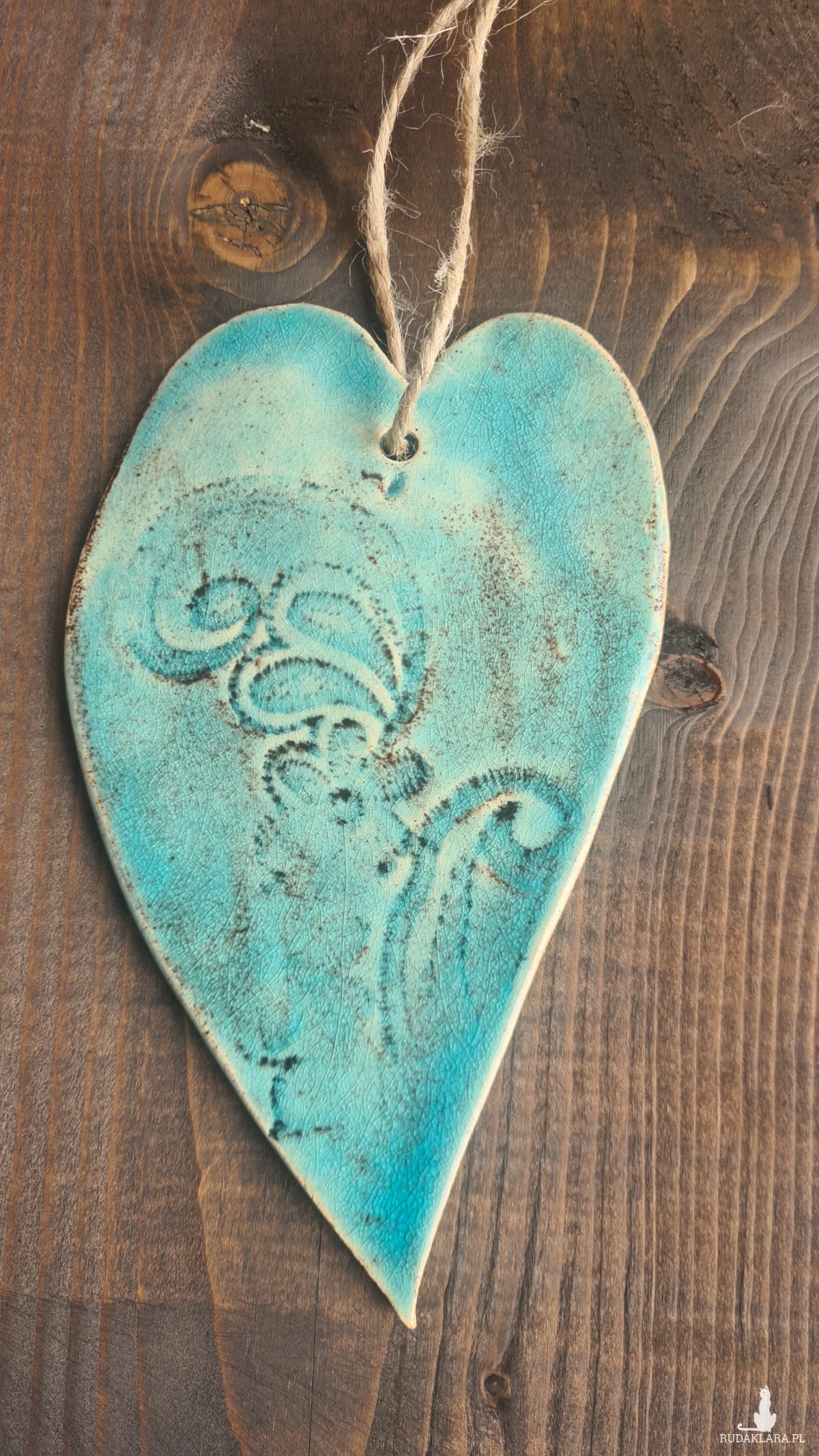 Serce ceramiczne - rękodzieło z motywem koronki będzie ozdobą Twojego domu. Wykonane z jasnej gliny, szkliwione pięknym turkusowym szkliwem. Wypalane dwukrotnie w wysokiej temperaturze w piecu ceramicznym. Wymiary 15 cm. Polecam :)