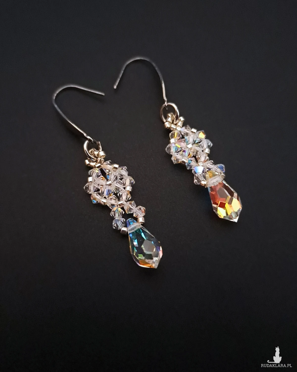 Każdy egzemplarz powstaje ręcznie – z precyzyjnie dobranych kryształków Preciosa Crystal AB i koralików Miyuki Delica w srebrnym odcieniu.