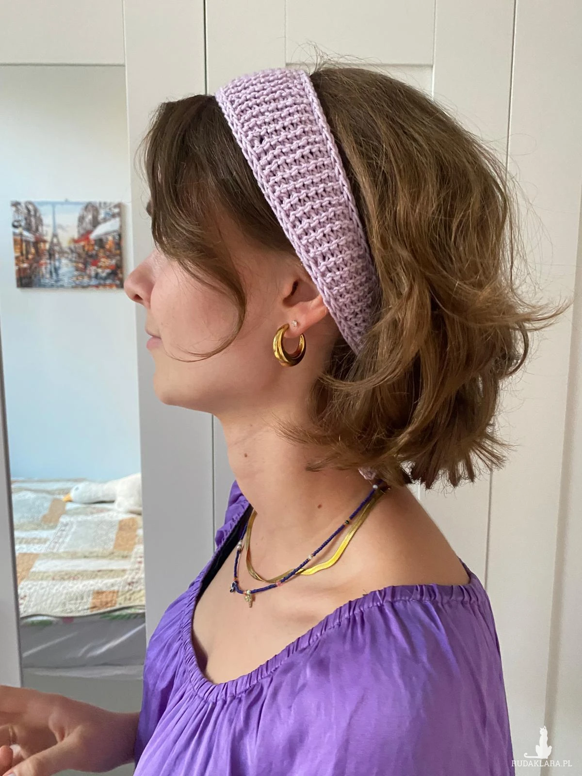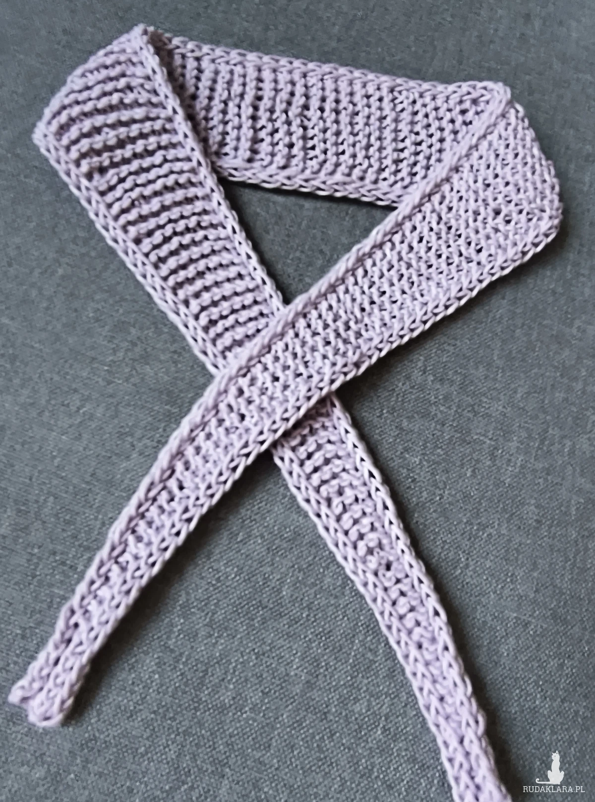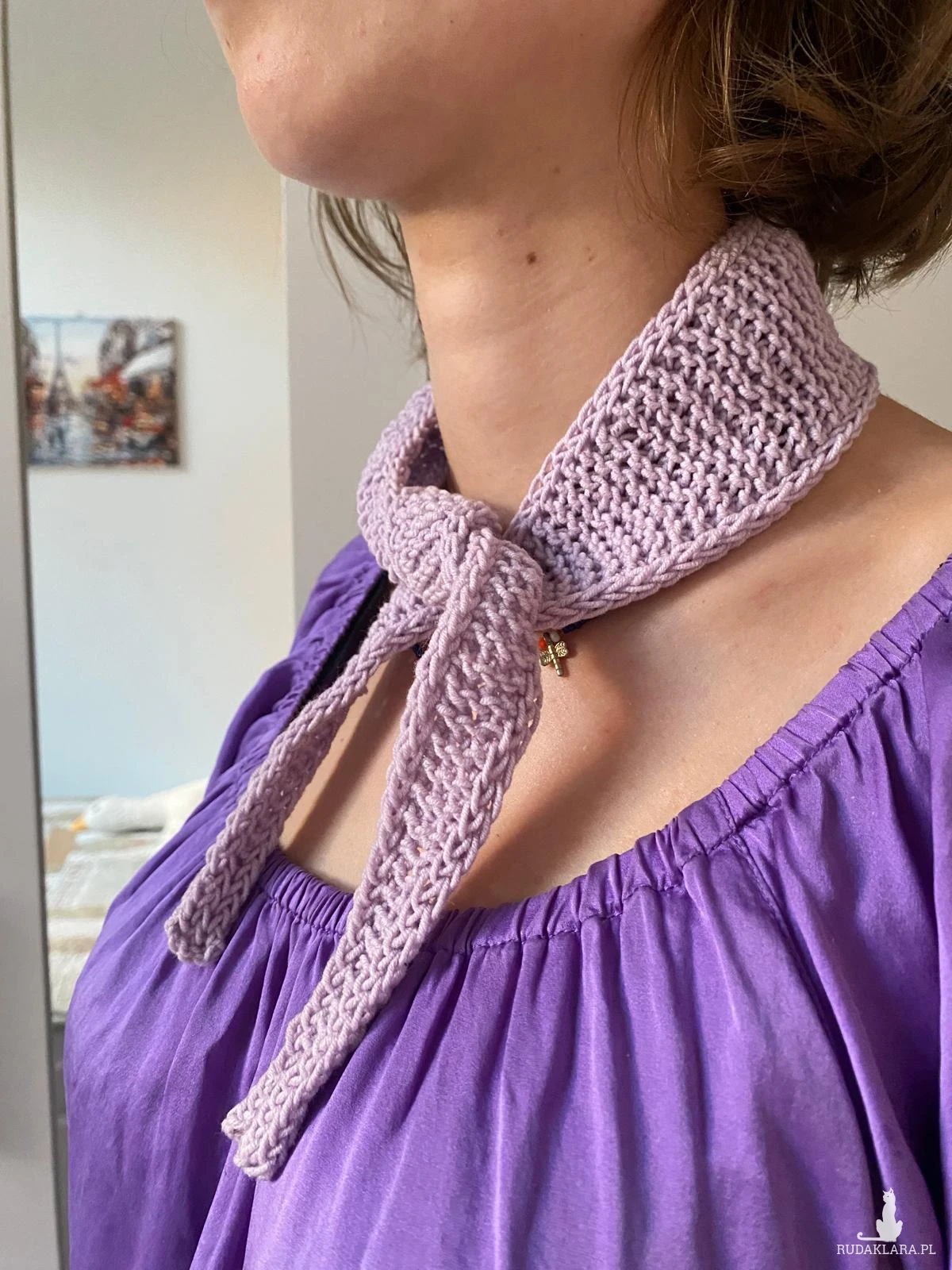 Apaszka robiona na szydełku. Miły akcent do każdej stylizacji. Można również wiązać jako przepaskę do włosów. Jasny wrzos.