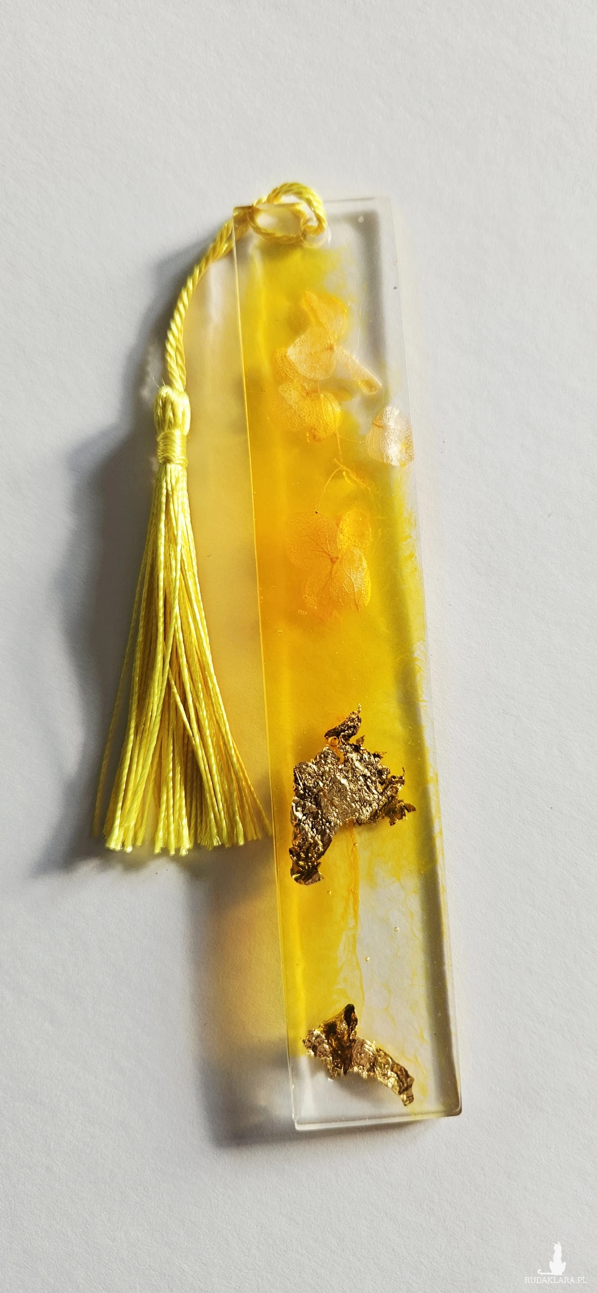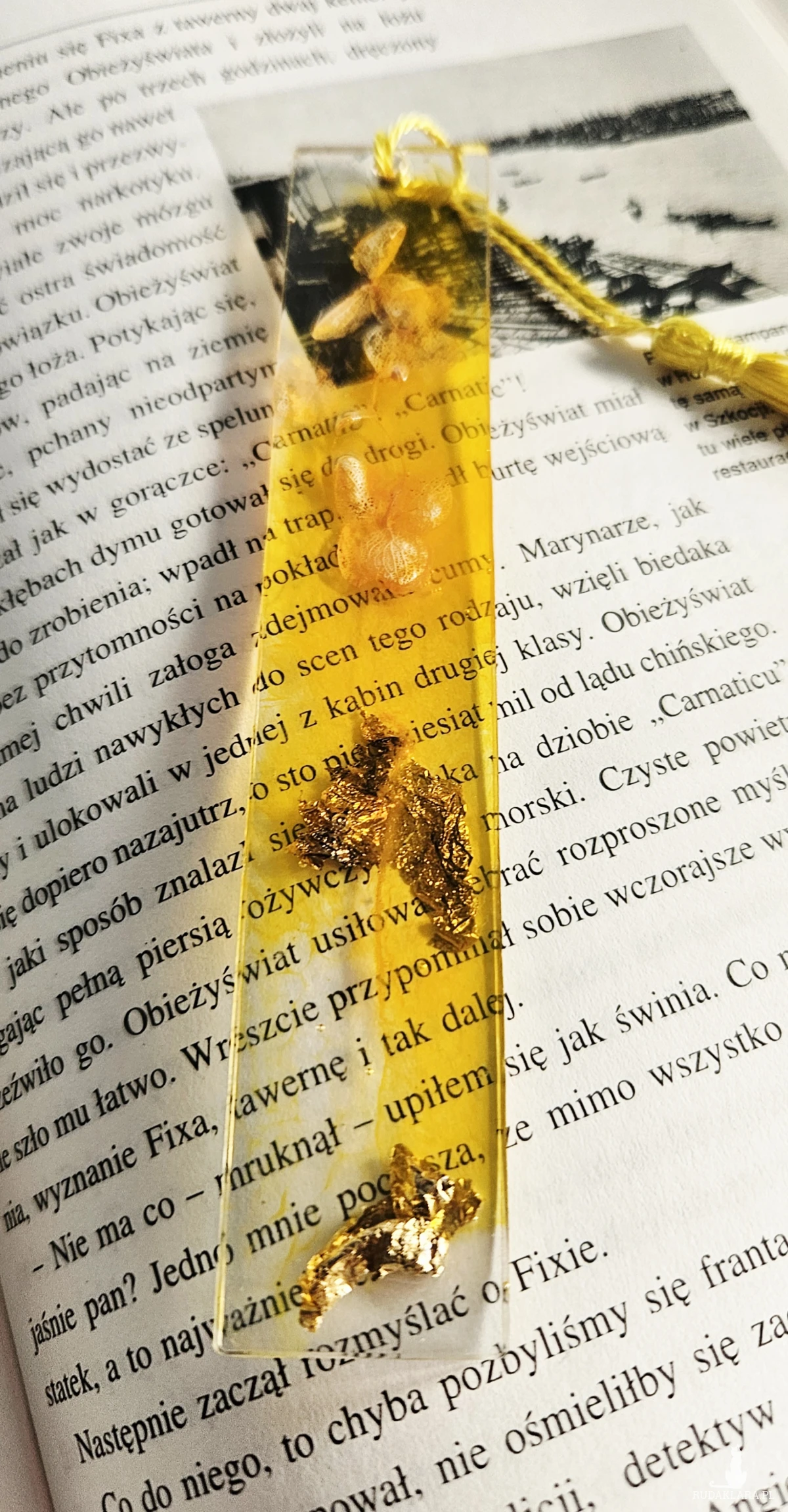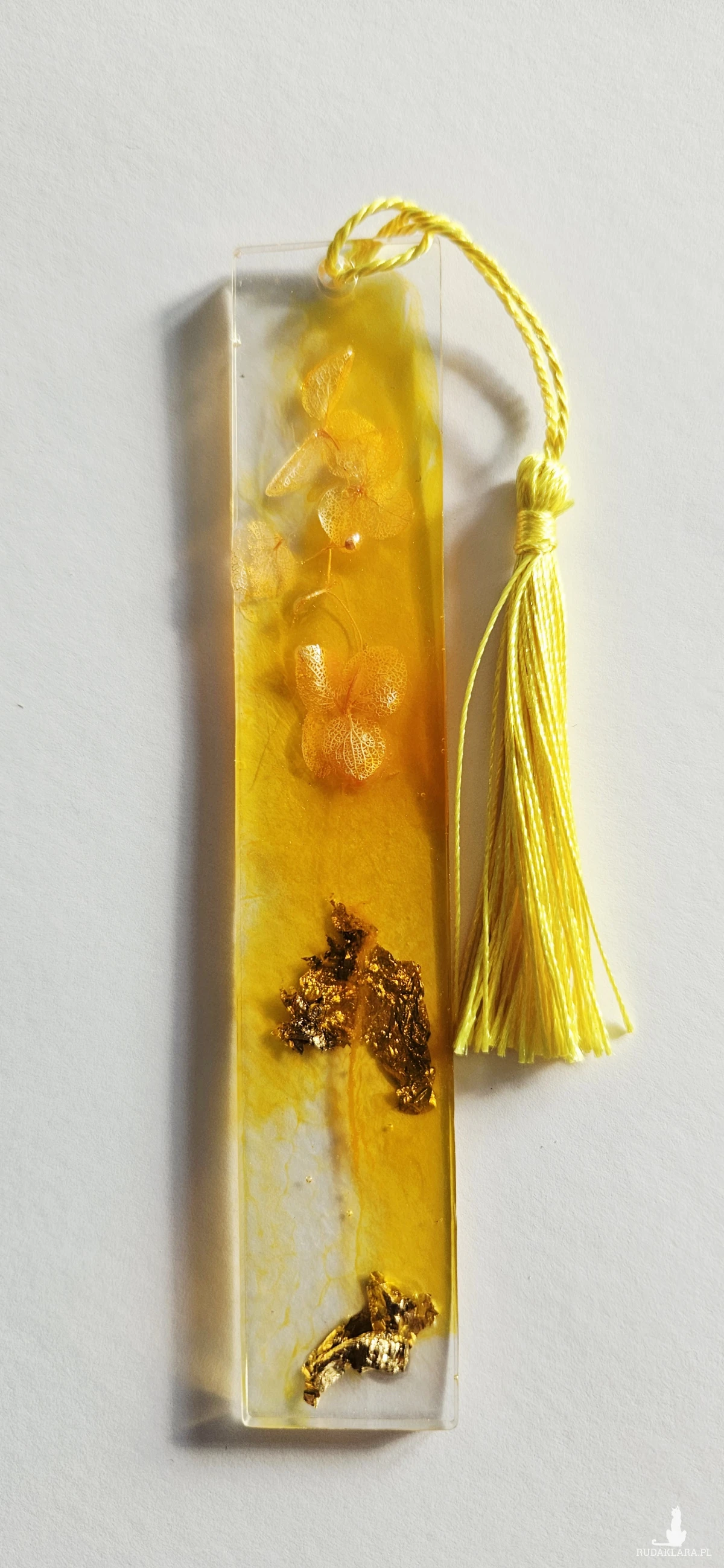 Zakładka z żywicy epoksydowej bursztynowa z płatkami hortensji s10