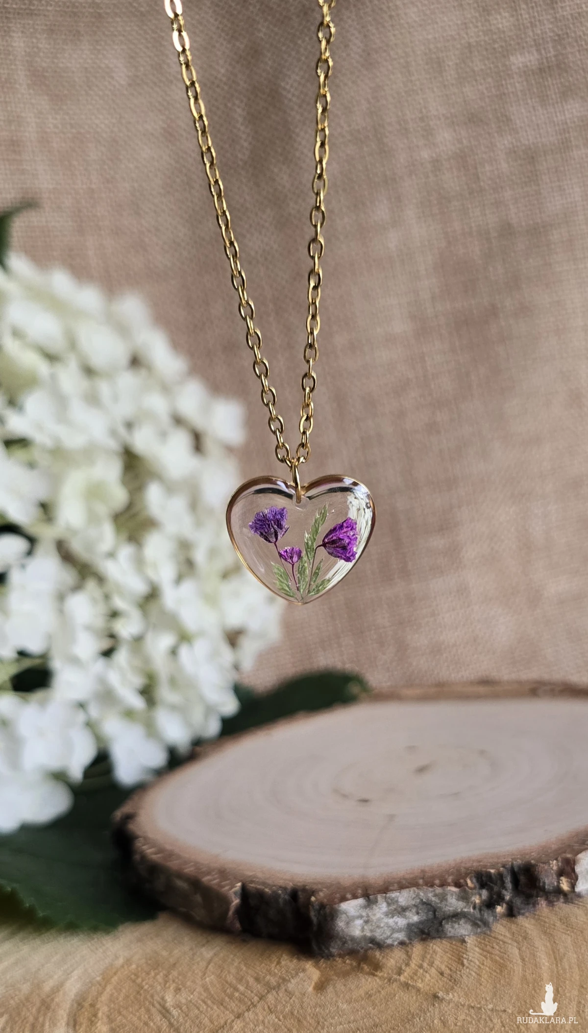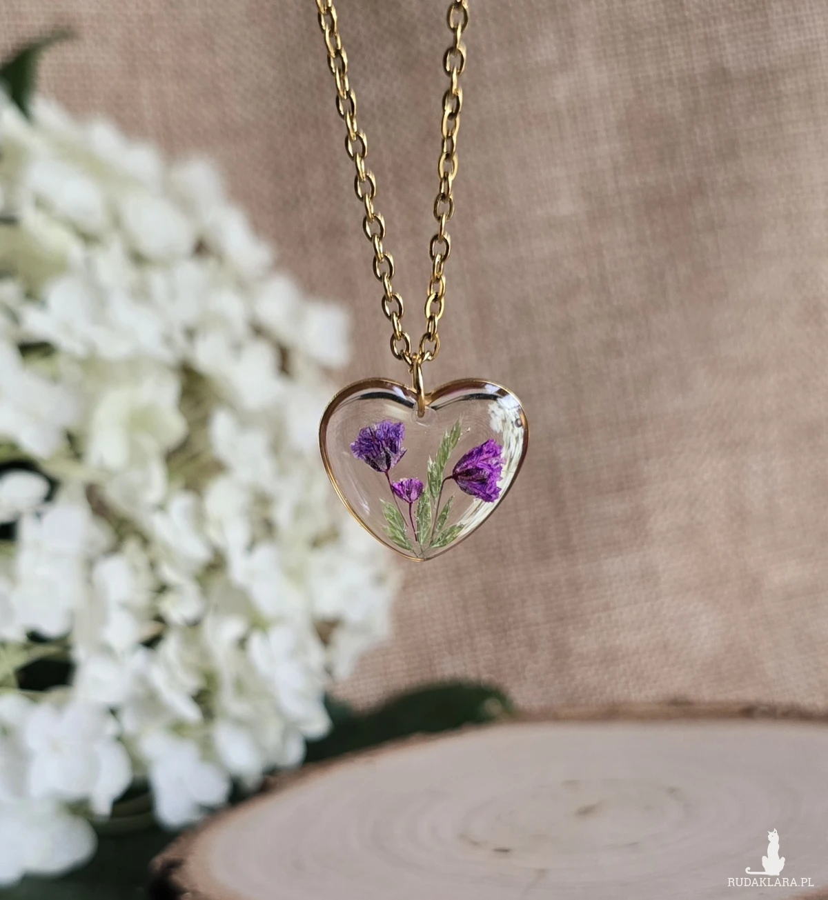 Złota zawieszka złoty wisiorek kwiat naszyjnik żywica z żywicy kwiaty serce serduszko prawdziwe suszone kwiaty fioletowe