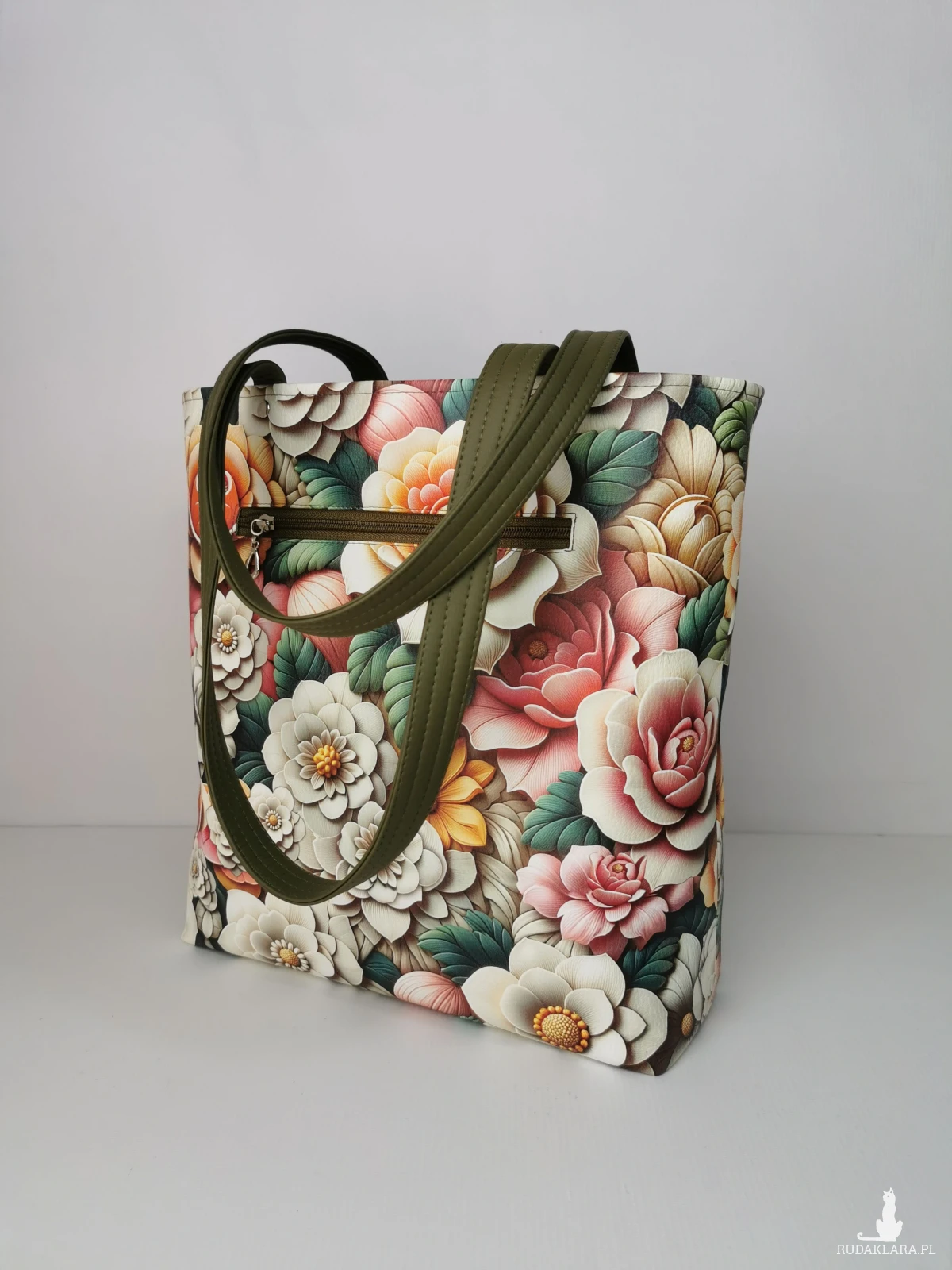 Torebka typu shopper bag duża , pakowna . Idealna na co dzień , na spacer , na zakupy , do pracy lub na wyjazd . Została wykonana z grubej wzorzystej ekoskóry kaletniczej . Jest zamykana na zamek . Na tylnej ścianie torebki pojemna kieszeń zamykana na zamek . Podszewka z tkaniny poliestrowej wodoodpornej w kolorze zielonym . Wewnątrz znajdziesz trzy pojemne kieszenie , w tym jedna na zamek . Jest też zamontowana smycz z karabińczykiem na klucze . Uchwyty torebki wzmocnione nitami .