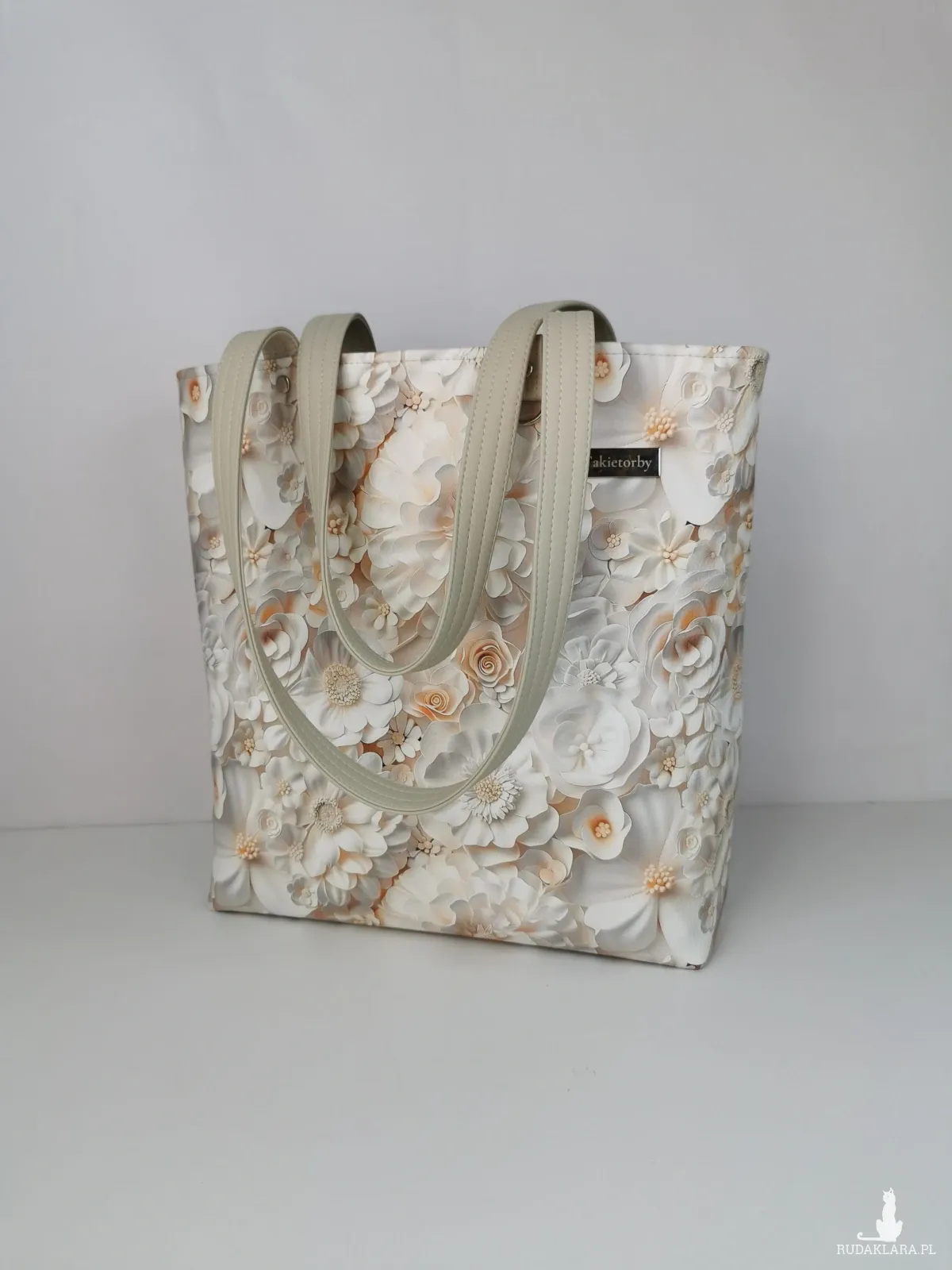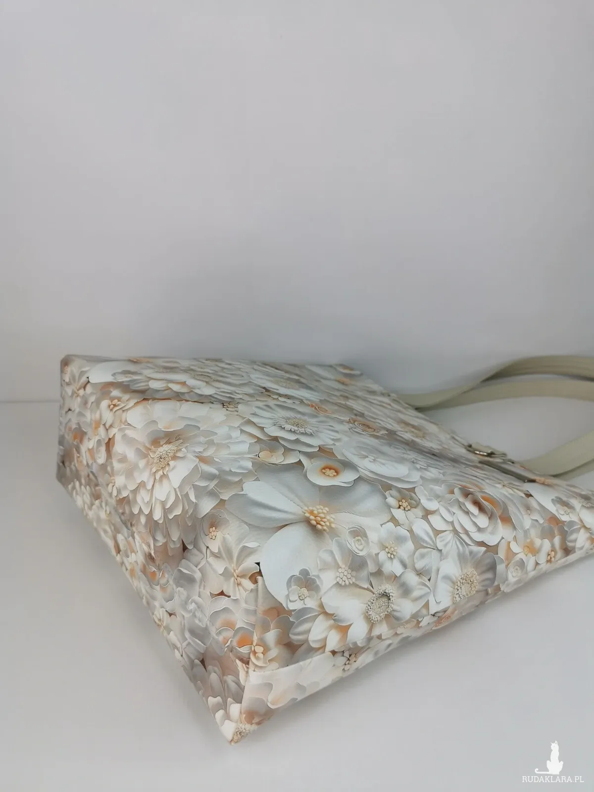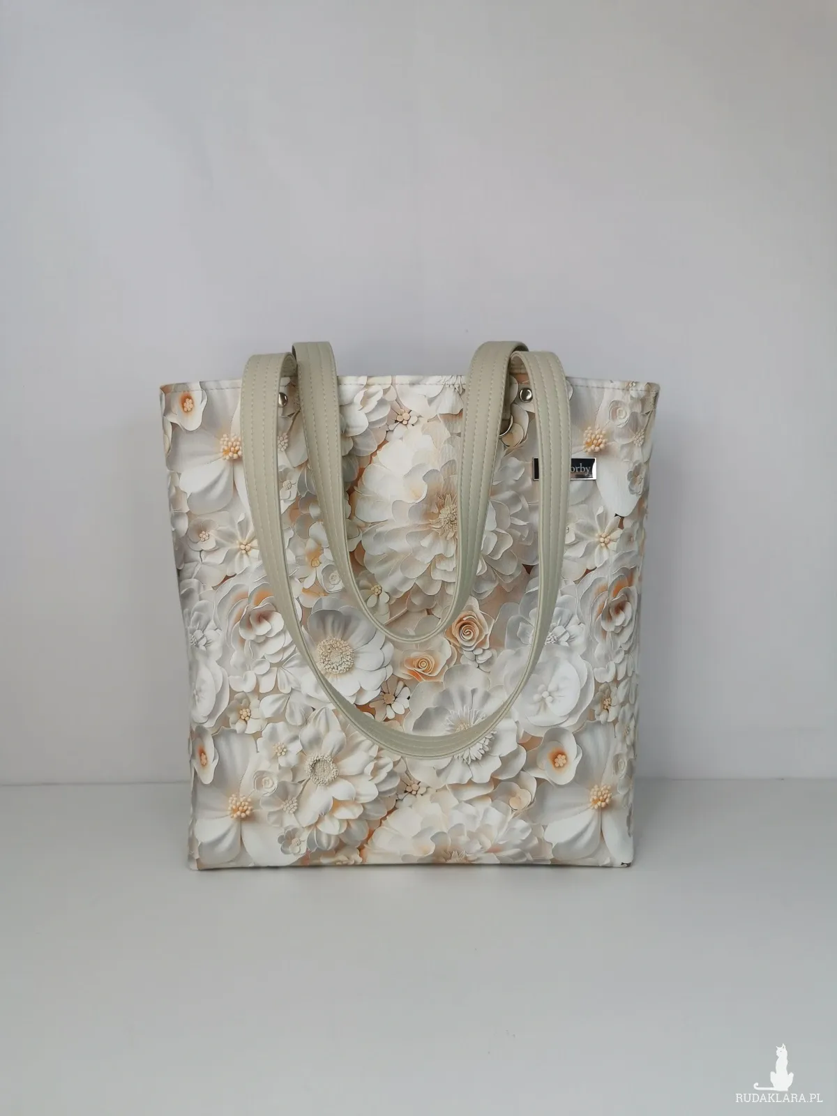 Torebka typu shopper bag duża , pakowna . Idealna na co dzień , na spacer , na zakupy , do pracy lub na wyjazd . Została wykonana z grubej wzorzystej ekoskóry kaletniczej . Jest zamykana na zamek . Podszewka z tkaniny poliestrowej wodoodpornej w kolorze jasno bezowym . Wewnątrz znajdziesz trzy pojemne kieszenie , w tym jedna na zamek . Jest też zamontowana smycz z karabińczykiem na klucze . Uchwyty torebki wzmocnione nitami .