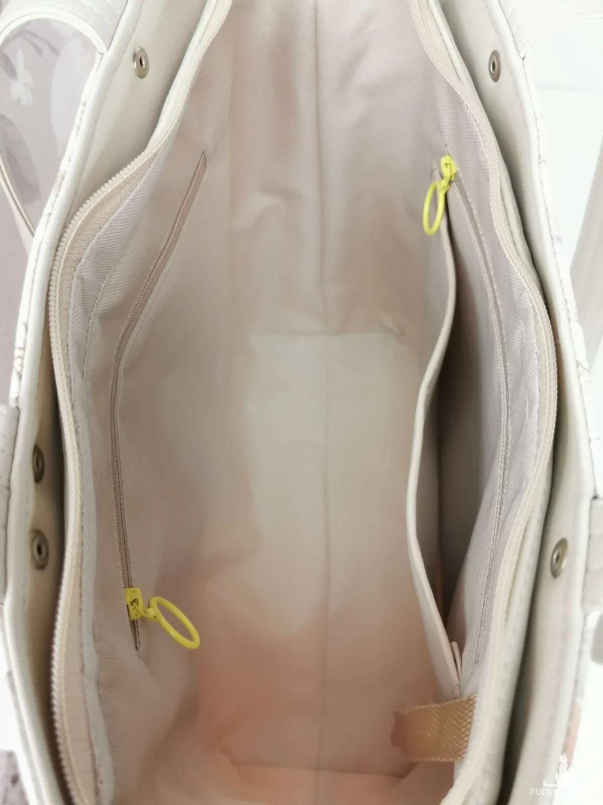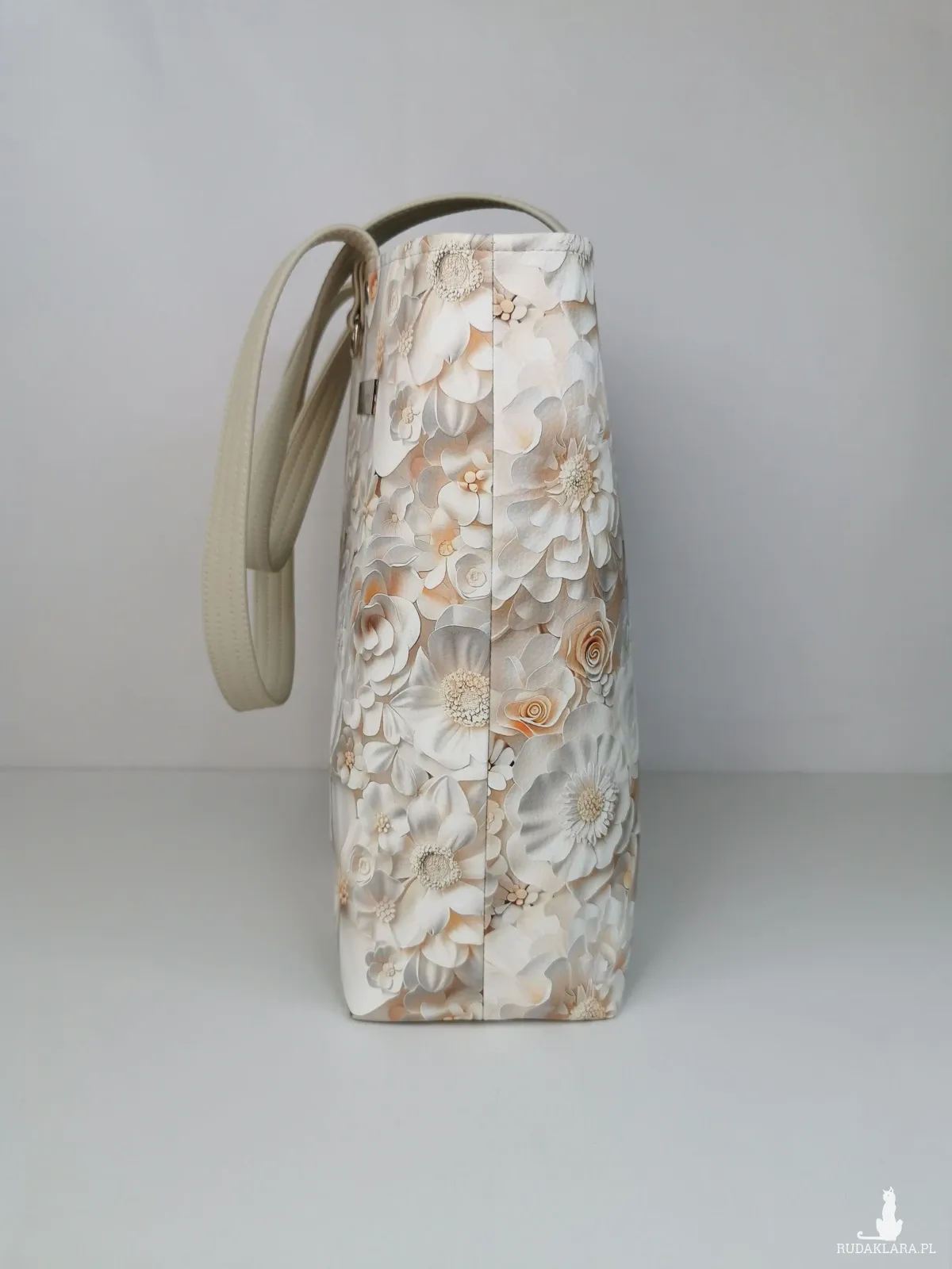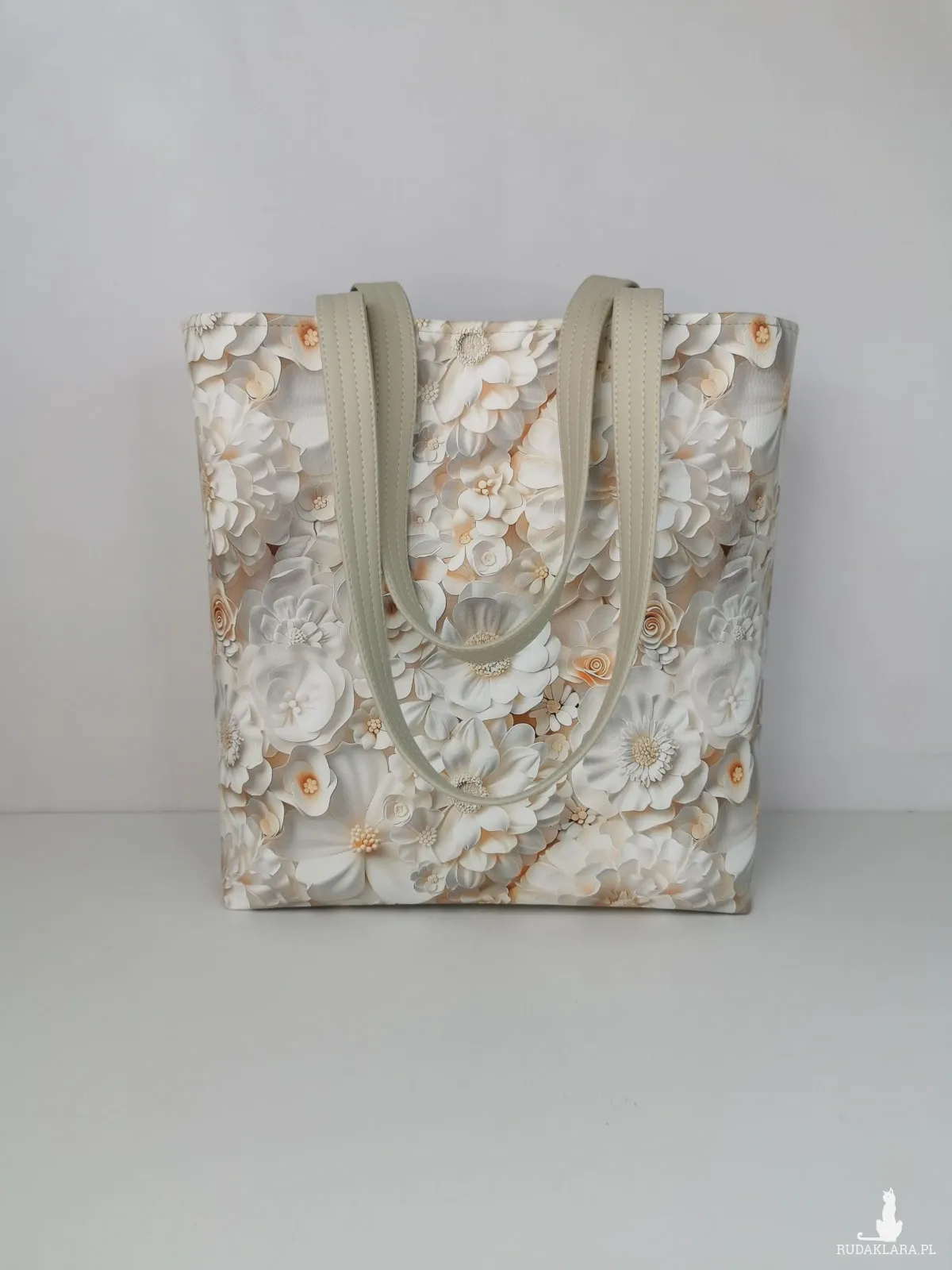 Torebka typu shopper bag duża , pakowna . Idealna na co dzień , na spacer , na zakupy , do pracy lub na wyjazd . Została wykonana z grubej wzorzystej ekoskóry kaletniczej . Jest zamykana na zamek . Podszewka z tkaniny poliestrowej wodoodpornej w kolorze jasno bezowym . Wewnątrz znajdziesz trzy pojemne kieszenie , w tym jedna na zamek . Jest też zamontowana smycz z karabińczykiem na klucze . Uchwyty torebki wzmocnione nitami .