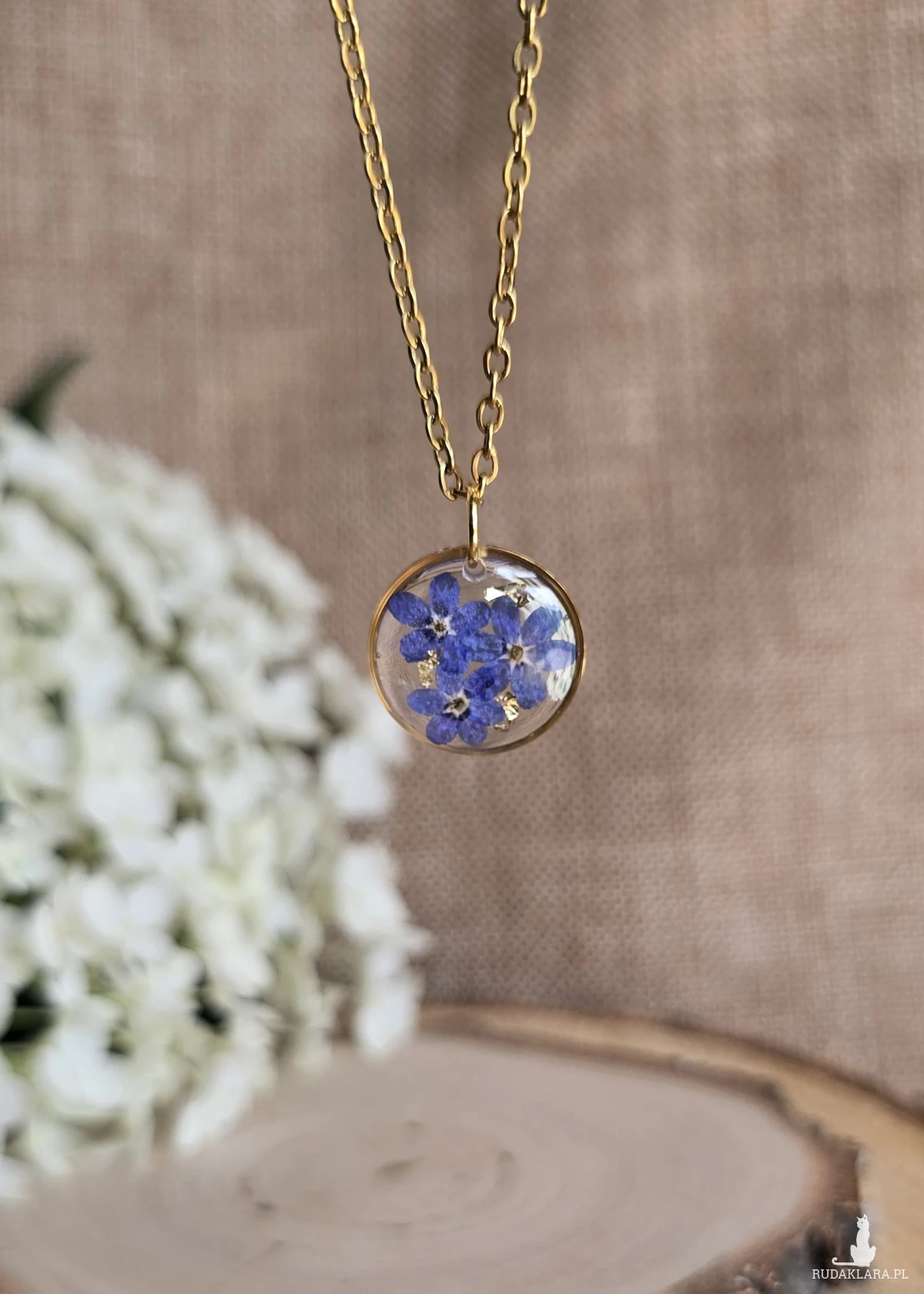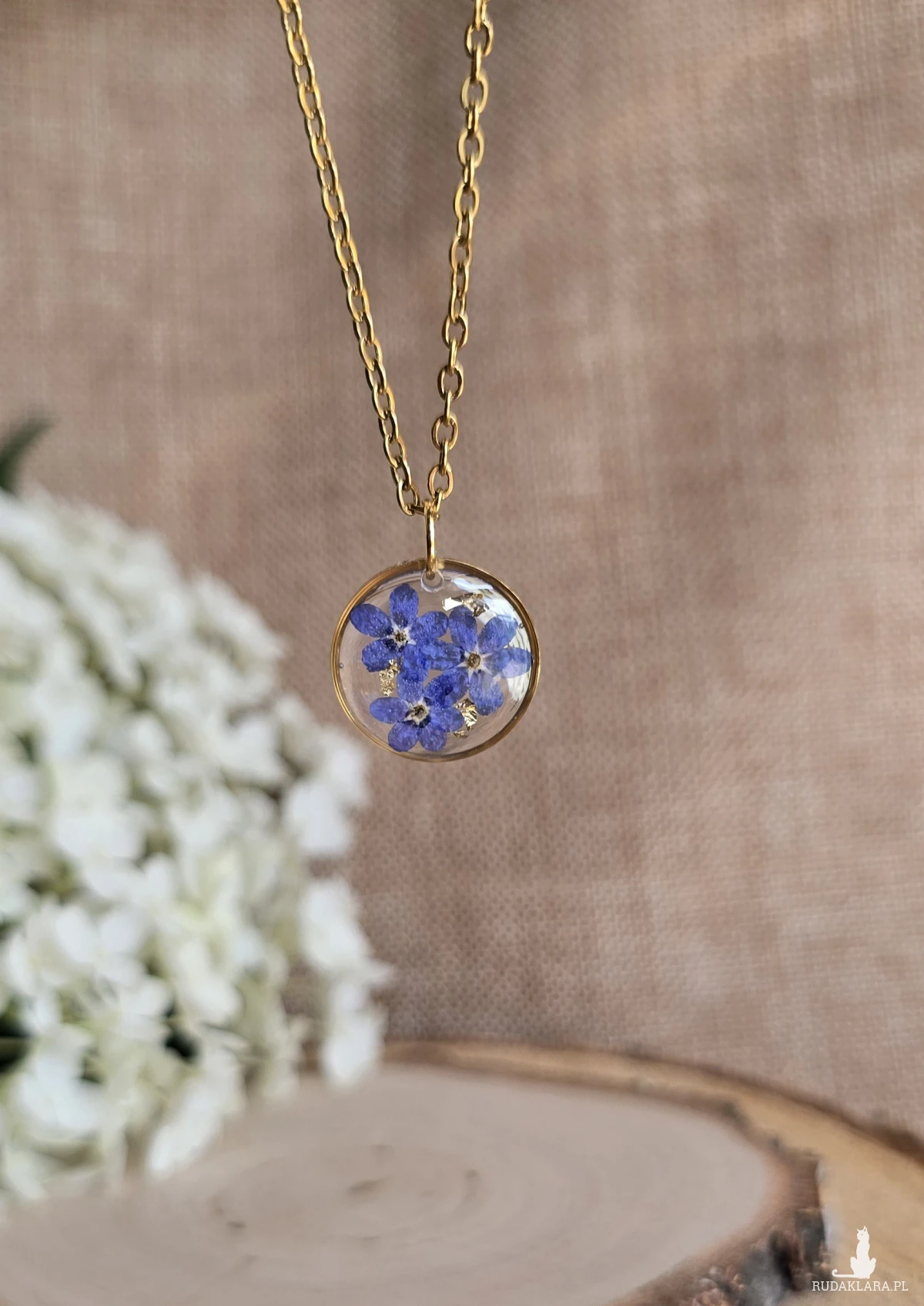 Niezapominajki złota zawieszka złoty wisiorek naszyjnik żywica z żywicy kwiaty z kwiatami retro naturalna dziewczęca kobieca niezapominajkami