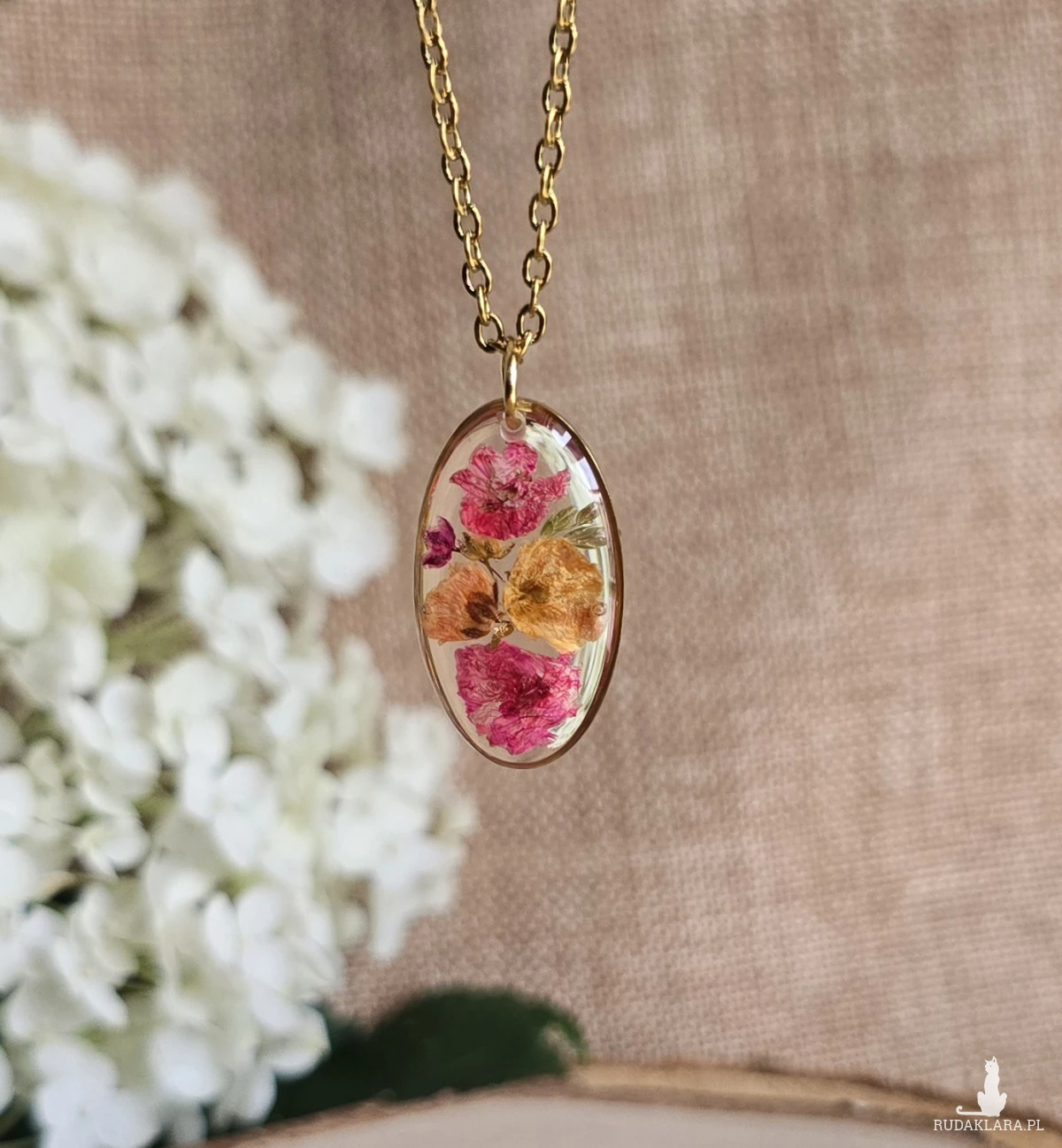 Oferuję Państwu unikalną biżuterię. Zawieszka jest wykonana z suszonych kwiatów i żywicy epoksydowej. Biżuteria jest wspaniałym i oryginalnym prezentem na lata.