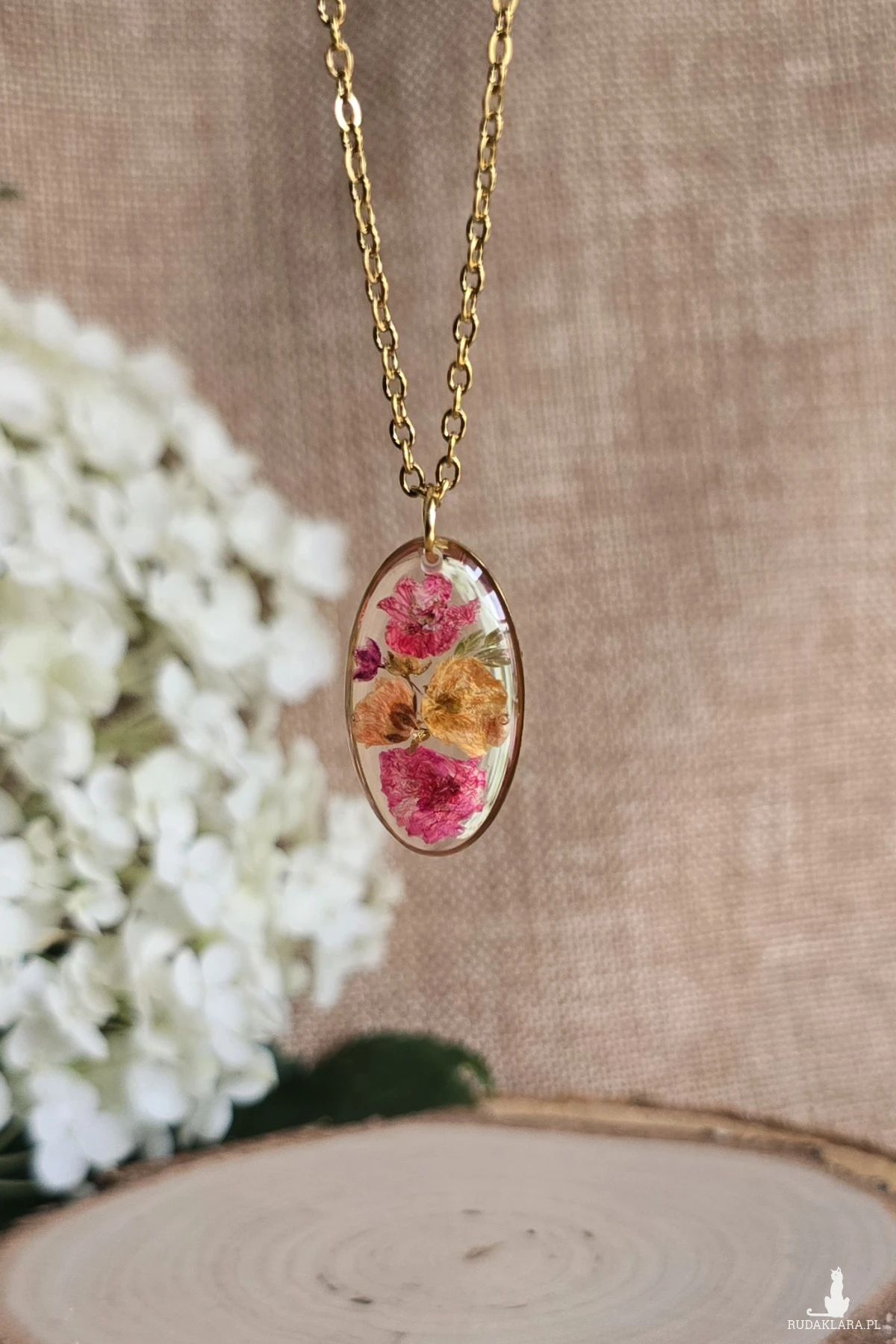 Złota zawieszka złoty wisiorek naszyjnik żywica z żywicy kwiaty z kwiatami jajowata retro naturalna delikatna dziewczęca kobieca kolorowa różowa