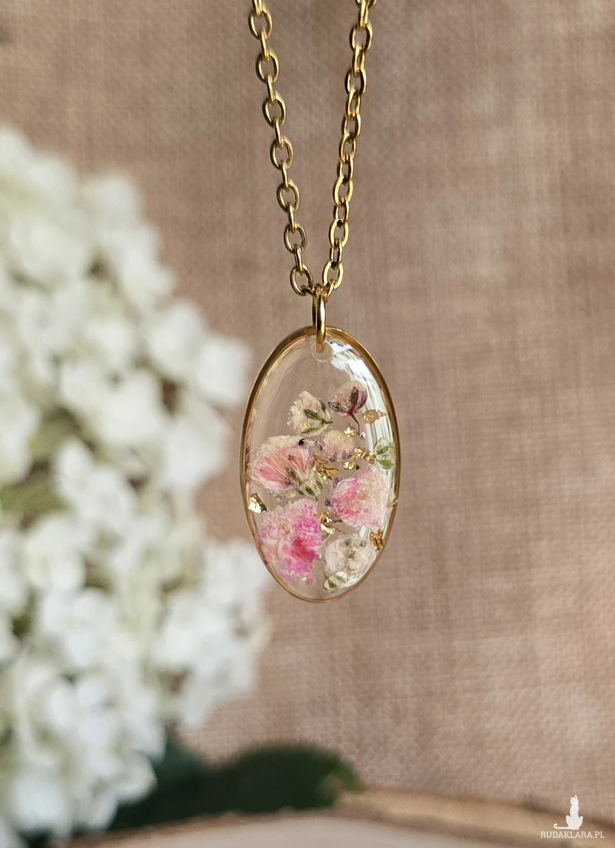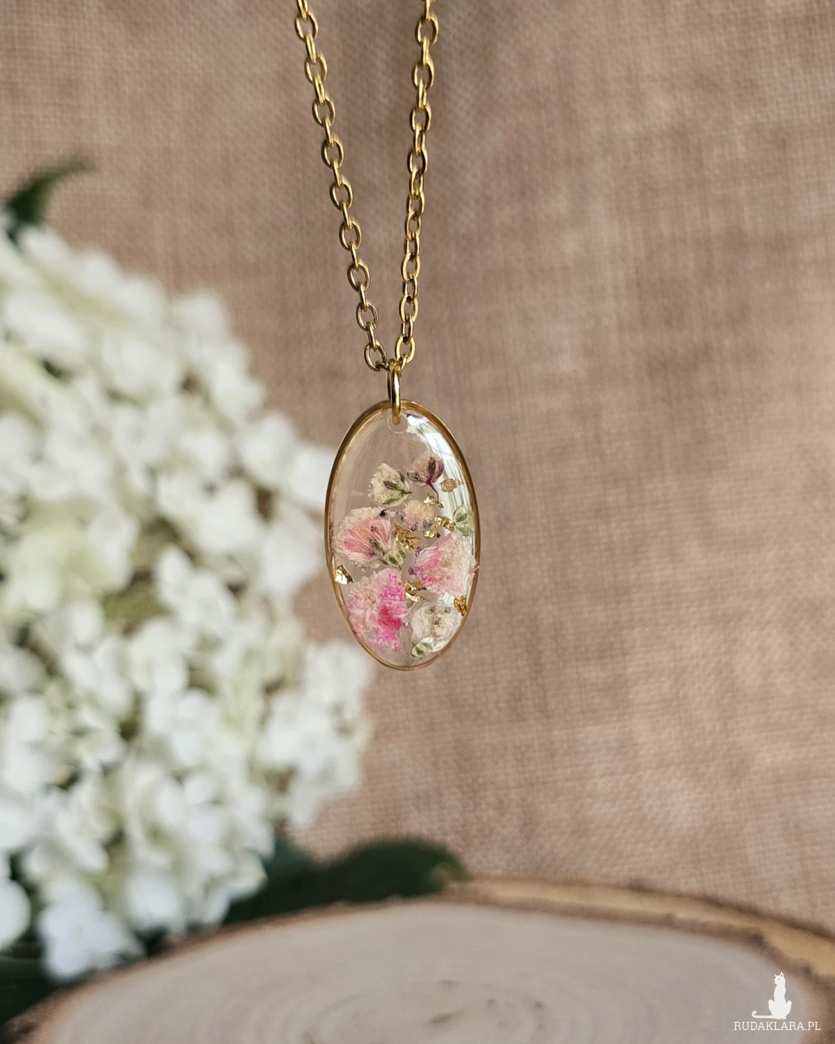 Oferuję Państwu unikalną biżuterię. Zawieszka jest wykonana z suszonych kwiatów i żywicy epoksydowej. Biżuteria jest wspaniałym i oryginalnym prezentem na lata.