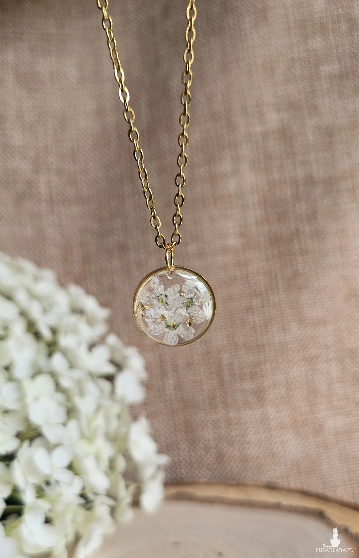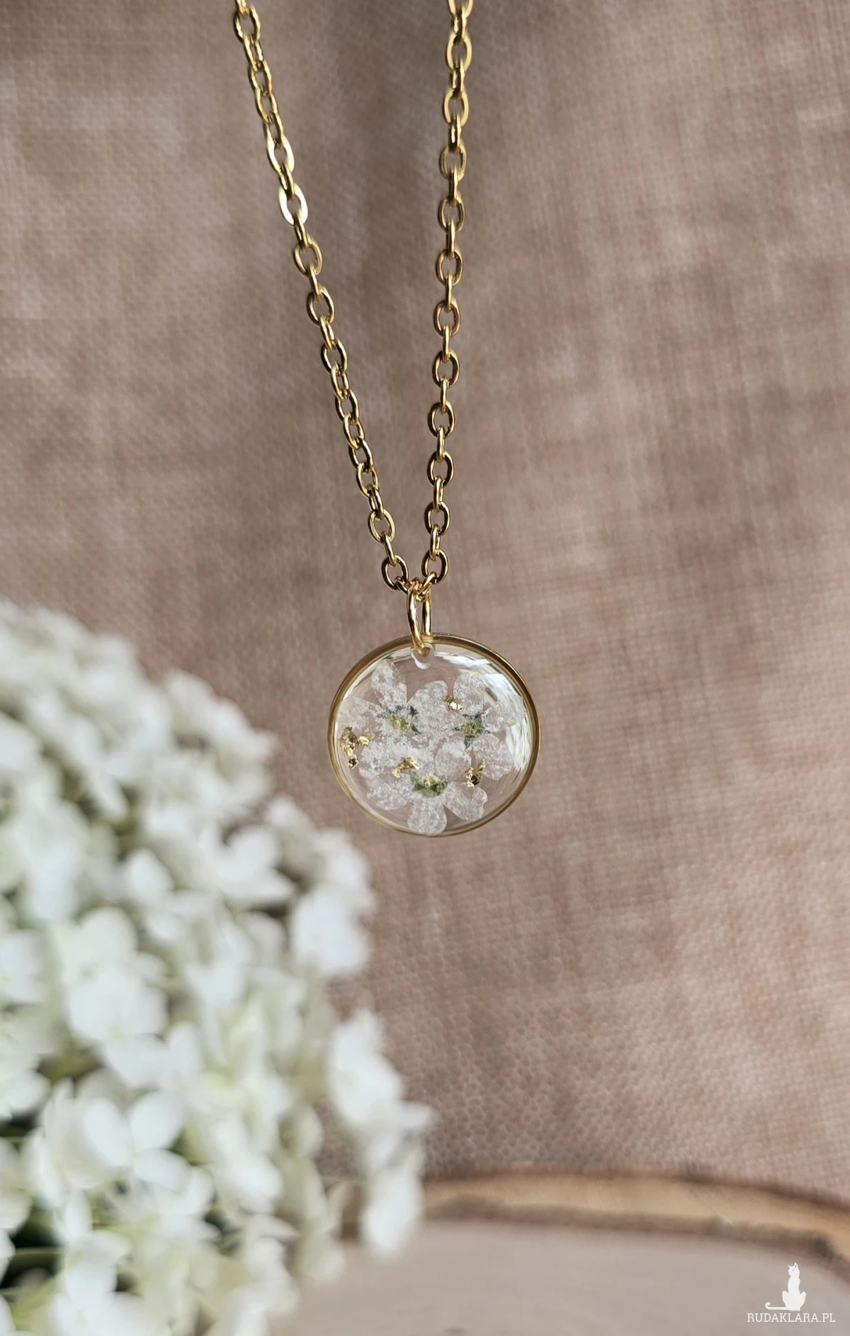 Oferuję Państwu unikalną biżuterię. Zawieszka jest wykonana z suszonych kwiatów i żywicy epoksydowej. Biżuteria jest wspaniałym i oryginalnym prezentem na lata.