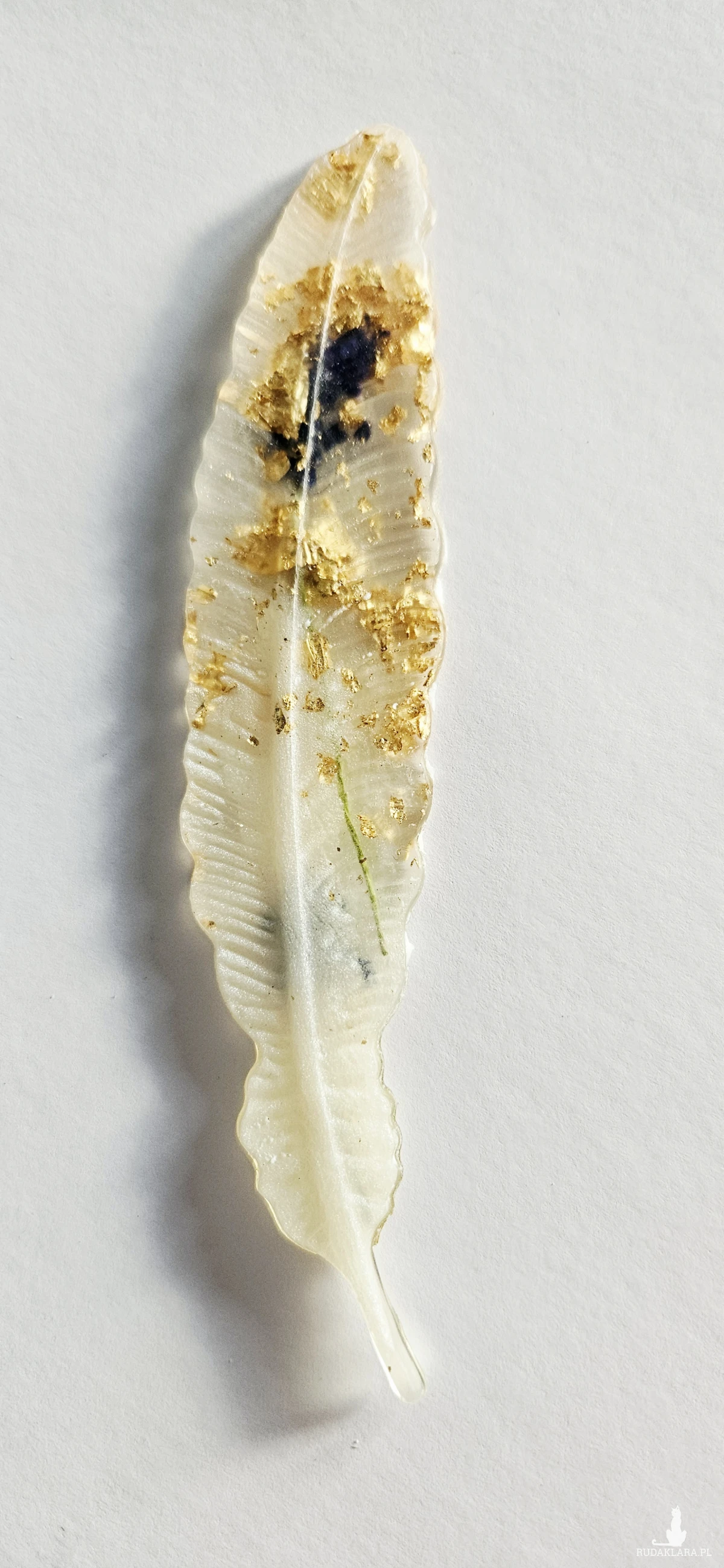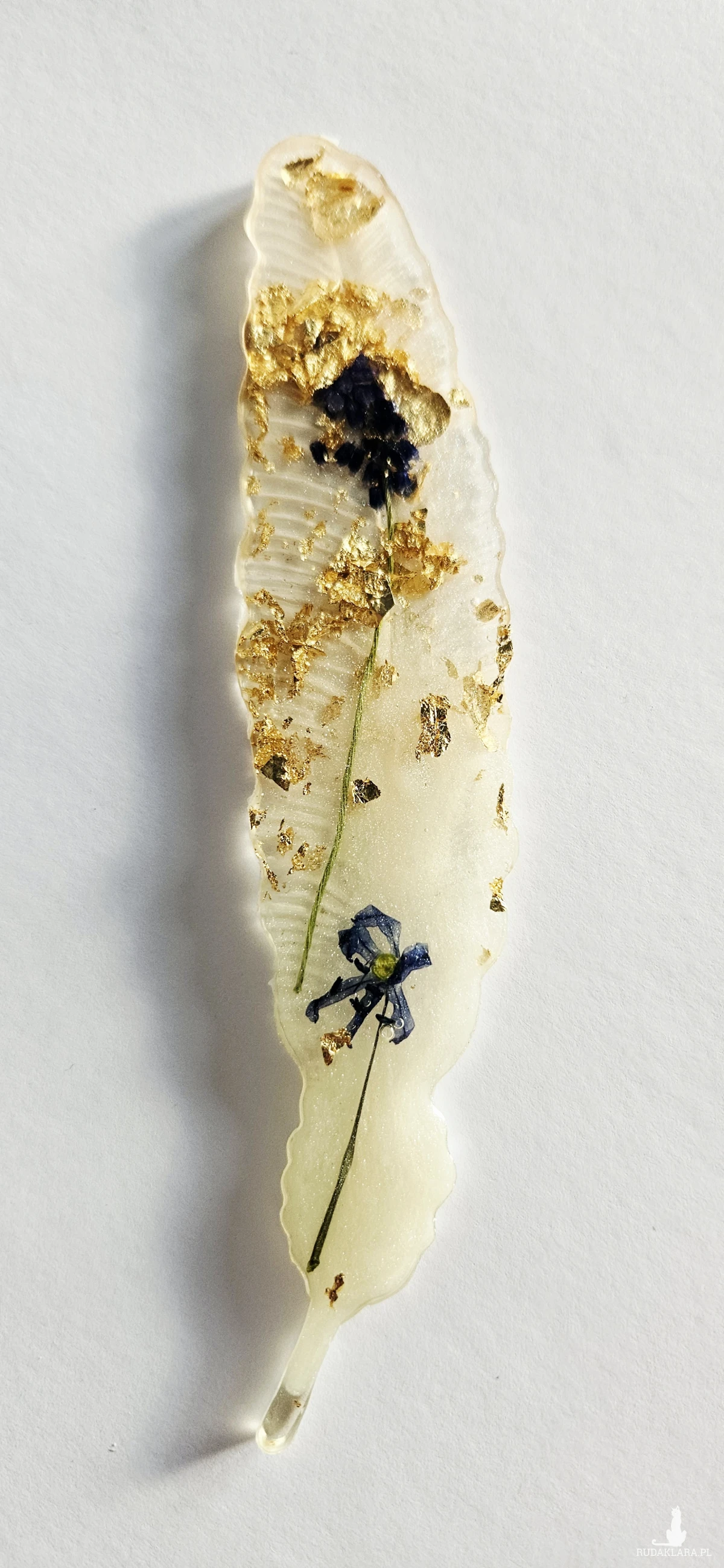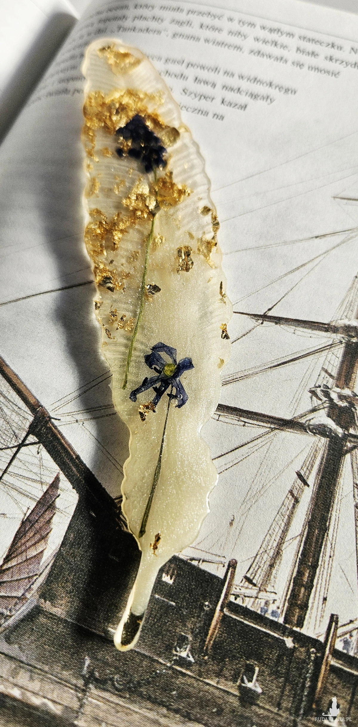 Zakładka z żywicy epoksydowej pióro z złotem fiołkiem i szafirkiem P02
