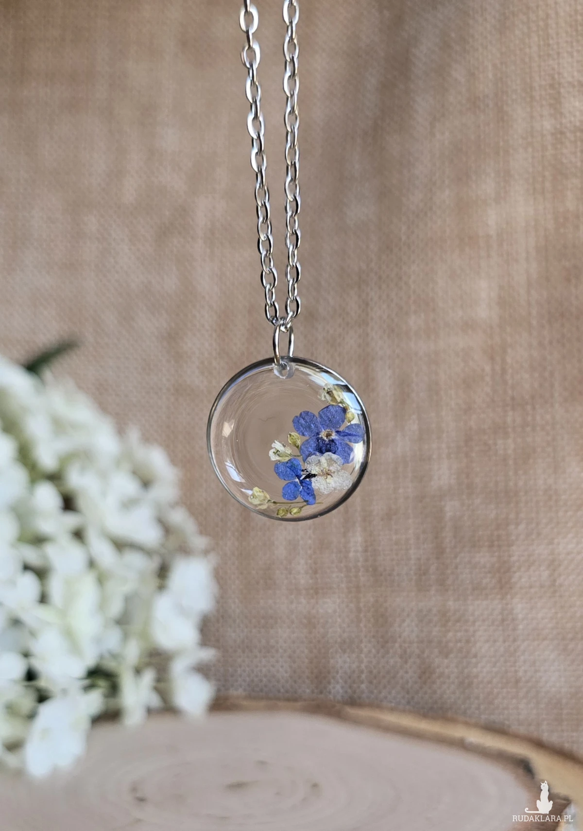 Oferuję Państwu unikalną biżuterię. Zawieszka jest wykonana z suszonych kwiatów i żywicy epoksydowej. Biżuteria jest wspaniałym i oryginalnym prezentem na lata.