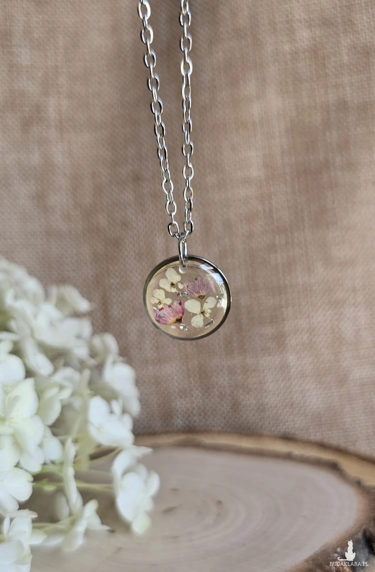 Oferuję Państwu unikalną biżuterię. Zawieszka jest wykonana z suszonych kwiatów i żywicy epoksydowej. Biżuteria jest wspaniałym i oryginalnym prezentem na lata.